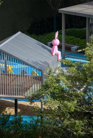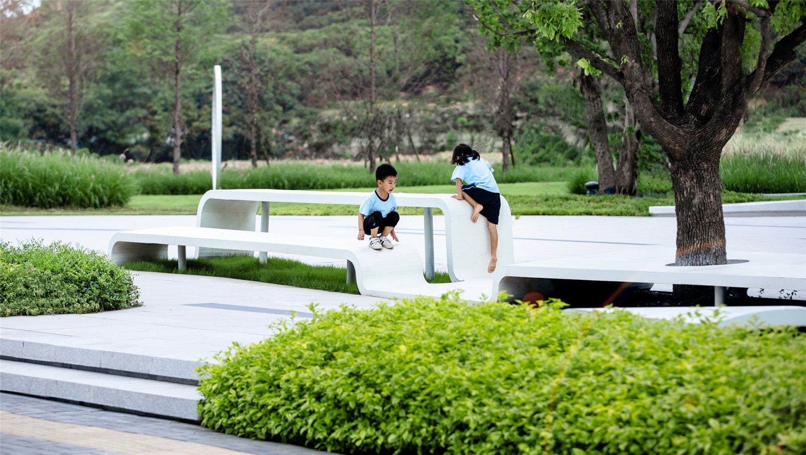 林下的藝術(shù)共享區(qū),最能展示項(xiàng)目生活與自然的和諧。白色弧形座椅與綠籬帶的布局,讓空曠無(wú)序的空間變得井然有序。