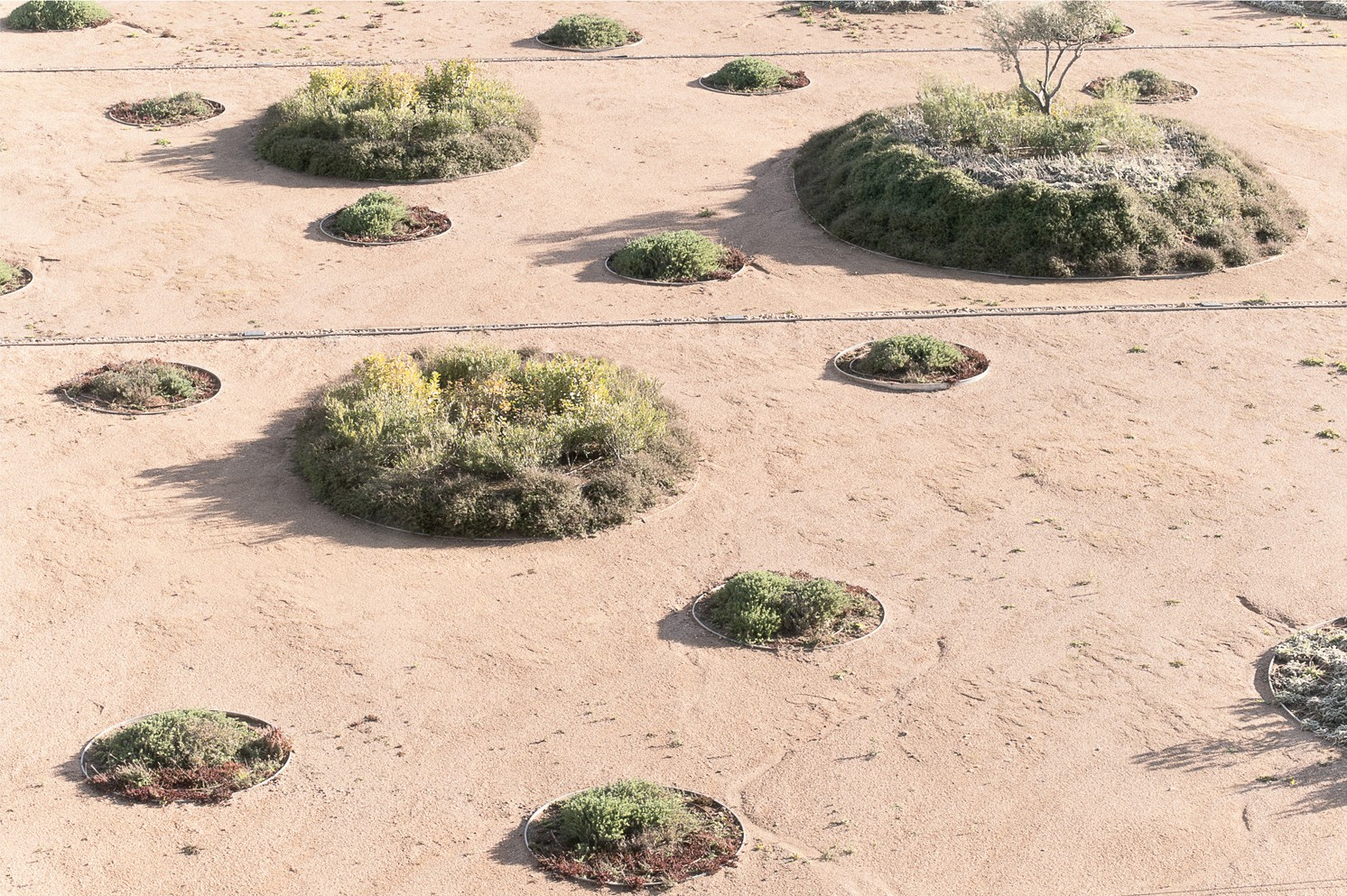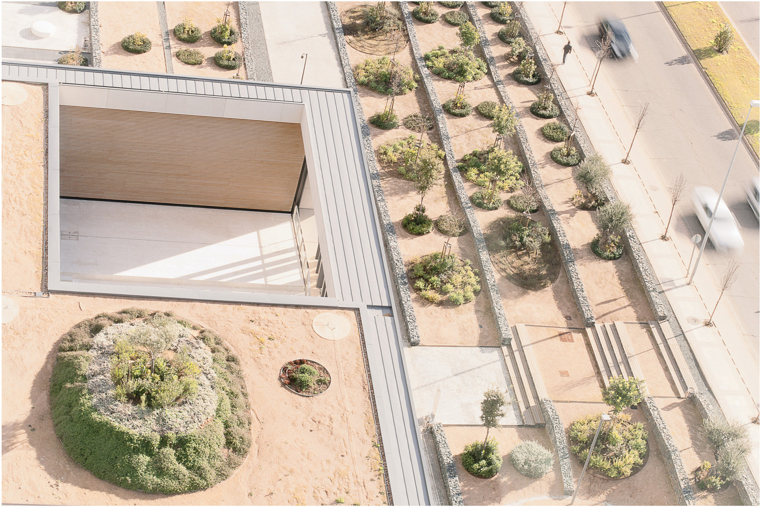 德赫薩景觀幫助我們了解了西班牙西部埃斯特雷馬杜拉地區(qū)發(fā)達(dá)的農(nóng)業(yè)生產(chǎn)體系。事實(shí)上,項(xiàng)目設(shè)想的是打造一片在草灌叢中種植有冬青櫟、栓皮櫟和橄欖樹的“群島”。由圓、橢圓或卵形的同心圓圖案構(gòu)成的景觀設(shè)計,參考了西班牙西部的德赫薩生態(tài)系統(tǒng):繁茂的樹木為許多動植物提供蔭蔽,讓它們享受著樹蔭下的清涼與濕潤,因?yàn)樵谔柕谋裣?,草木難以生長。