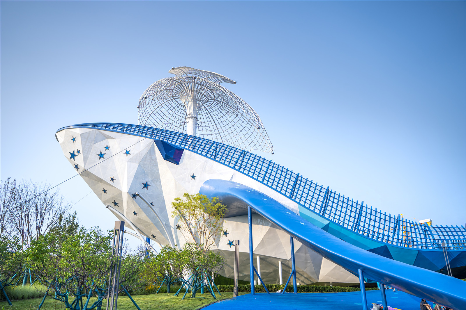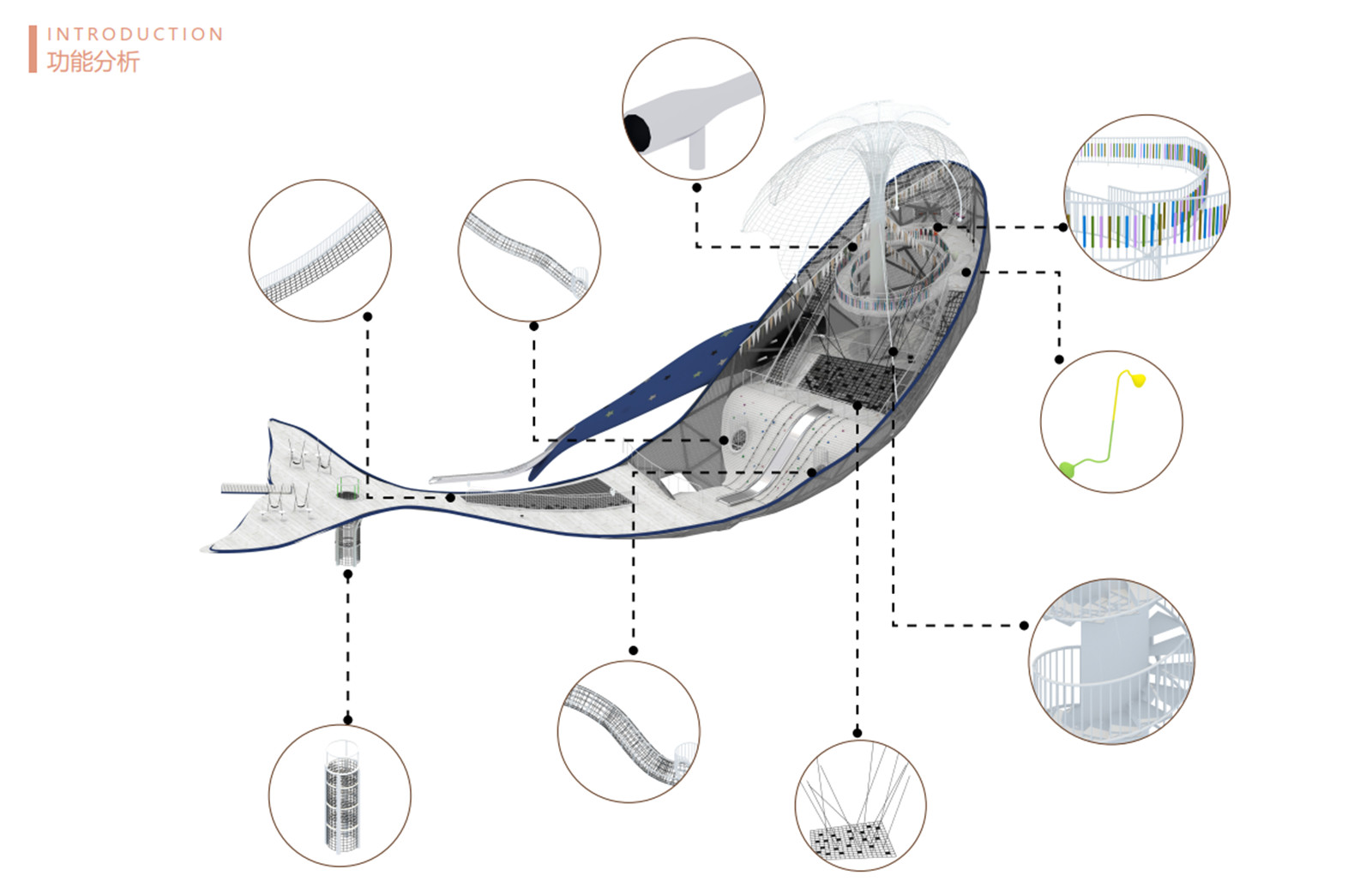 高約26米、長約66米的巨型鯨魚占地約1500㎡,依托以JonathanSwift寫的小說《Gulliver's Travels》飛島國關(guān)聯(lián)52Hz鯨魚Alice的傳奇故事為靈感,將自然生態(tài)系統(tǒng)與項目理念深度融合,項目主設(shè)備鯨魚搭載近30多種娛樂設(shè)施,成為有主題場景感與科普教育的游樂空間。