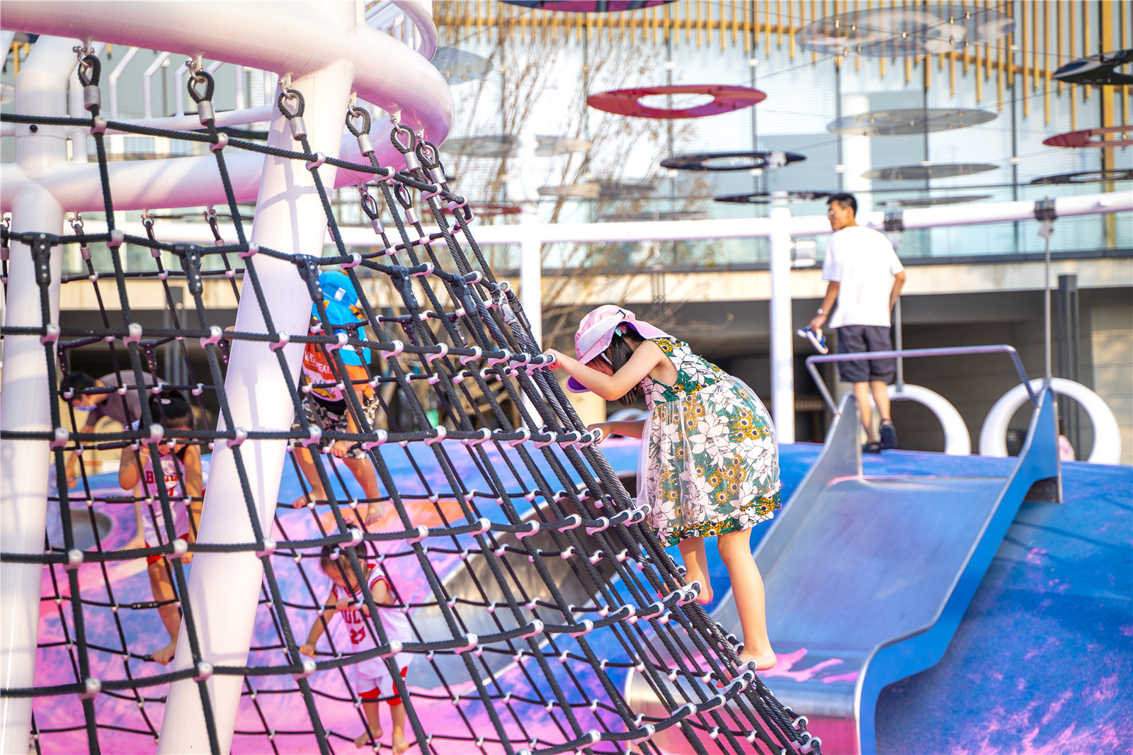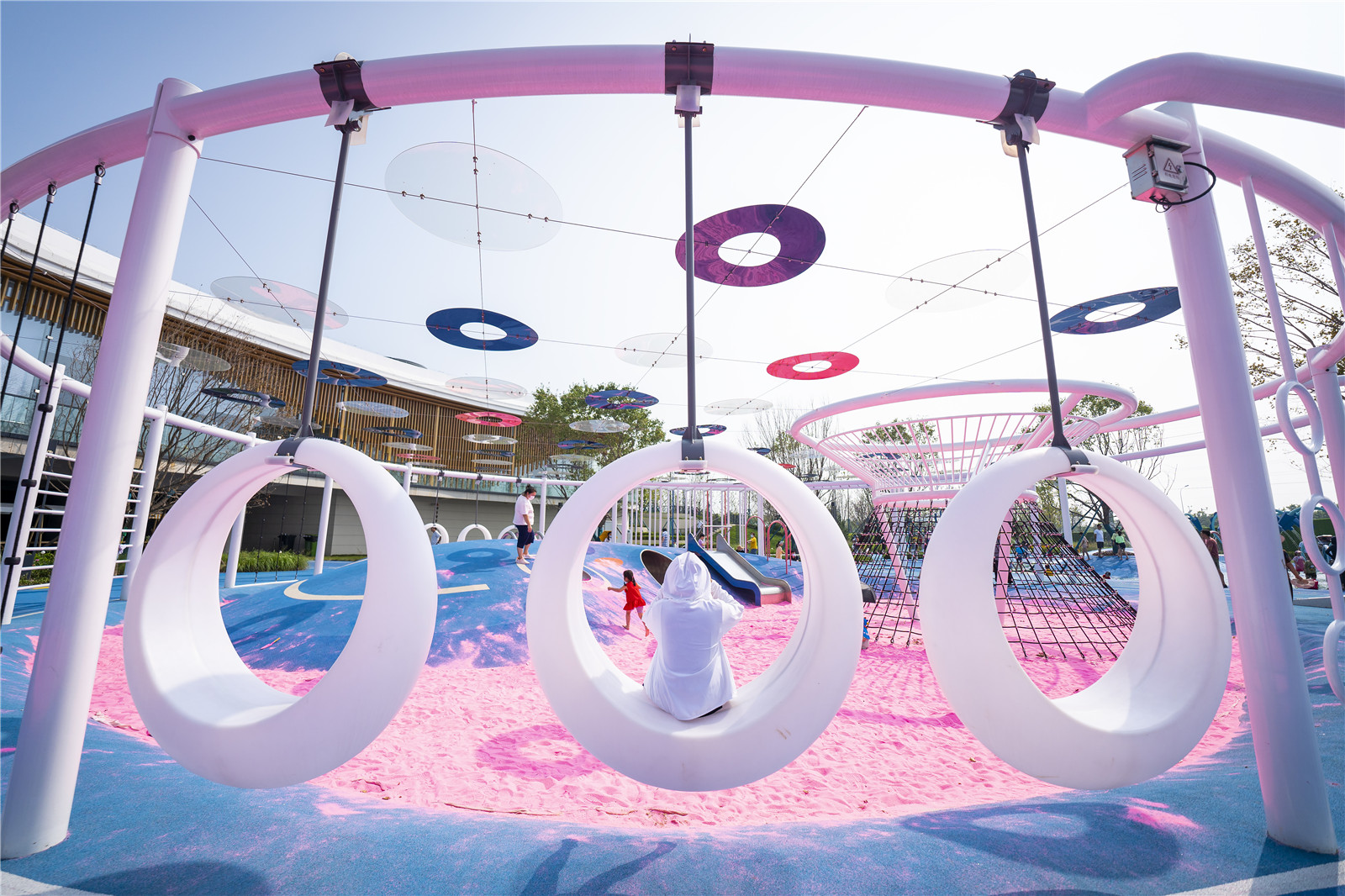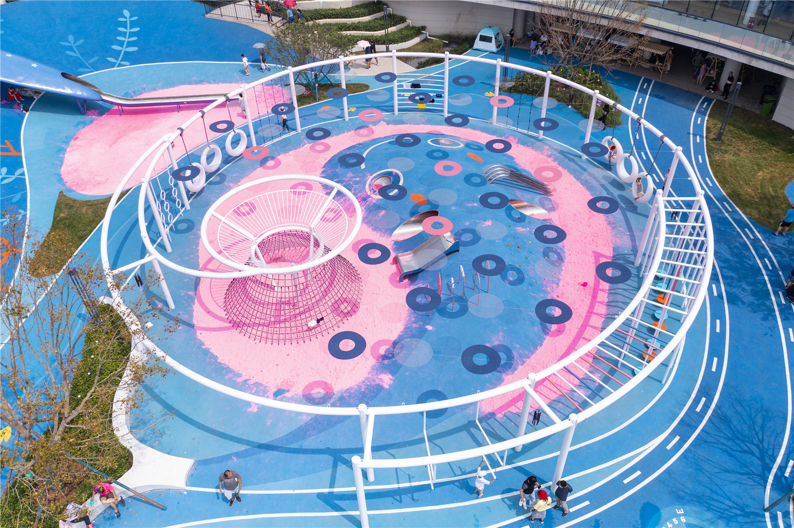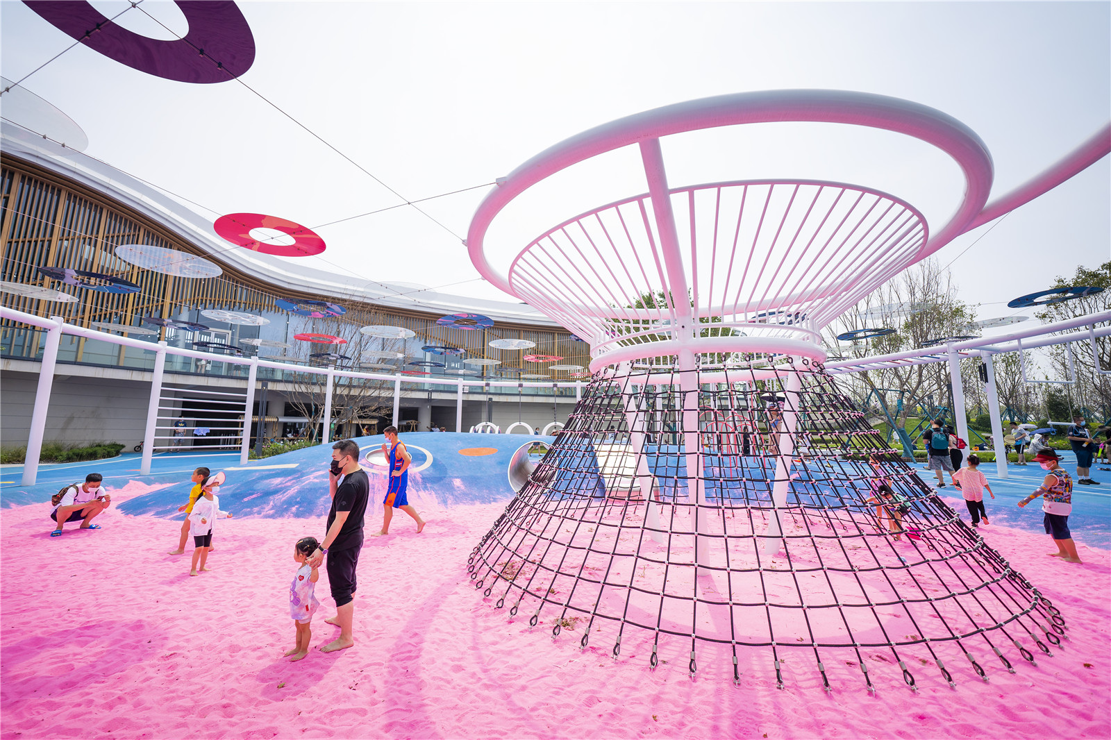 設(shè)計師打破常規(guī),在動線的規(guī)劃上,利用鯨魚側(cè)翼滑梯,把位于凹層粉紅色沙灘游樂區(qū)貫穿起來。漂浮在約4米高空的“圓圈”是一個組合游戲架,提供多樣化的出入口,具有交錯寬大的攀爬游戲空間,孩子們不斷挑戰(zhàn)和通過一輪輪考驗,激發(fā)孩子對游戲的渴望且功能豐富多樣,同時滿足了孩子們走,跳,攀、爬、動手等功能要求,培養(yǎng)孩子的膽識與智力。