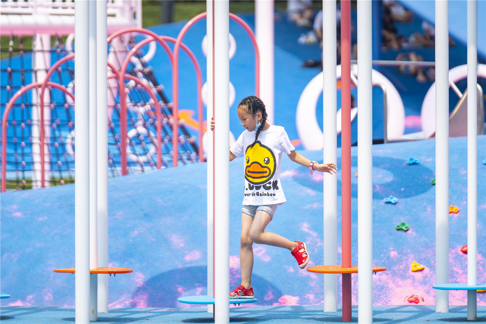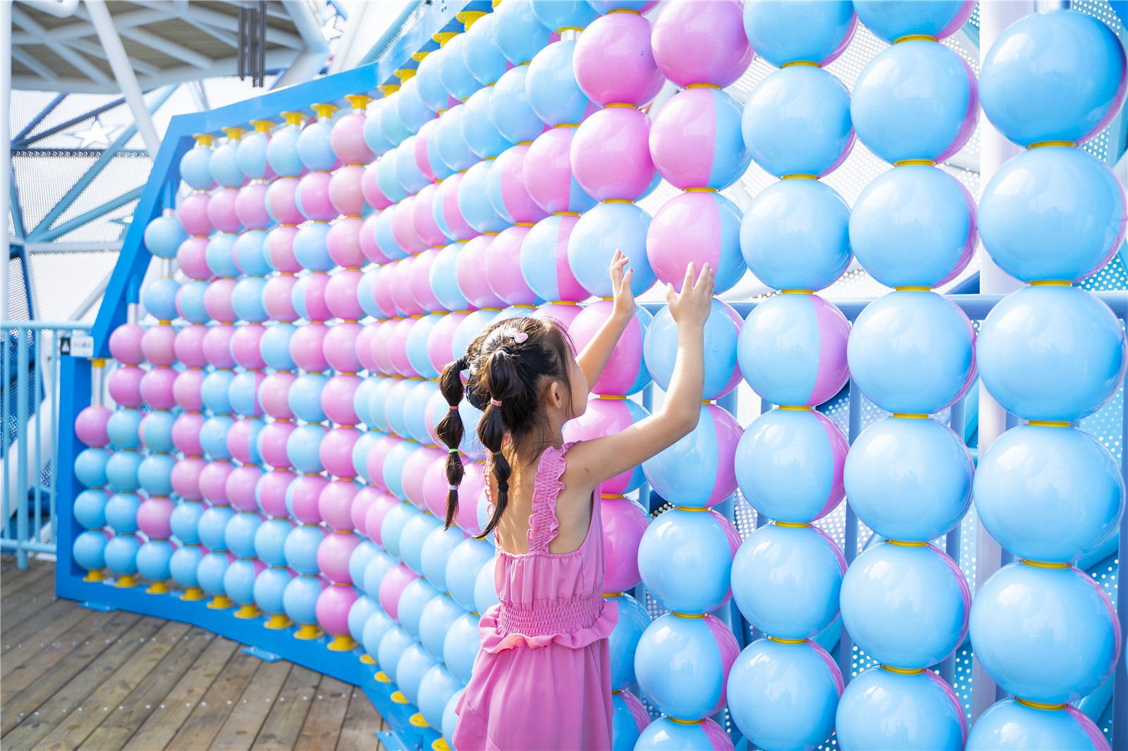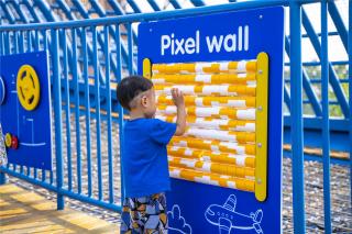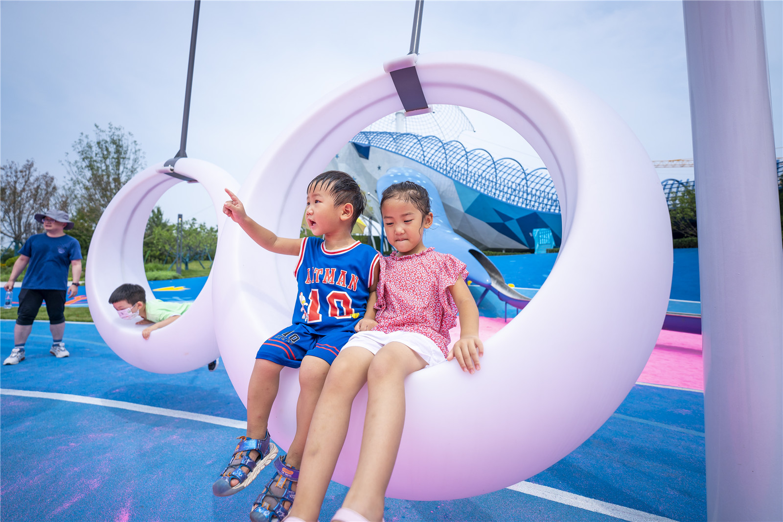 設(shè)計師打破常規(guī),在動線的規(guī)劃上,利用鯨魚側(cè)翼滑梯,把位于凹層粉紅色沙灘游樂區(qū)貫穿起來。漂浮在約4米高空的“圓圈”是一個組合游戲架,提供多樣化的出入口,具有交錯寬大的攀爬游戲空間,孩子們不斷挑戰(zhàn)和通過一輪輪考驗,激發(fā)孩子對游戲的渴望且功能豐富多樣,同時滿足了孩子們走,跳,攀、爬、動手等功能要求,培養(yǎng)孩子的膽識與智力。