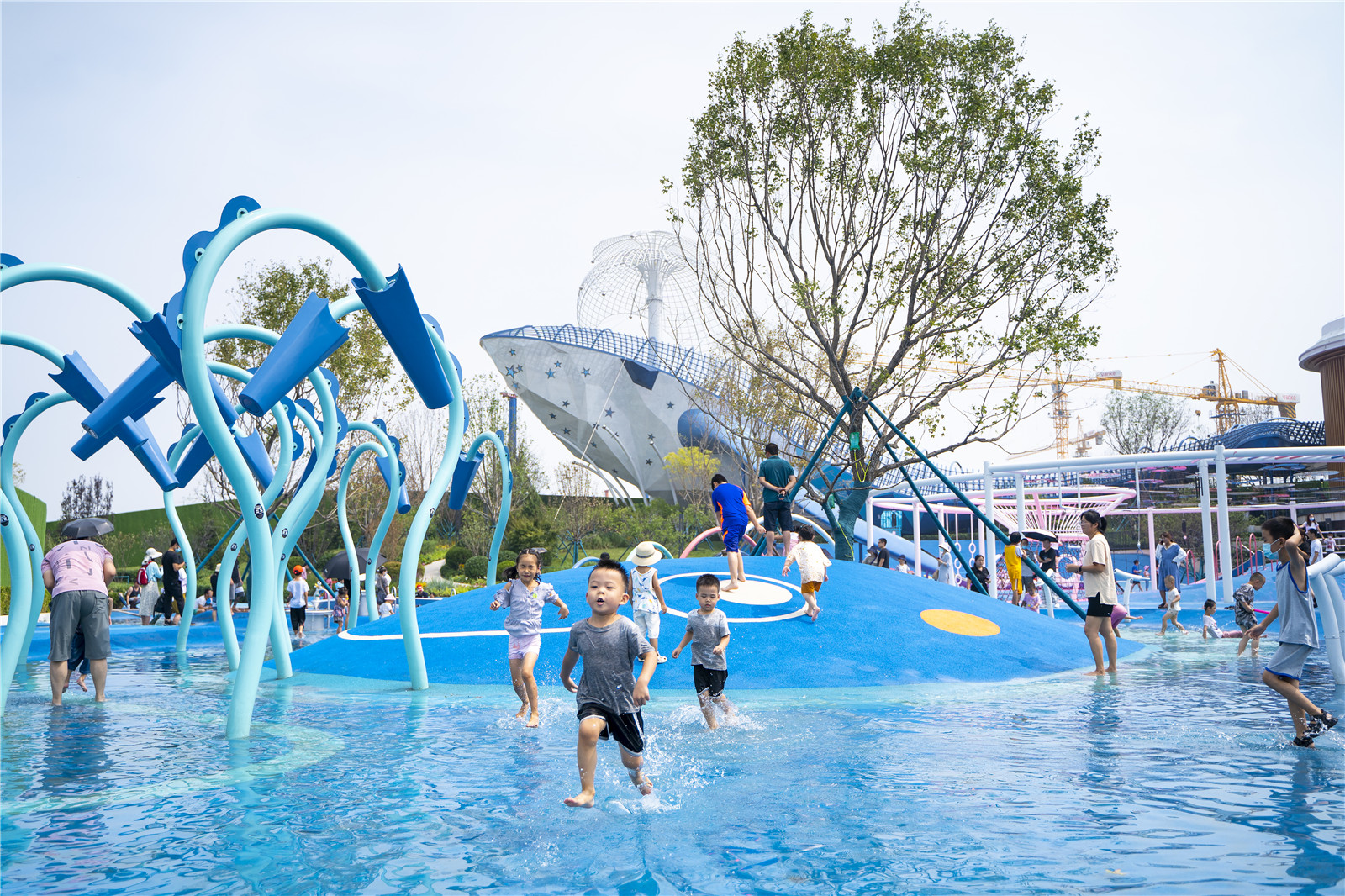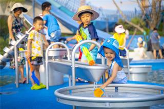 在項目中我們根據(jù)孩童親水性,提出滿足全年齡段孩子功能的戲水區(qū)設(shè)計,提取海洋平靜水面波光粼粼的自然韻律肌理,將其以高低起伏山丘狀編織出基本的場地,擁有海洋生物主題的各類游樂設(shè)施,海草燈具噴水裝置、海馬搖搖樂、小魚滑索……,賦予場地完整的意義,統(tǒng)一的海洋主題戲水區(qū)確保在功能需求多樣化的場地中,使空間變得有序而不混亂,迎合項目的主題ip。