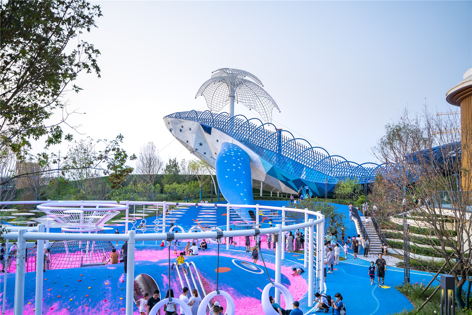 由天津萬科打造的約4.5萬㎡的開放式主題公園--森海樂園,季高集團參與深化設(shè)計了面積近3600㎡以蝴蝶與鯨魚的故事為主題的全齡化游樂區(qū)--“鯨奇樂園”,其中巨型鯨魚ip高約26米、長約66米。該區(qū)域集功能、科技、智慧于一體,包含豐富的拓展娛樂設(shè)施近30余種,為成年人與兒童提供更多智能、文化交互帶來的娛樂享受。不斷刷新孩子們關(guān)于海洋的認知,在舒適溫暖的“親子+社交”中感受大自然的繁復(fù)與偉大。