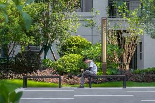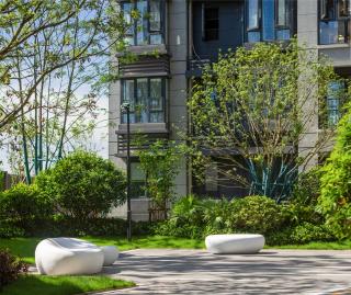 特色水景左右兩側(cè)是通往園區(qū)的主道路,設(shè)計(jì)師利用植物弱化了路口轉(zhuǎn)角的銳利感和視覺(jué)的突兀,不同空間靈活轉(zhuǎn)換,從半圍合空間轉(zhuǎn)向隱匿安靜的后花園,這里是居者最放松最?lèi)芤獾睦硐雸?chǎng)所。