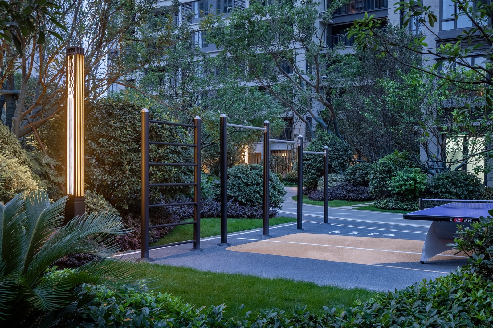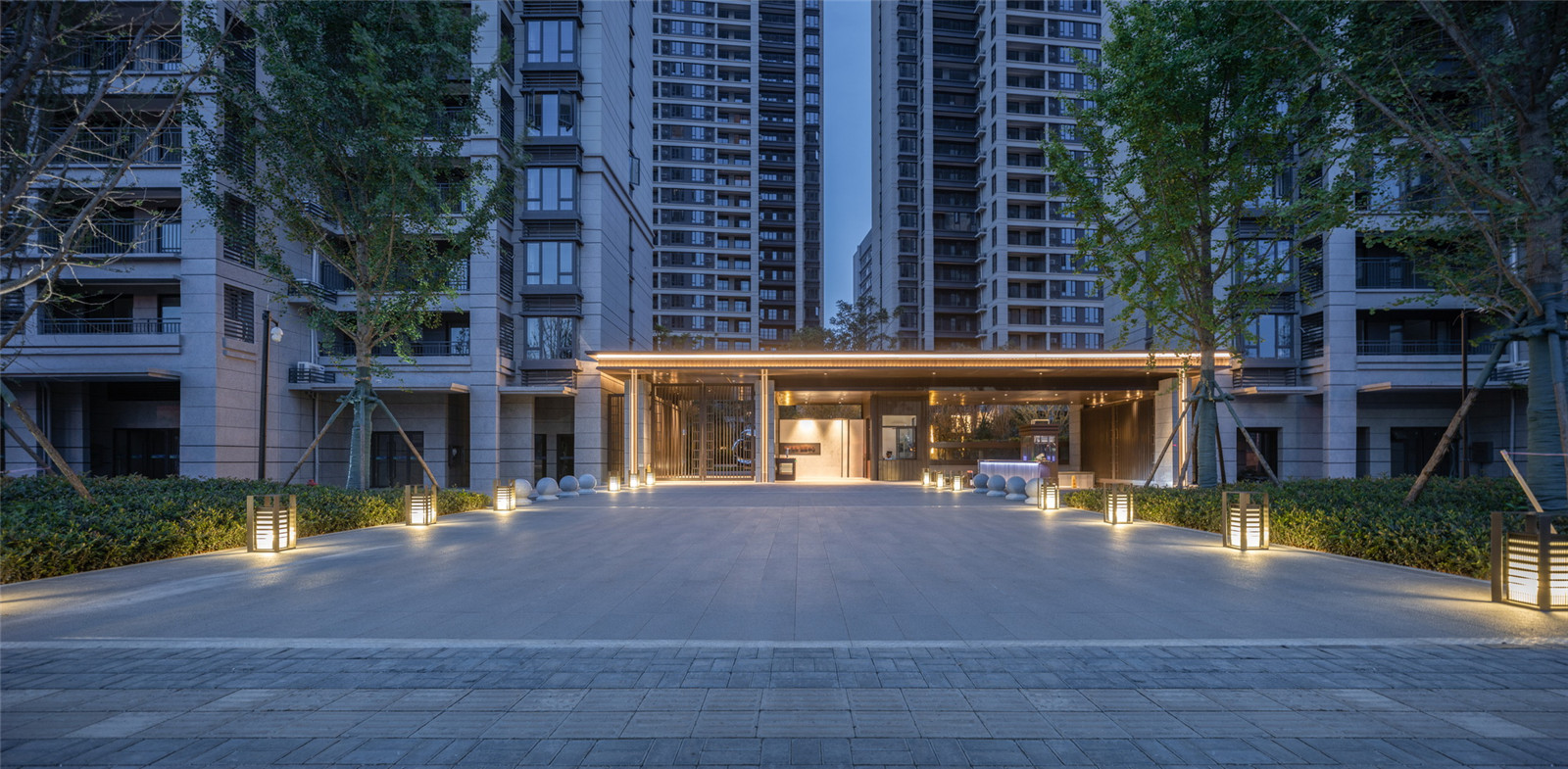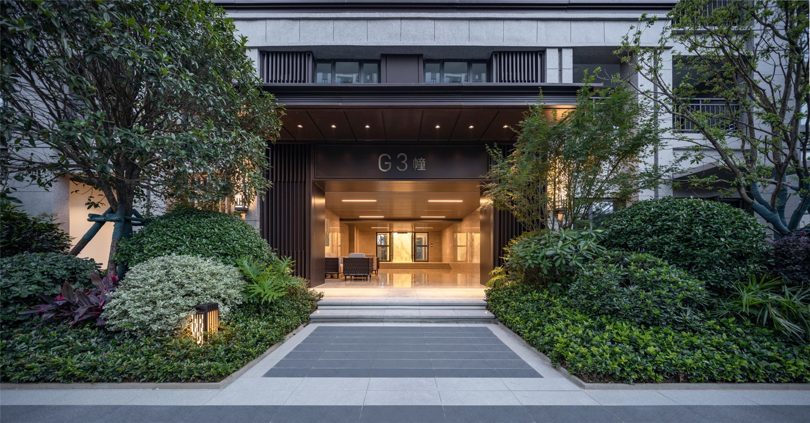線條流暢的地面鋪磚,搭配點(diǎn)式陣列式植物,延伸了入口的空間感。開(kāi)闊有致的空間序列,伴隨著燈光點(diǎn)點(diǎn),一種歸家時(shí)的莊重禮序和儀式感油然而生。
