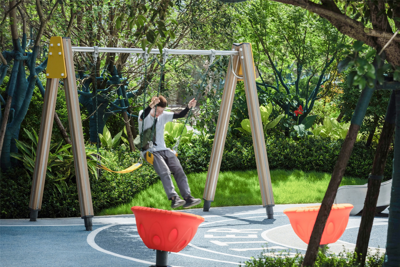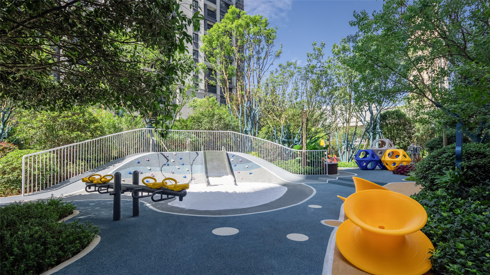 場(chǎng)地引入彩虹橋、星際科普涂鴉墻、秋千、沙坑等多種現(xiàn)代游樂(lè)設(shè)施,滿足不同年齡段的兒童活動(dòng)需求,提升空間的趣味性與自然互動(dòng)性,激發(fā)兒童的活力與創(chuàng)造力,讓自然與空間再次邂逅。