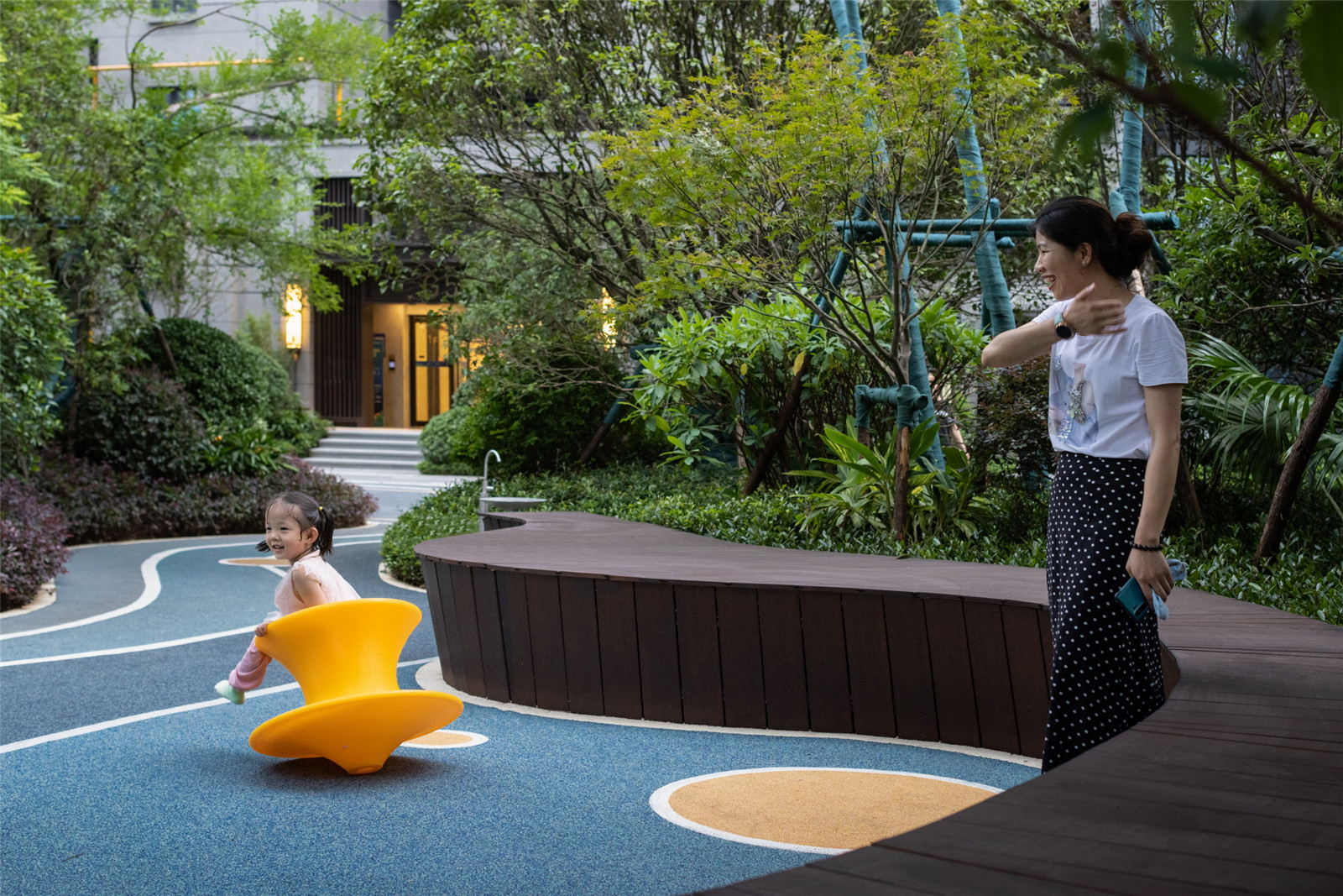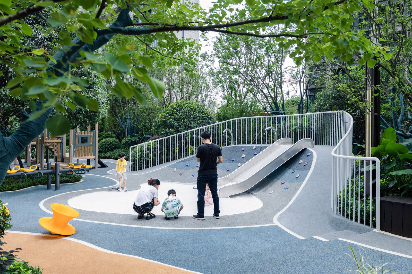 設(shè)計(jì)師通過(guò)尺度的精確把握,利用多層次植物組團(tuán)及合理的喬灌木搭配,及色葉植物搭配,弱化兒童場(chǎng)地對(duì)入戶空間的影響,增加空間層次感。小空間,多重景,為生活增添更多樂(lè)趣、韻味。