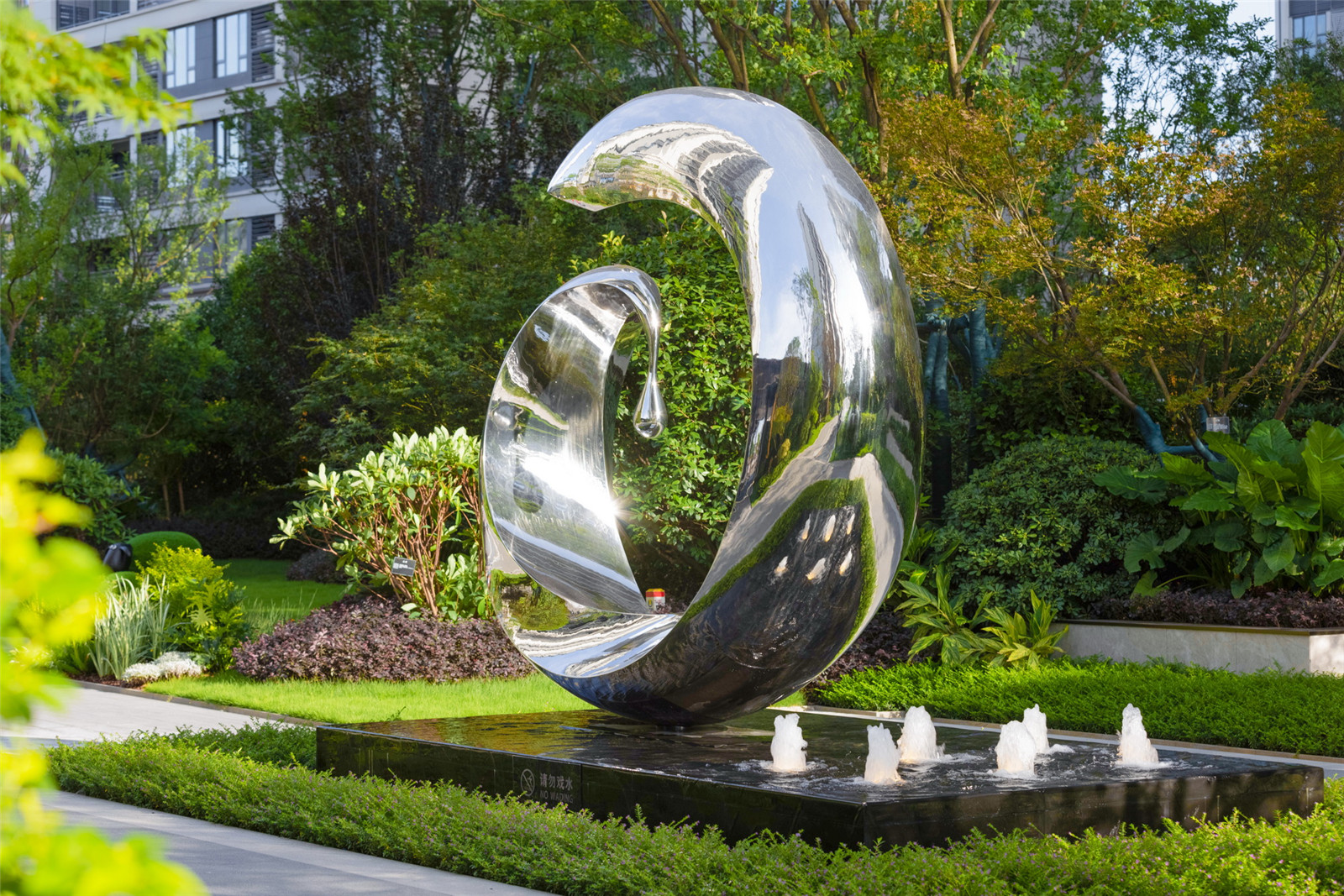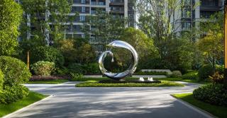 穿越主入口門(mén)樓,豐富的組團(tuán)綠化、精裝的造型景墻涌泉水景與聚財(cái)匯富的水滴雕塑,迎面而來(lái)。此處的景致厚密,層次豐富,充分利用空間的先抑后揚(yáng),遮擋了視線,使園景不能一覽無(wú)余。