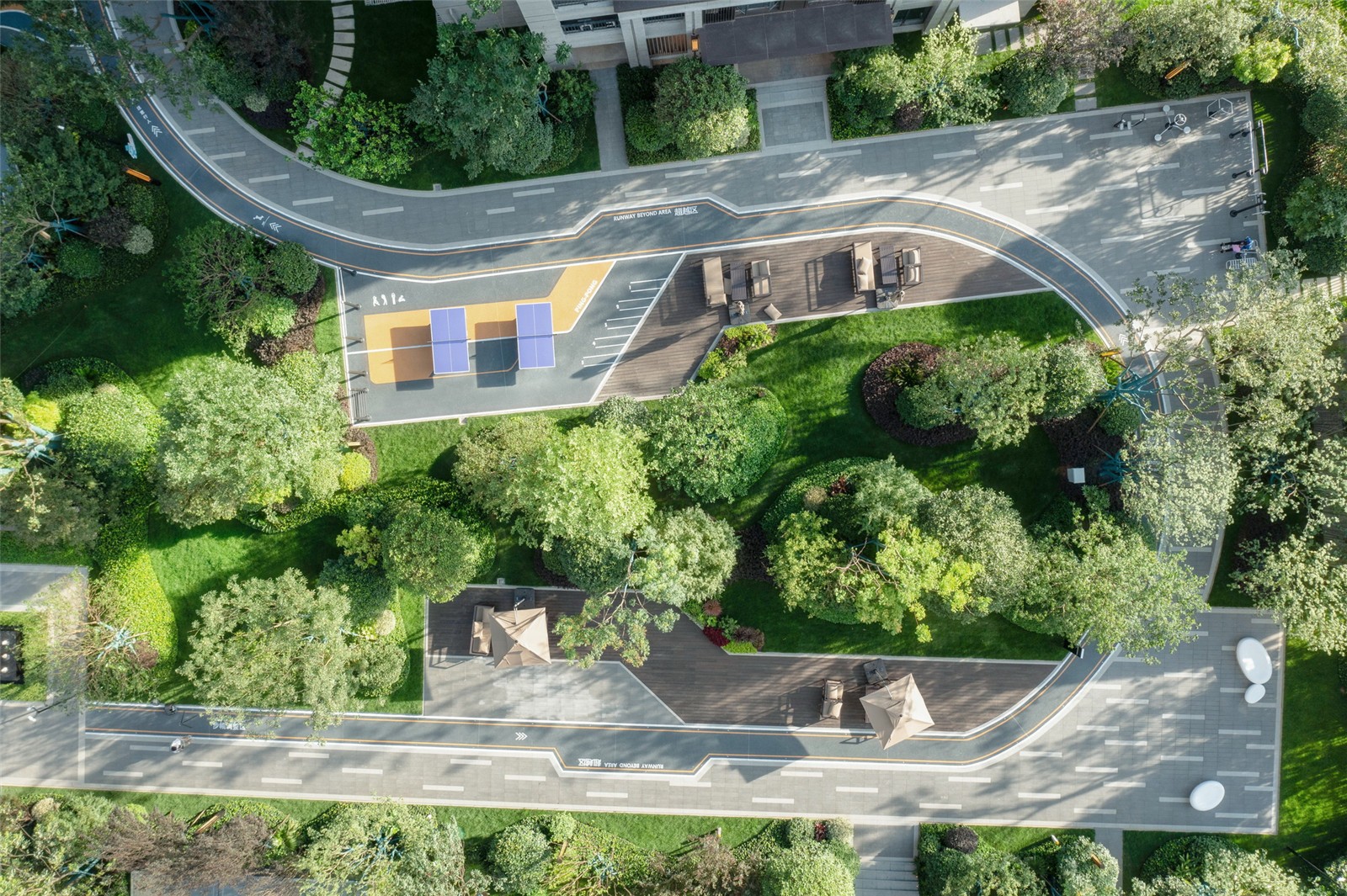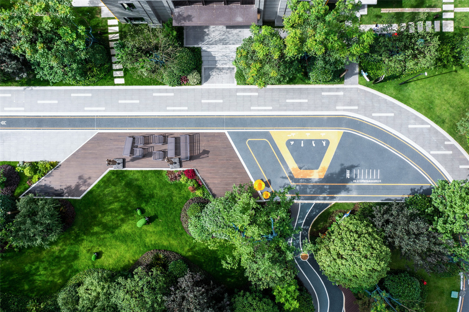 考慮到居者更多的內(nèi)心訴求,設(shè)計(jì)師通過(guò)鋪裝材料和顏色的劃分,合理利用消防通道,行成便捷歸家道和園區(qū)跑步道,多處設(shè)計(jì)地面標(biāo)線、加速區(qū),既起到分區(qū)的作用,又增添了跑步道的趣味性。在有限的空間內(nèi)布局一種完整精致的生活空間,喚起人們對(duì)自然生活的向往。