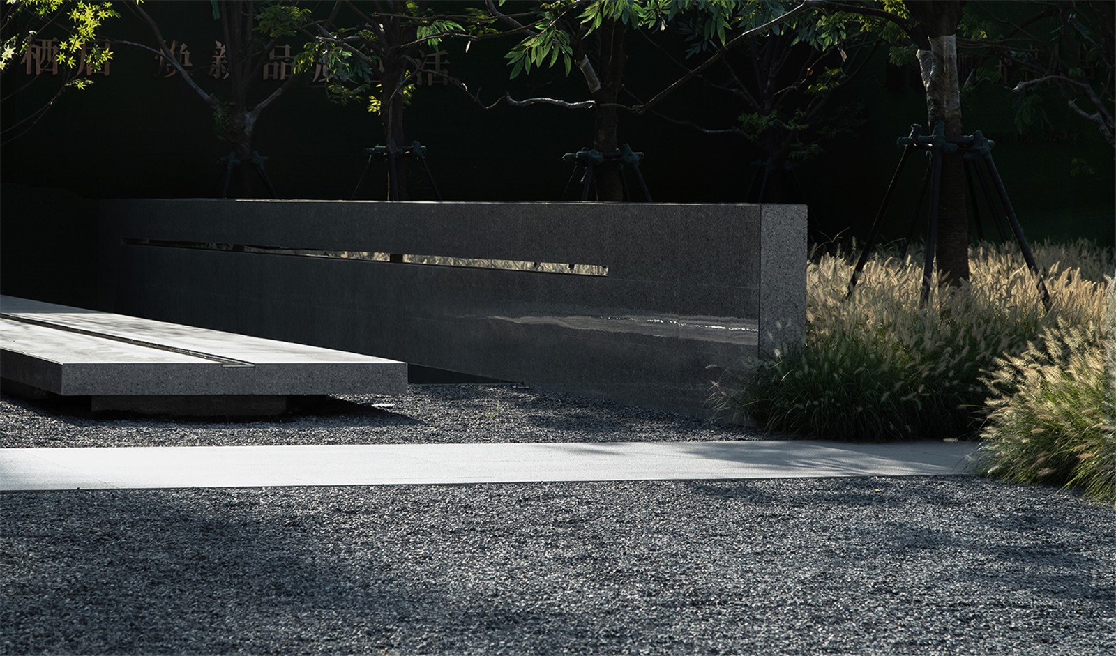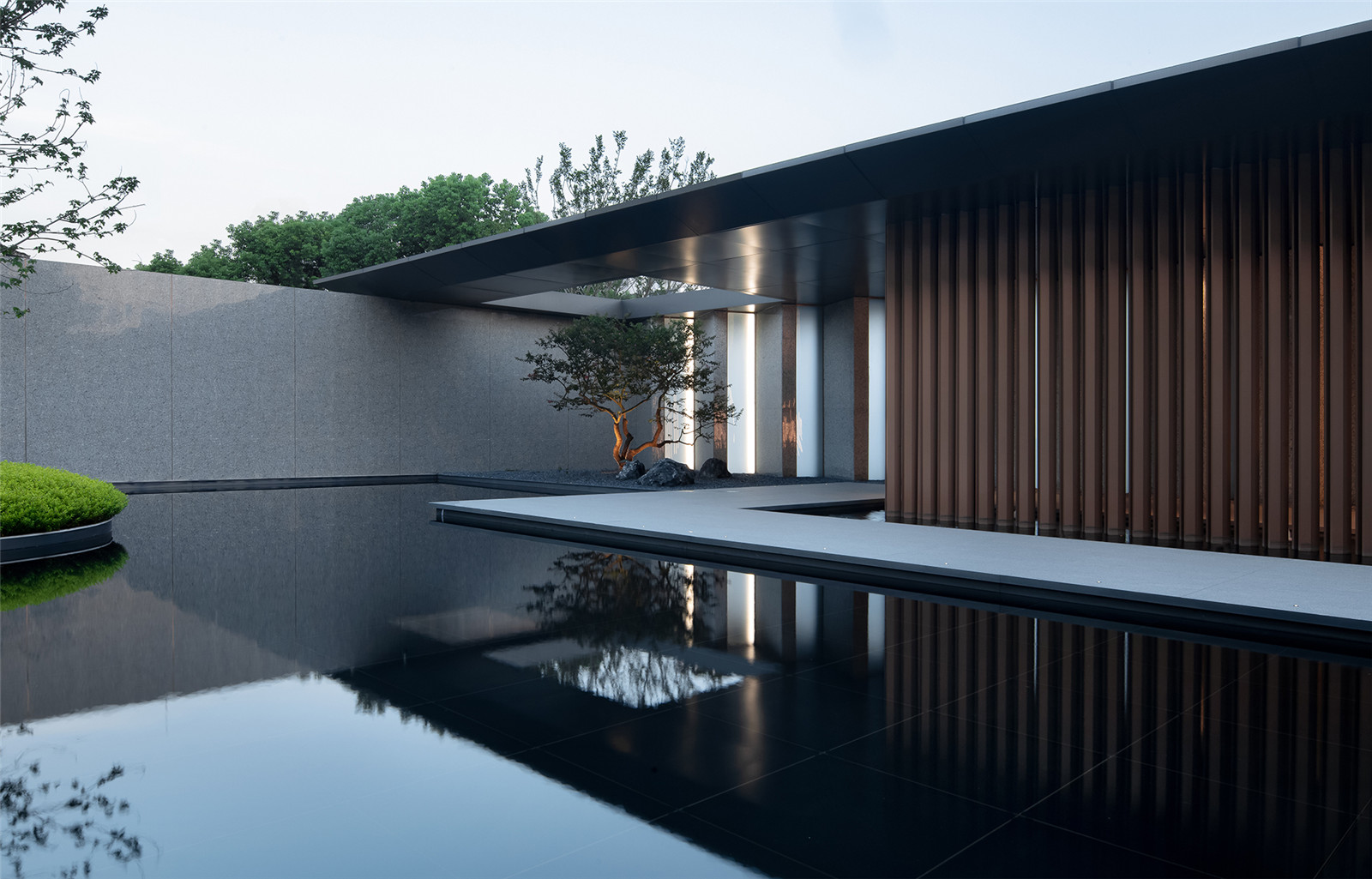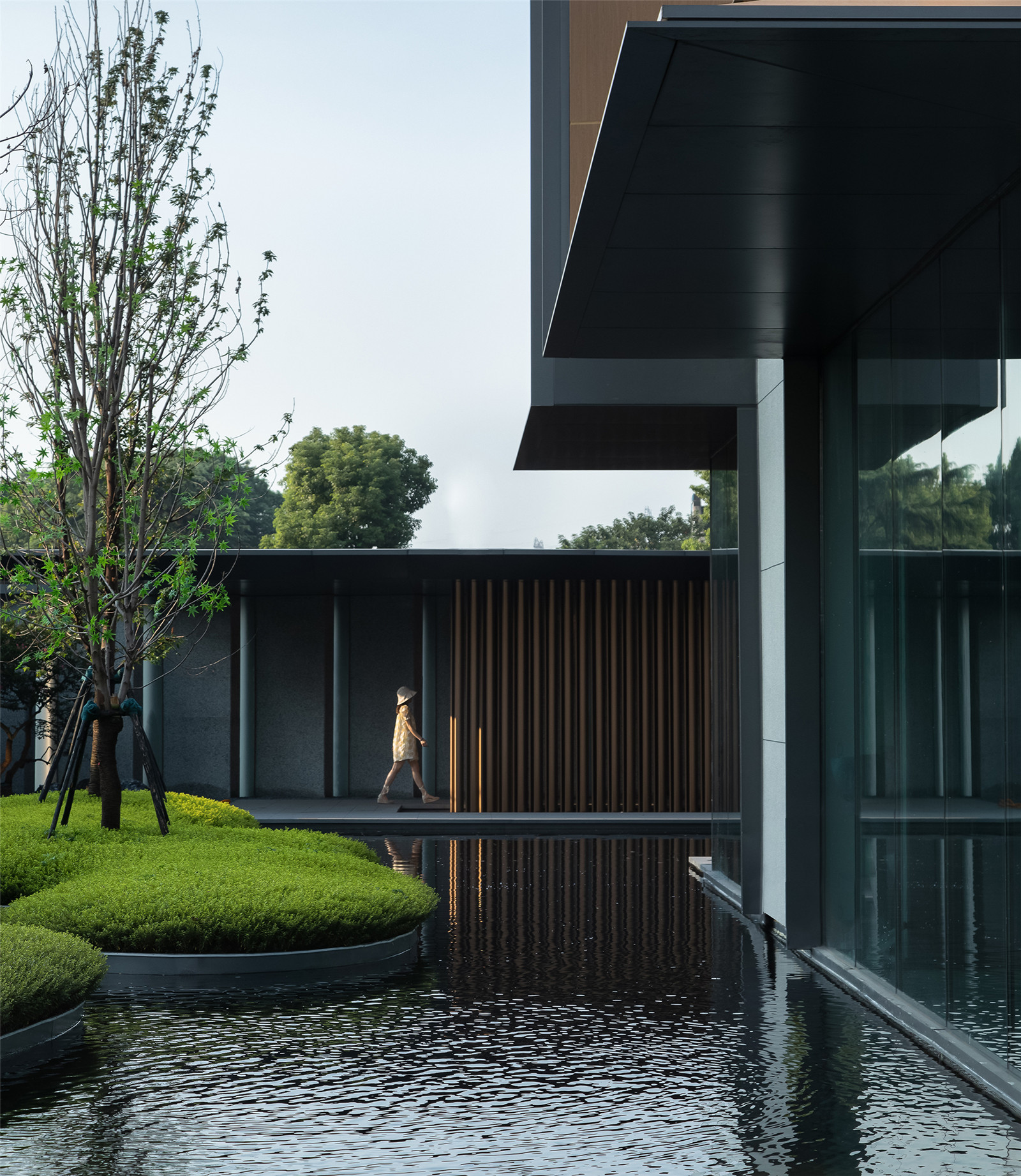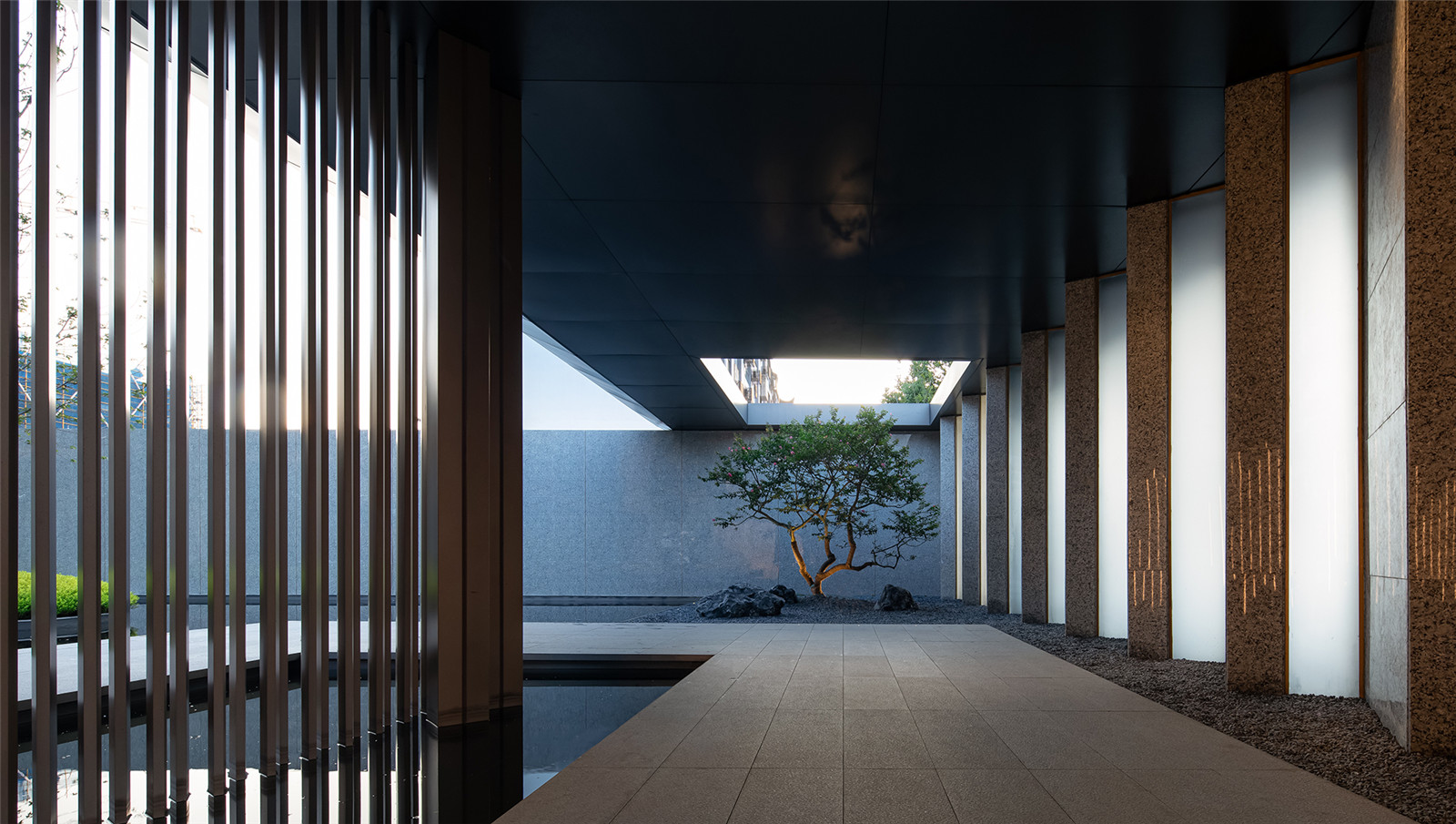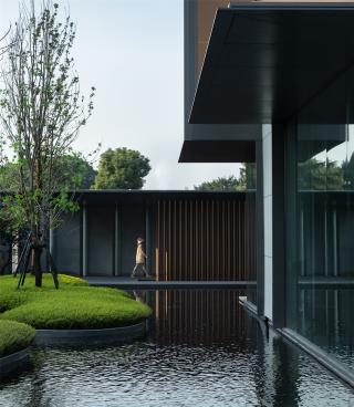 格柵圍成的屏風(fēng)內(nèi)外,是城市與山海,也是古往與今來。進(jìn)入與山水畫面展開一場純粹的對話,短暫經(jīng)歷生命的另一種形式,靜怡平和的氛圍隨著水面通達(dá)的石板漫向深處。