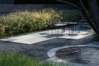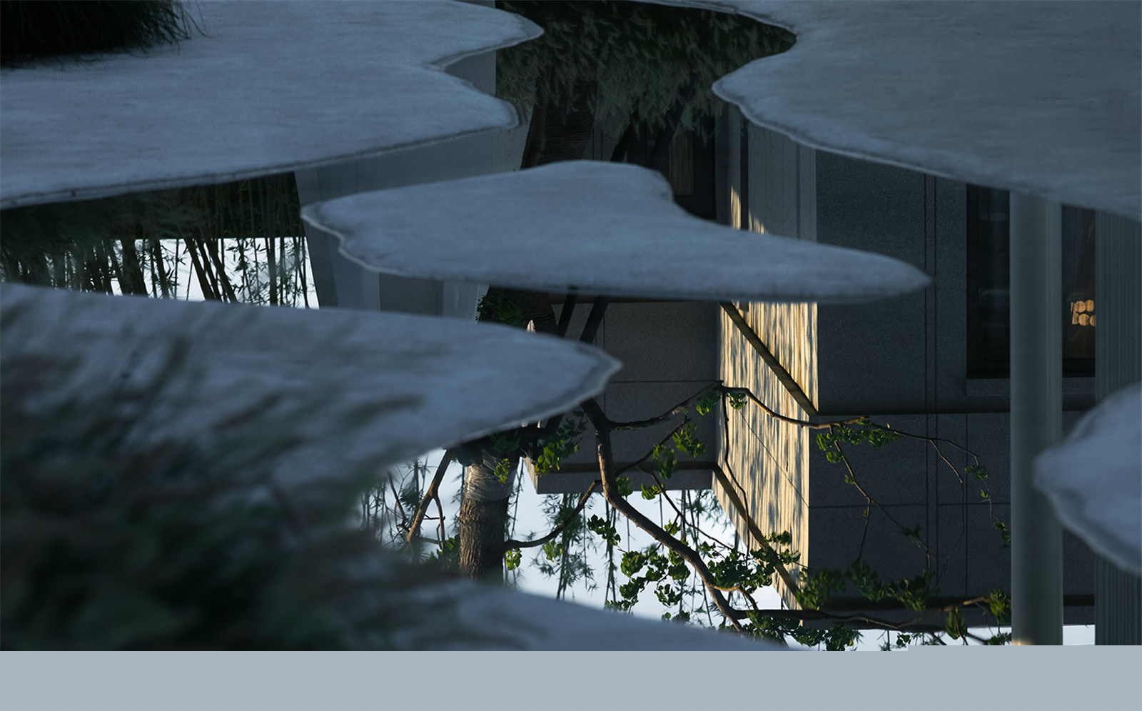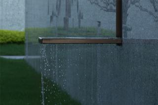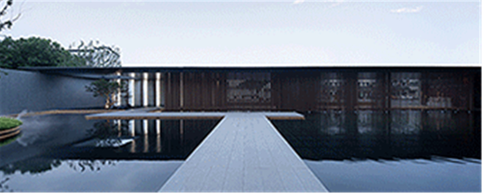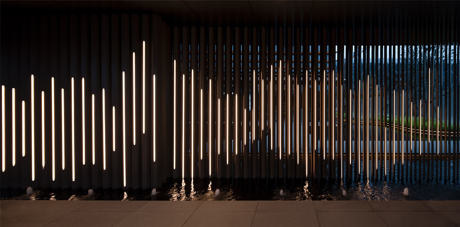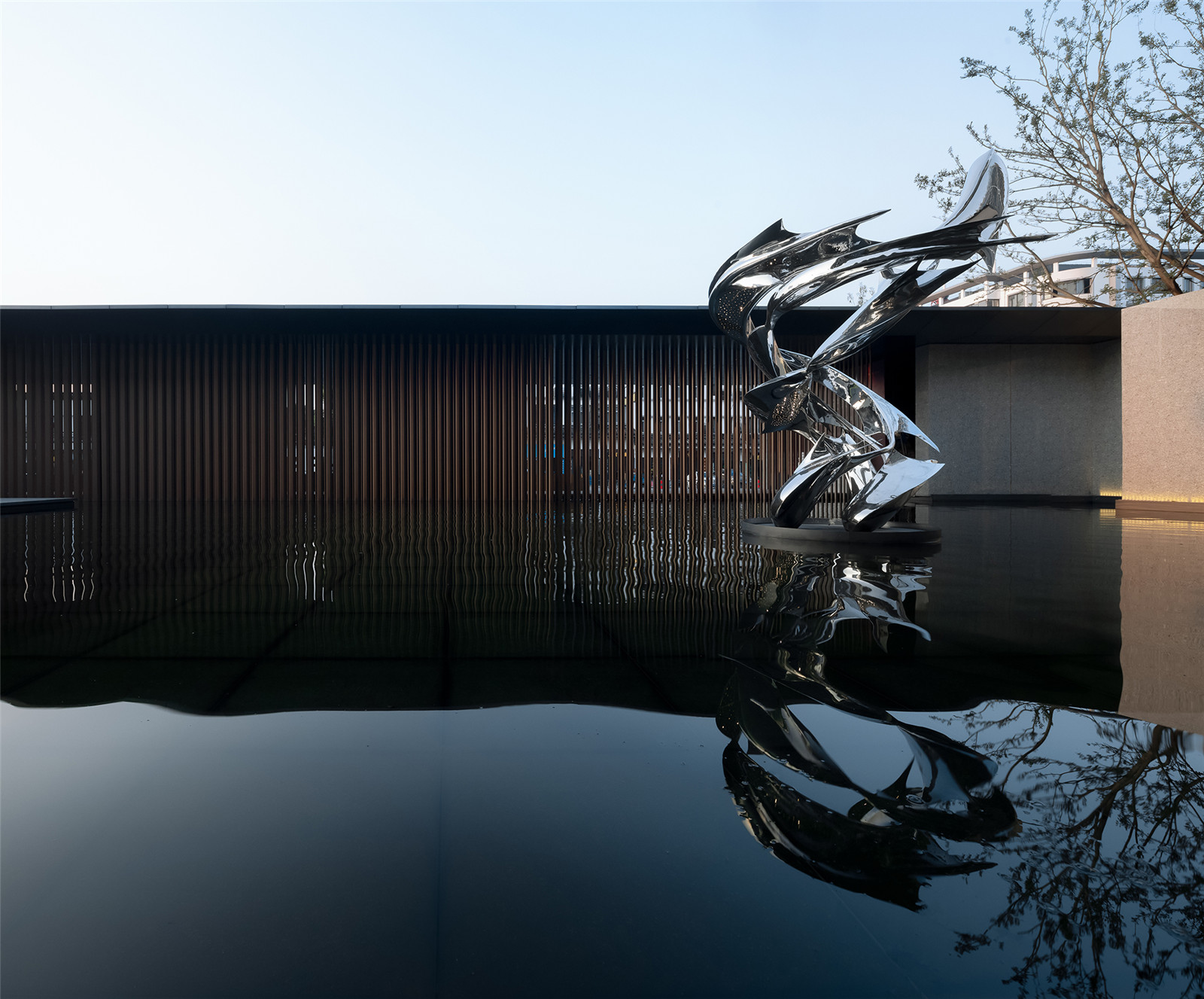格柵圍成的屏風(fēng)內(nèi)外,是城市與山海,也是古往與今來。進(jìn)入與山水畫面展開一場純粹的對話,短暫經(jīng)歷生命的另一種形式,靜怡平和的氛圍隨著水面通達(dá)的石板漫向深處。