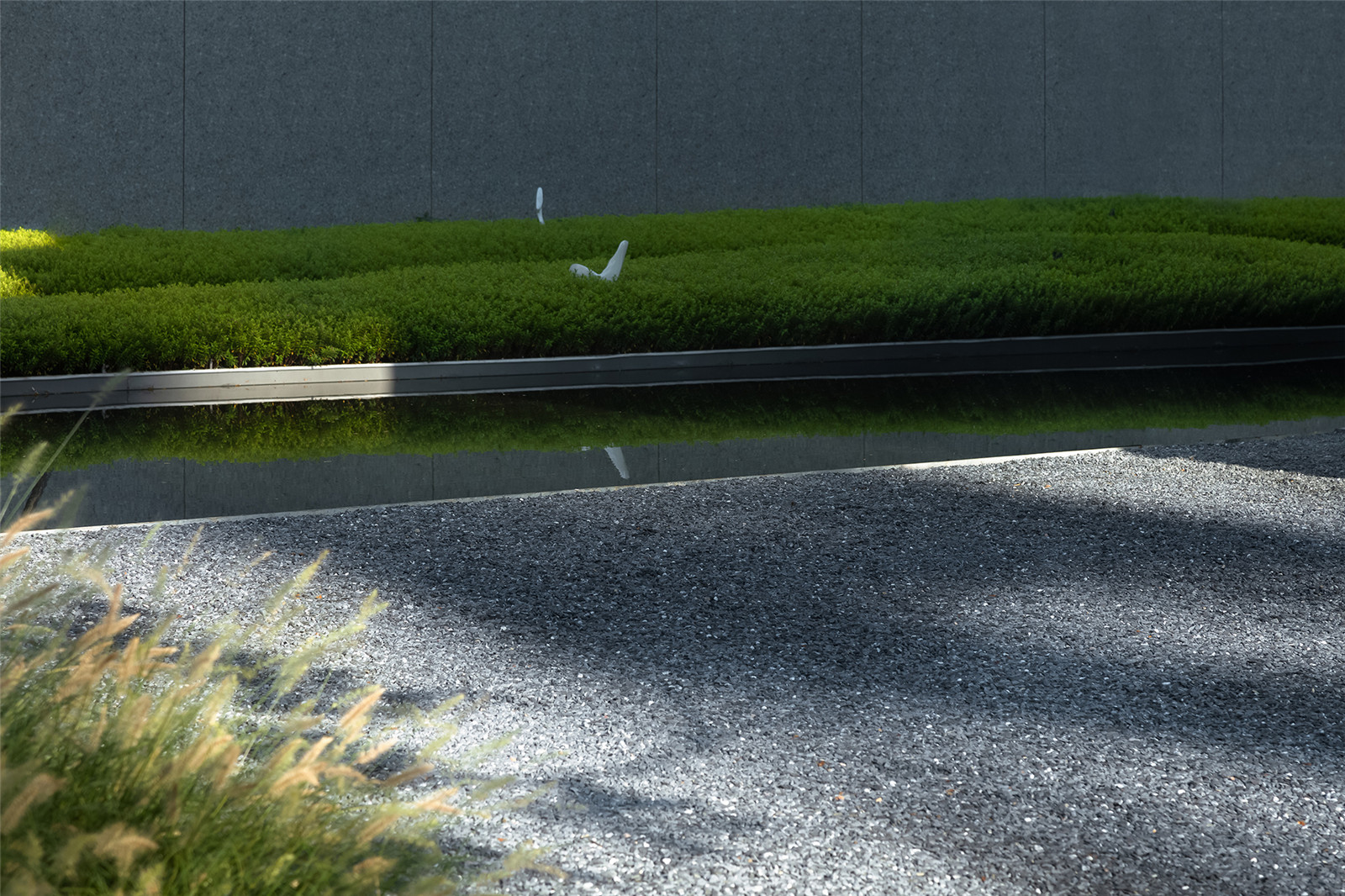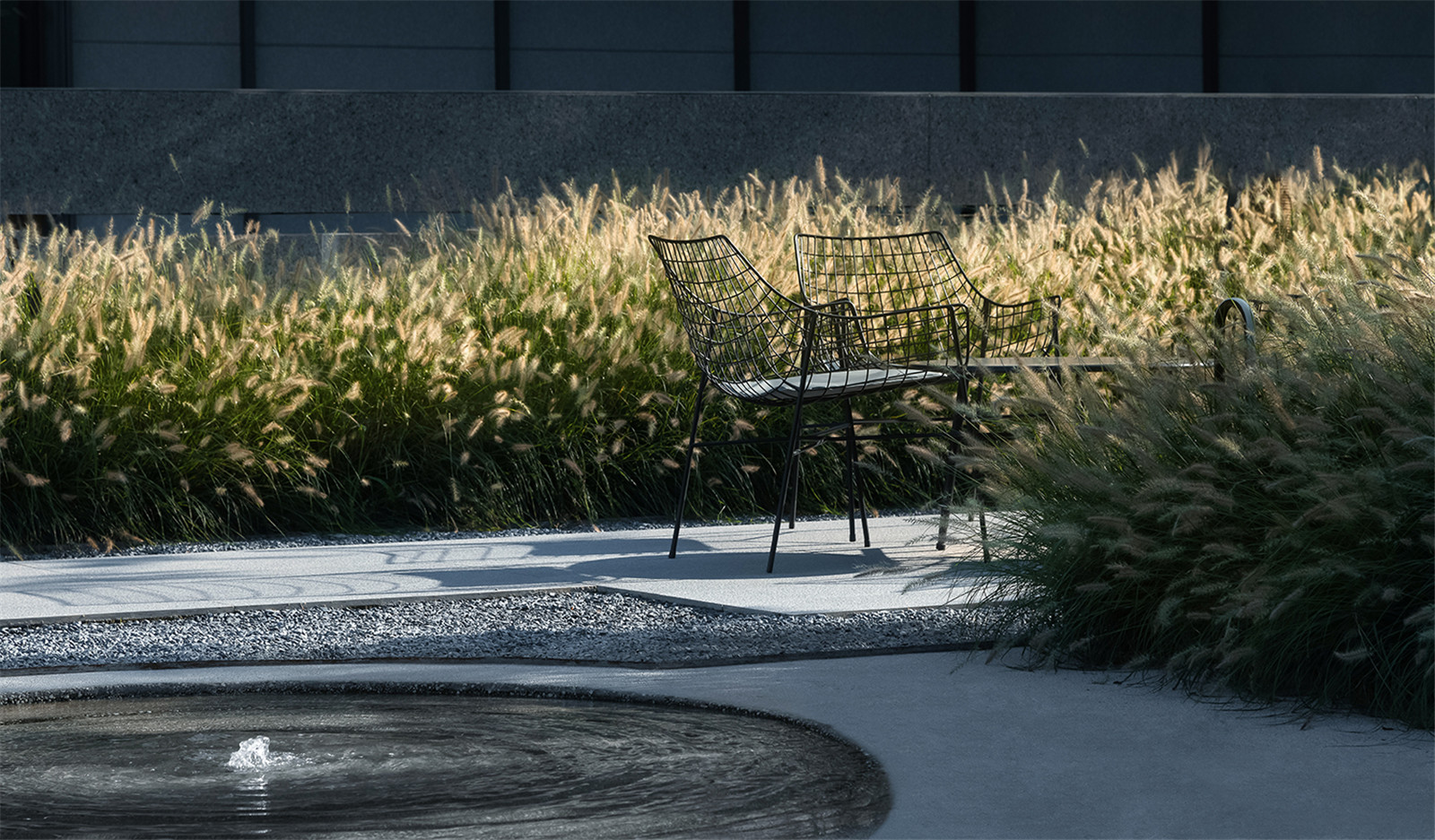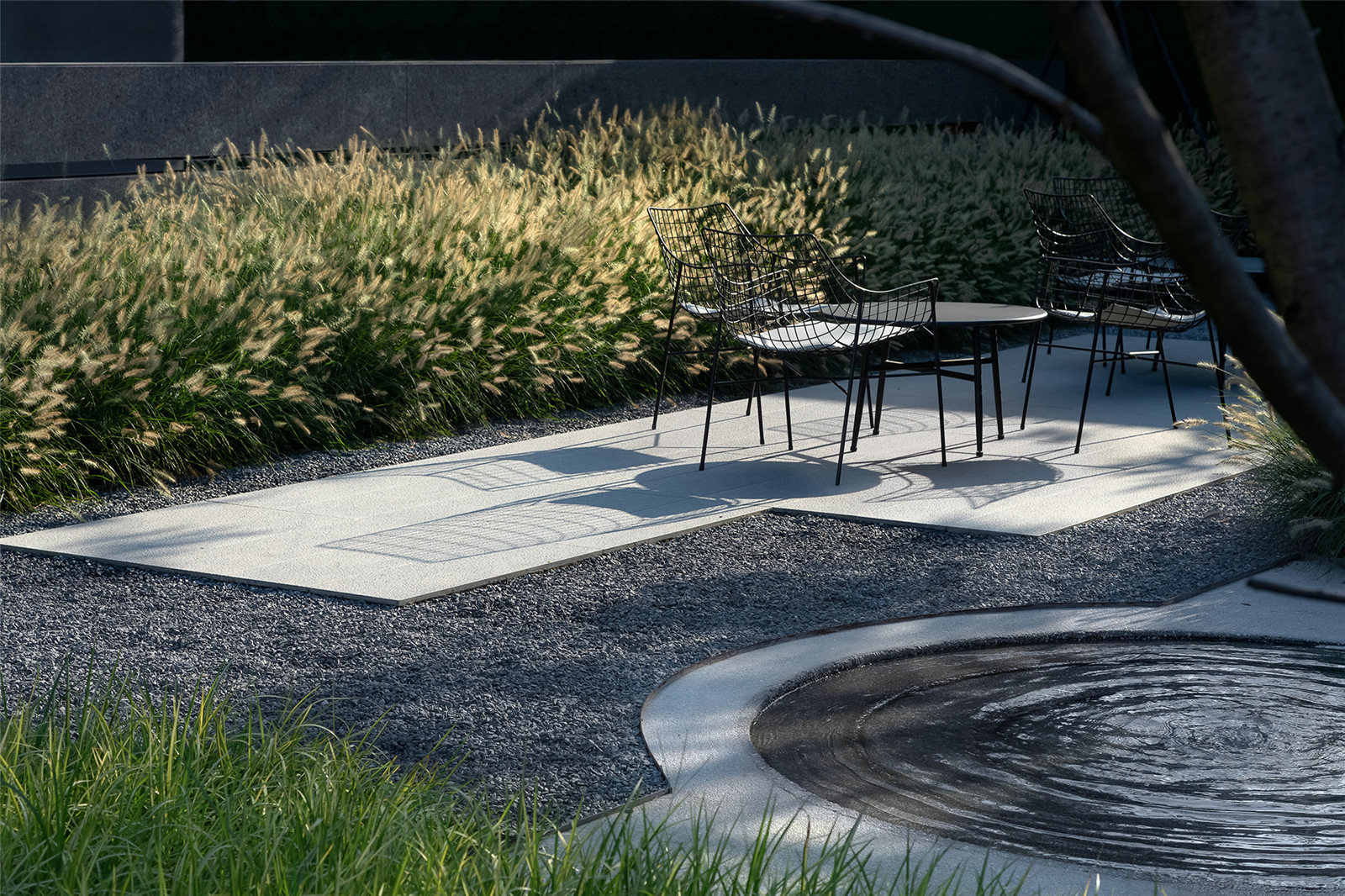 通直的小徑將水面延伸至礫石,水元素轉(zhuǎn)換為另一種姿態(tài)伴隨一側(cè)。香樟與小兔子狼尾草在前方搖擺,植物原生姿態(tài)的吸引將探秘情緒瞬間捕捉,觸手可及。