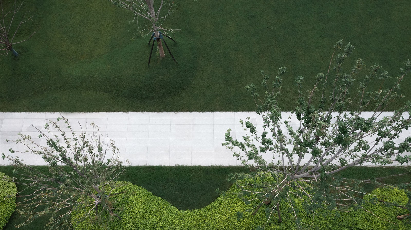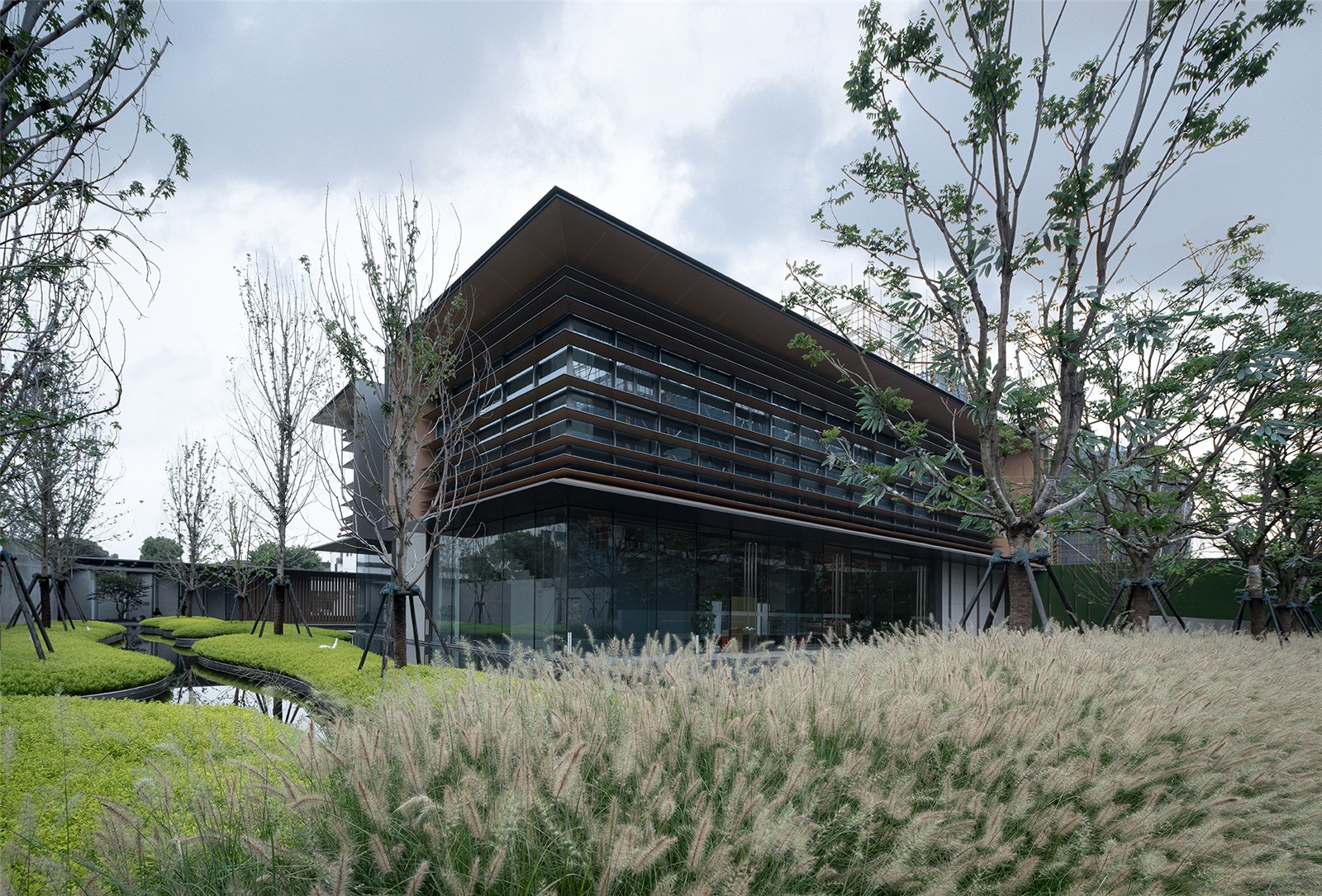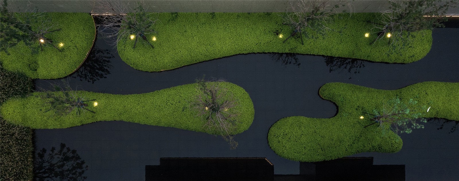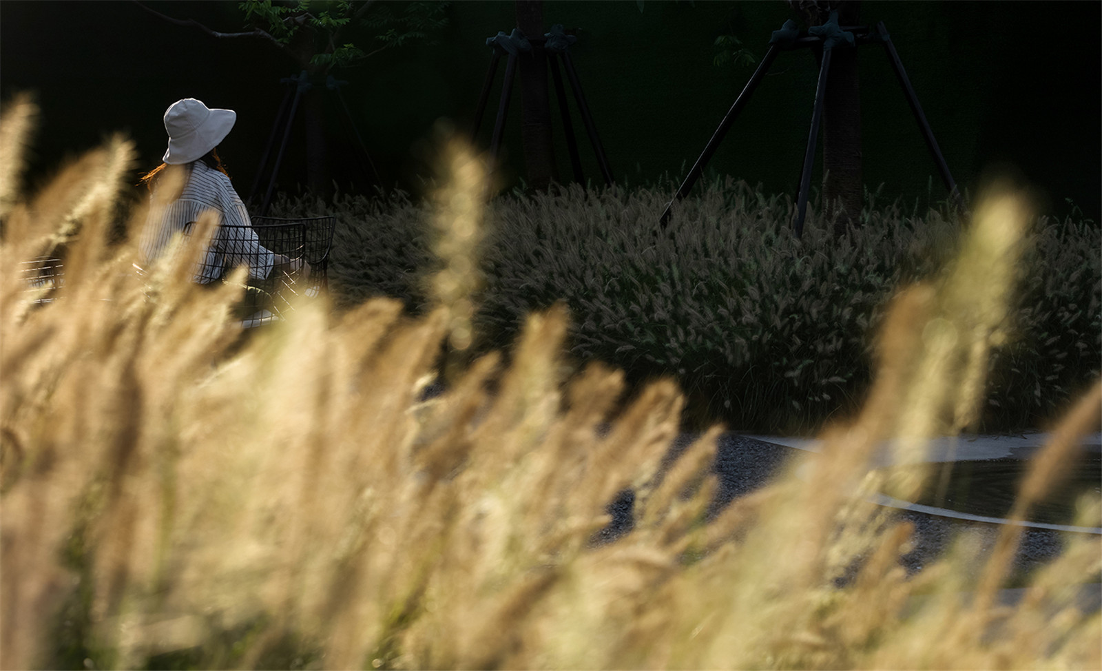 通直的小徑將水面延伸至礫石,水元素轉(zhuǎn)換為另一種姿態(tài)伴隨一側(cè)。香樟與小兔子狼尾草在前方搖擺,植物原生姿態(tài)的吸引將探秘情緒瞬間捕捉,觸手可及。