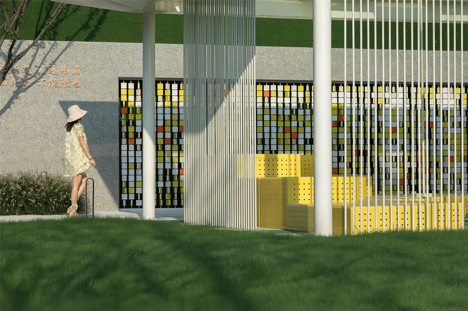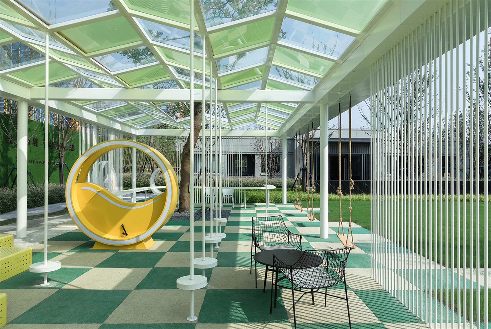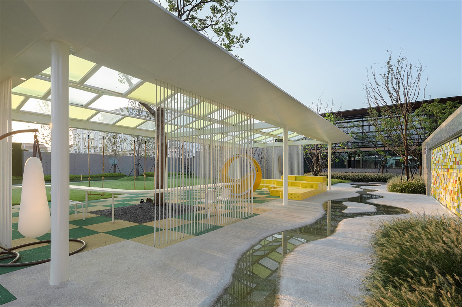 棋盤格的色彩釋放童真,動力單車將流觴曲水的一端微微涌起,穿頂婆娑的大樹與植物絨絨的手感使人重返與自然的深度聯(lián)結(jié),林下是嬉鬧的童年與微笑攀談的看護者,跳動著溫柔而有趣的內(nèi)心。