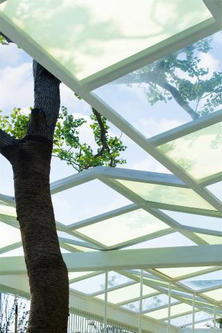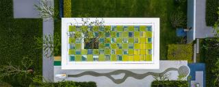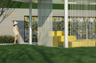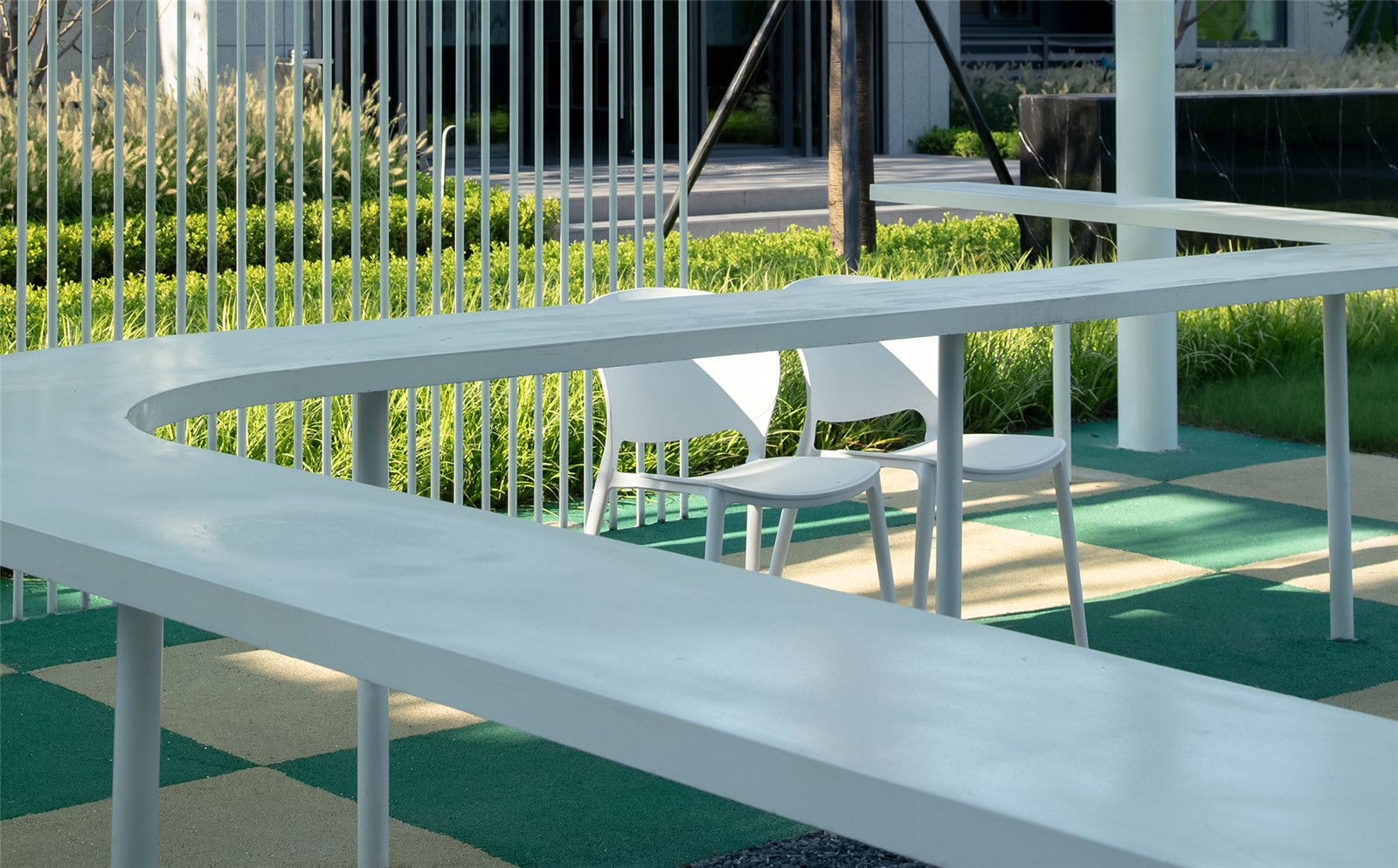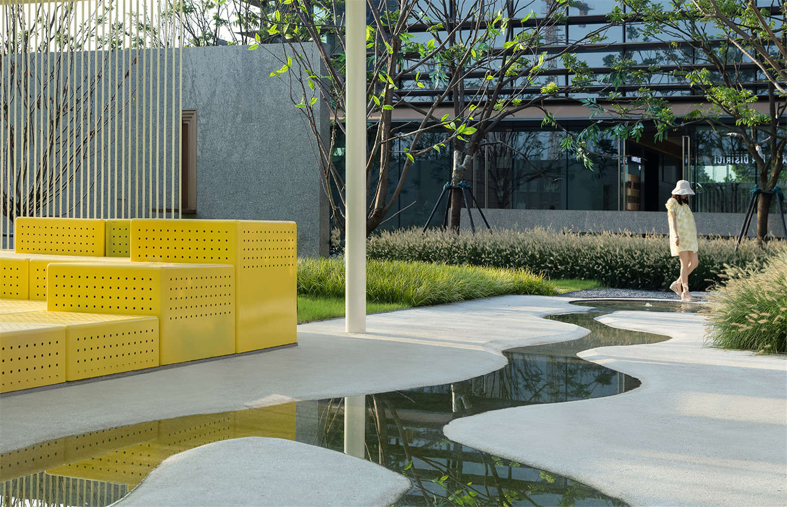 棋盤格的色彩釋放童真,動力單車將流觴曲水的一端微微涌起,穿頂婆娑的大樹與植物絨絨的手感使人重返與自然的深度聯(lián)結(jié),林下是嬉鬧的童年與微笑攀談的看護者,跳動著溫柔而有趣的內(nèi)心。