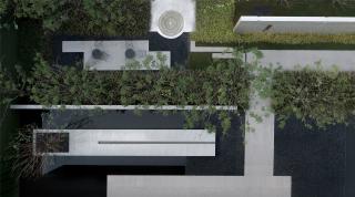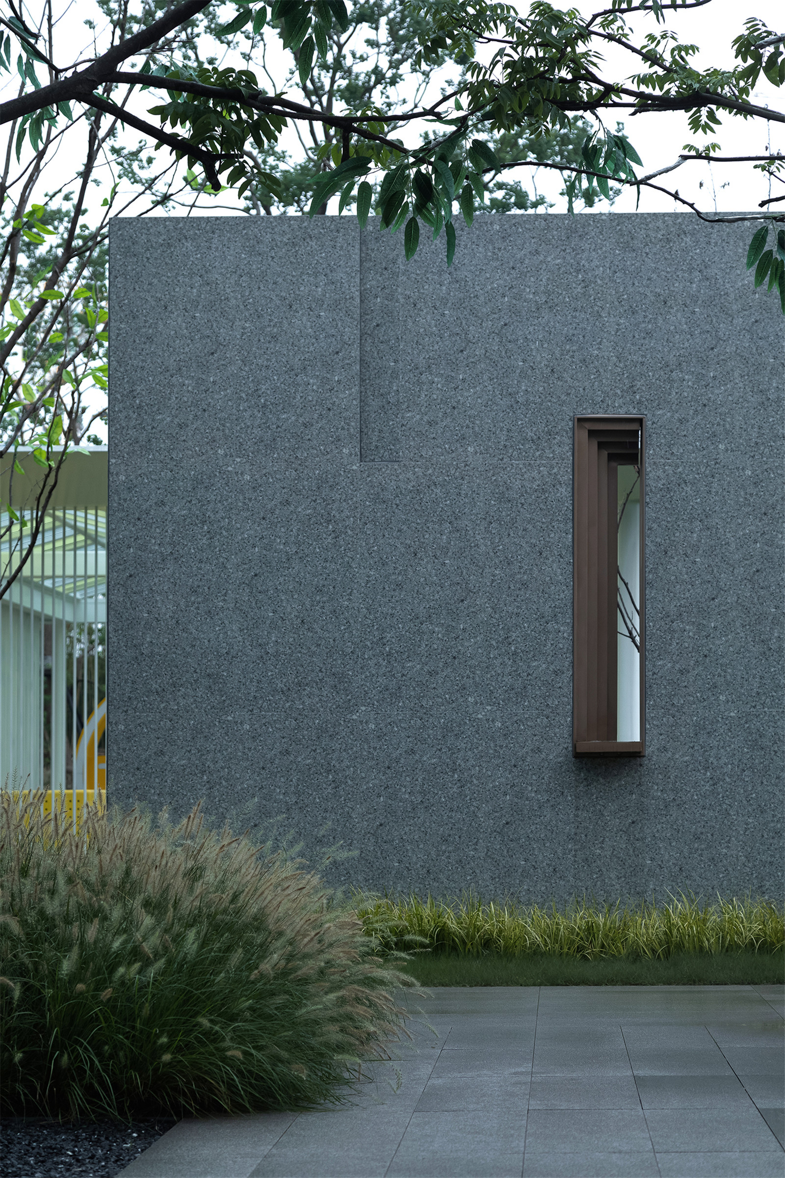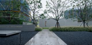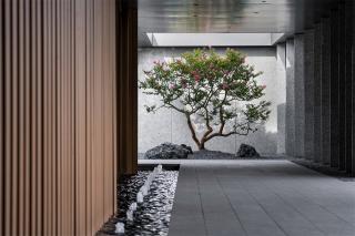 霞光與微風(fēng)穿隙而過,雙向等差漸變的花崗巖板自然圍合成過渡的弧角,環(huán)抱中,一顆質(zhì)樸而綺麗的紫薇,猶如舊友靜候東方。幾塊暗啞的置石隱約傳遞出一方園景之美,人工塑造的「界」在頂部被打開,給予自然向上的生命力量。