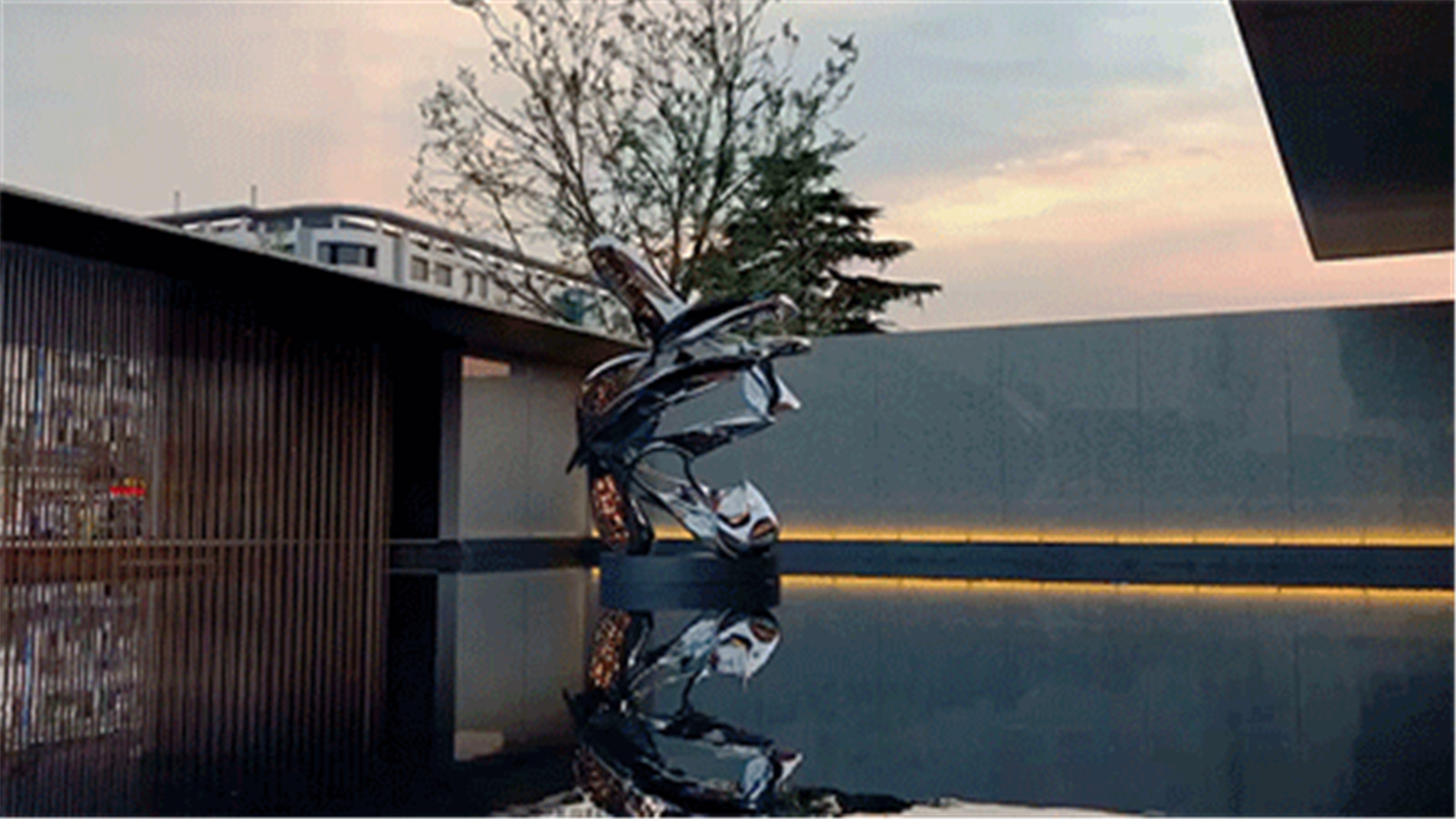 水面一隅,山澗飛鳥騰空盤旋,旋轉(zhuǎn)的感應(yīng)裝置將鳥打造成不斷飛翔的動視,每當(dāng)日暮西沉,銀橙色的光芒撩撥著自在逍遙,心中遠(yuǎn)大的志向和博大的胸襟,托付于包容萬象的山水自然。