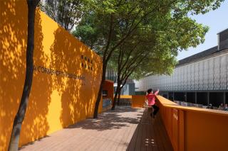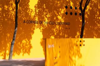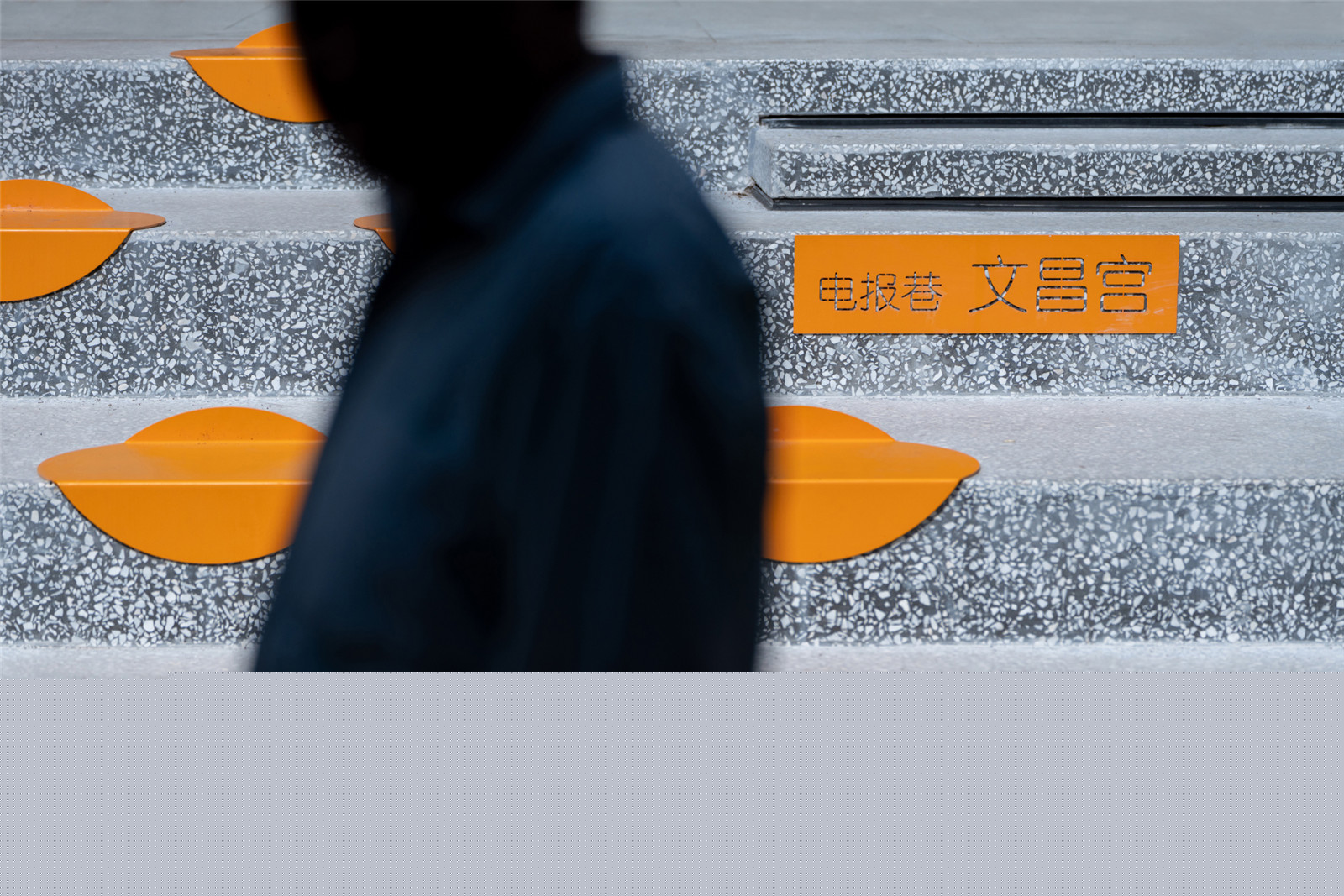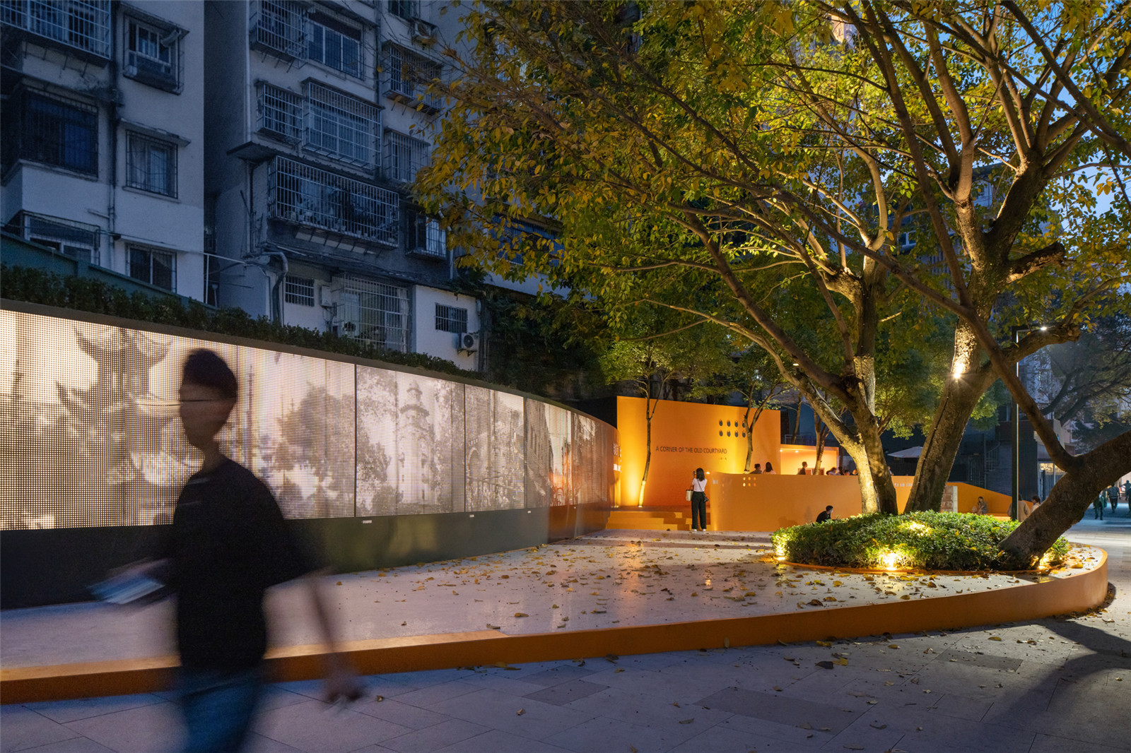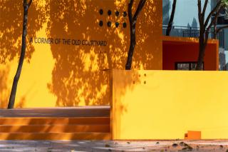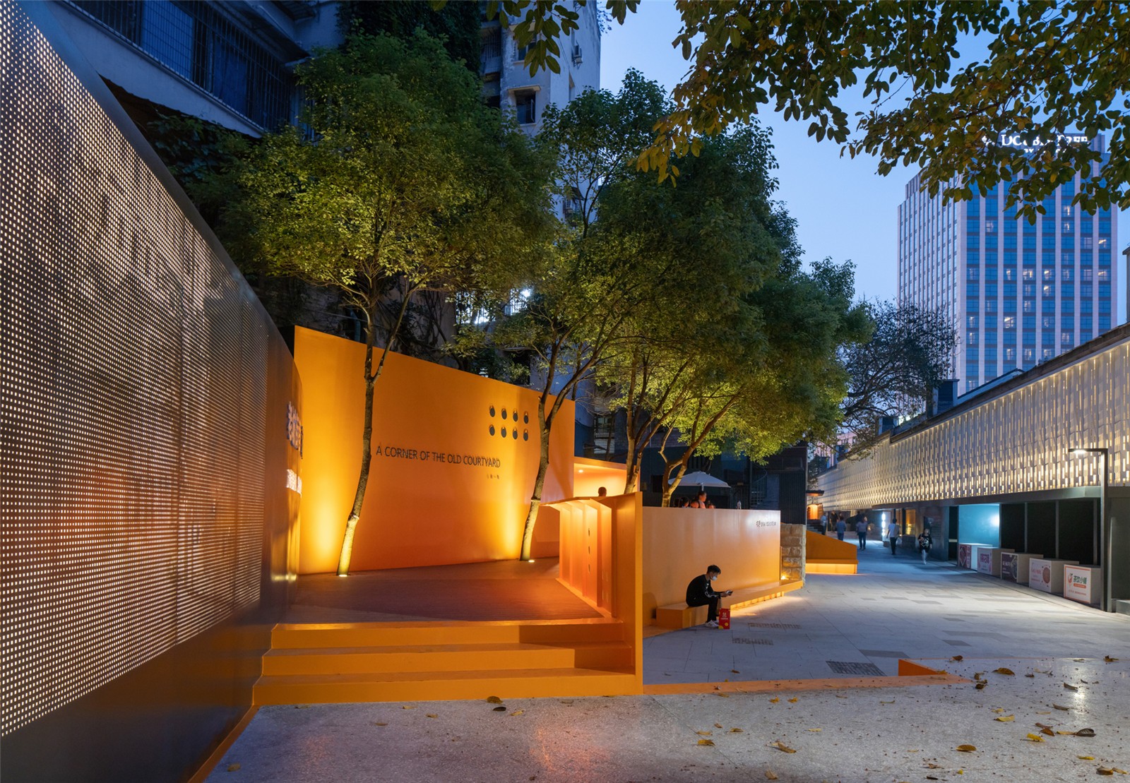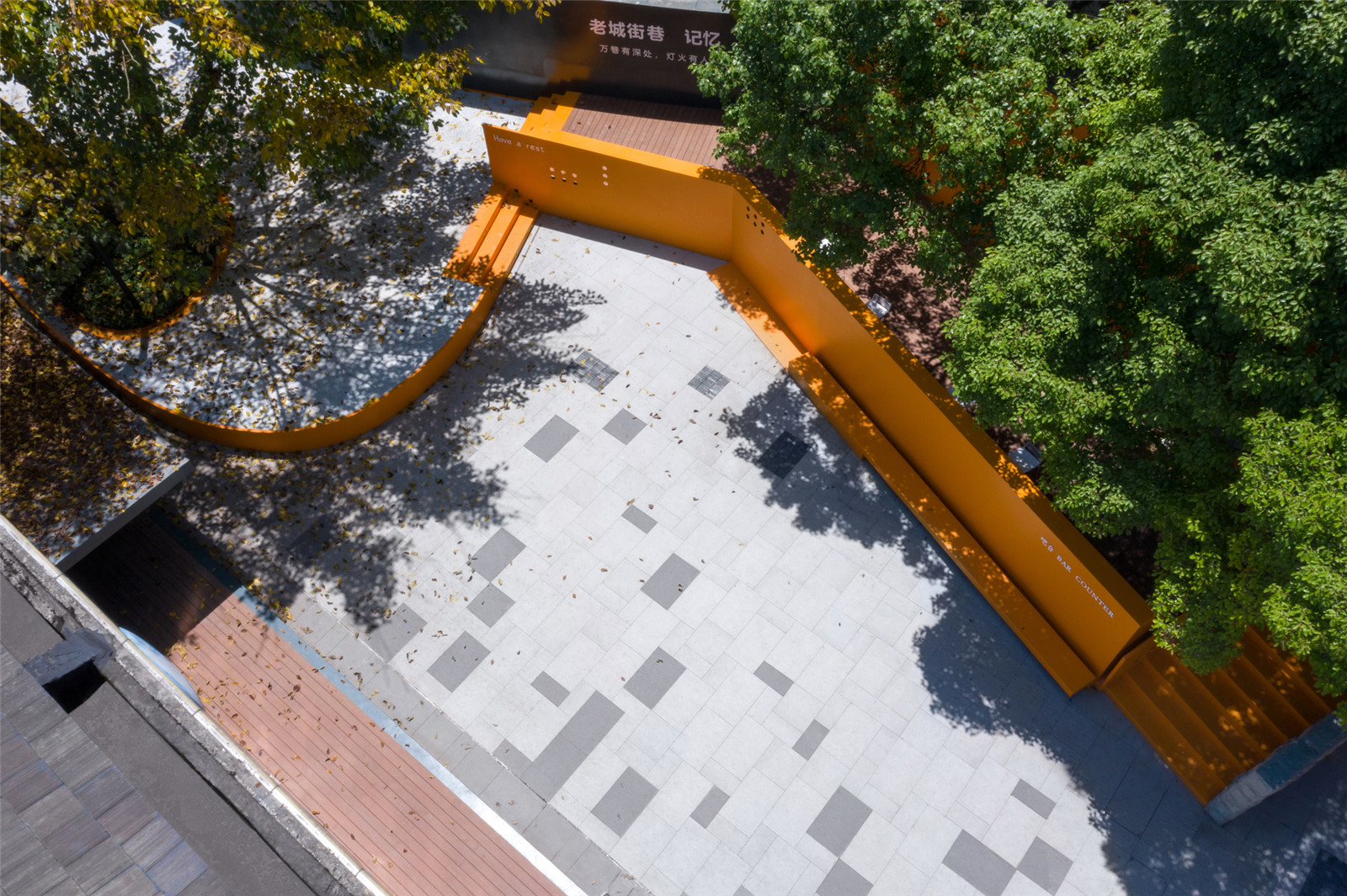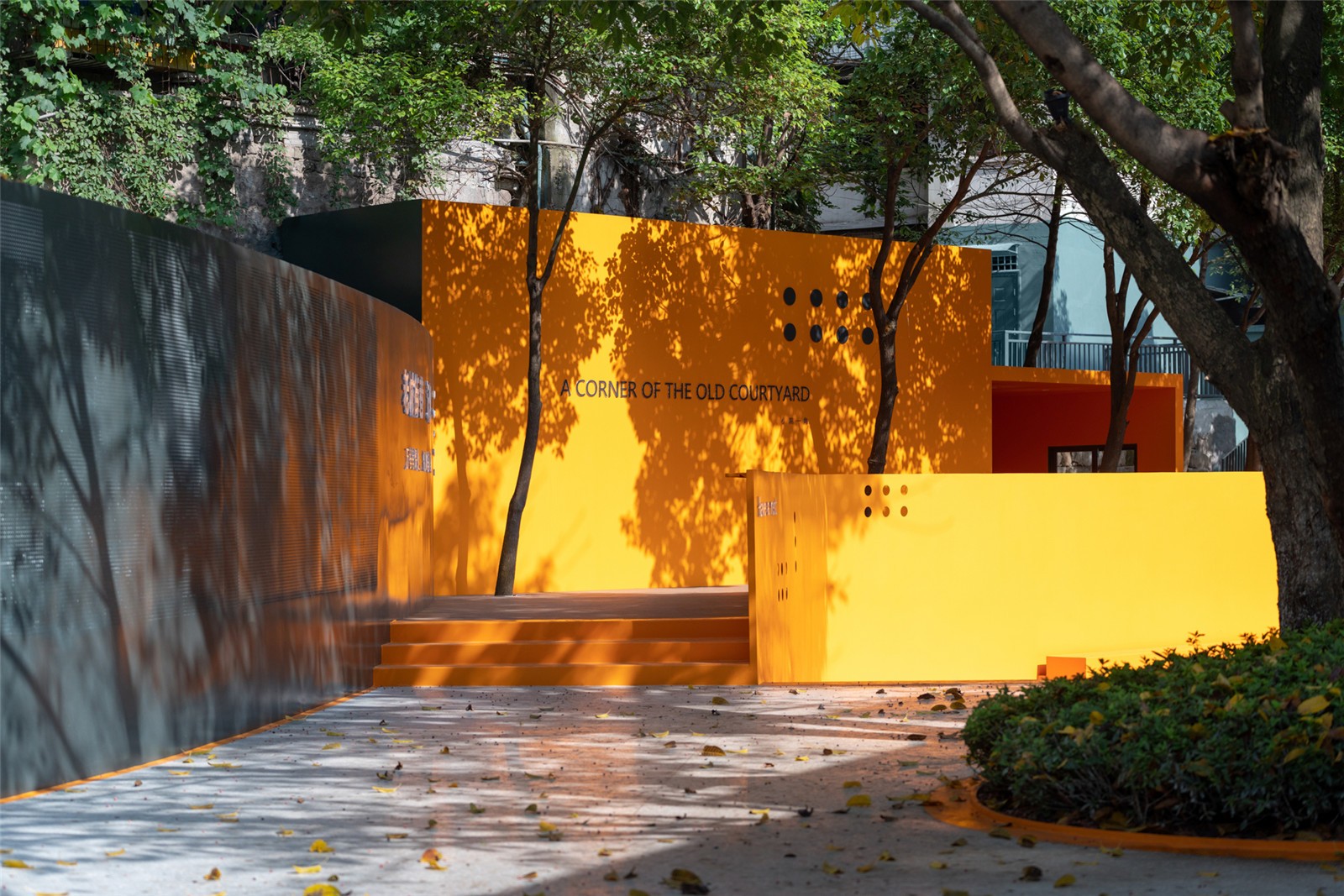 在空間狹長局促的引入段,設(shè)計(jì)對原有雜亂的停車空間做了位移和調(diào)整。甬道空間,我們通過全新的半包裹和側(cè)立面植入文化的手法,形成一個全新的,一個U型半包裹的空間。圍墻四周,青灰與橘黃、米白的色彩碰撞,讓整個巷子極具現(xiàn)代感。