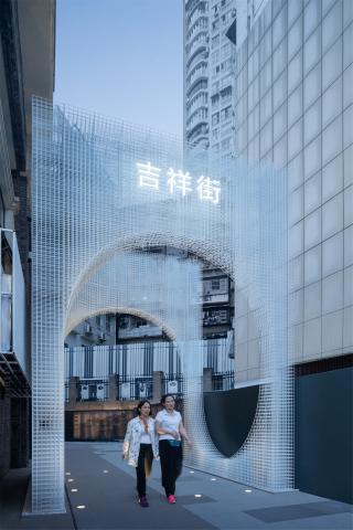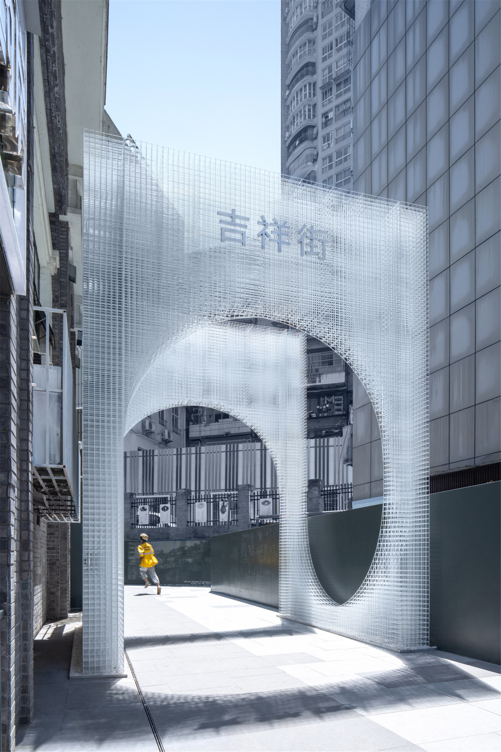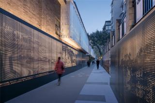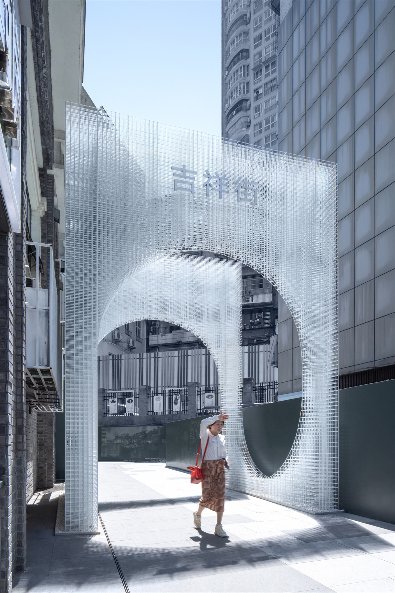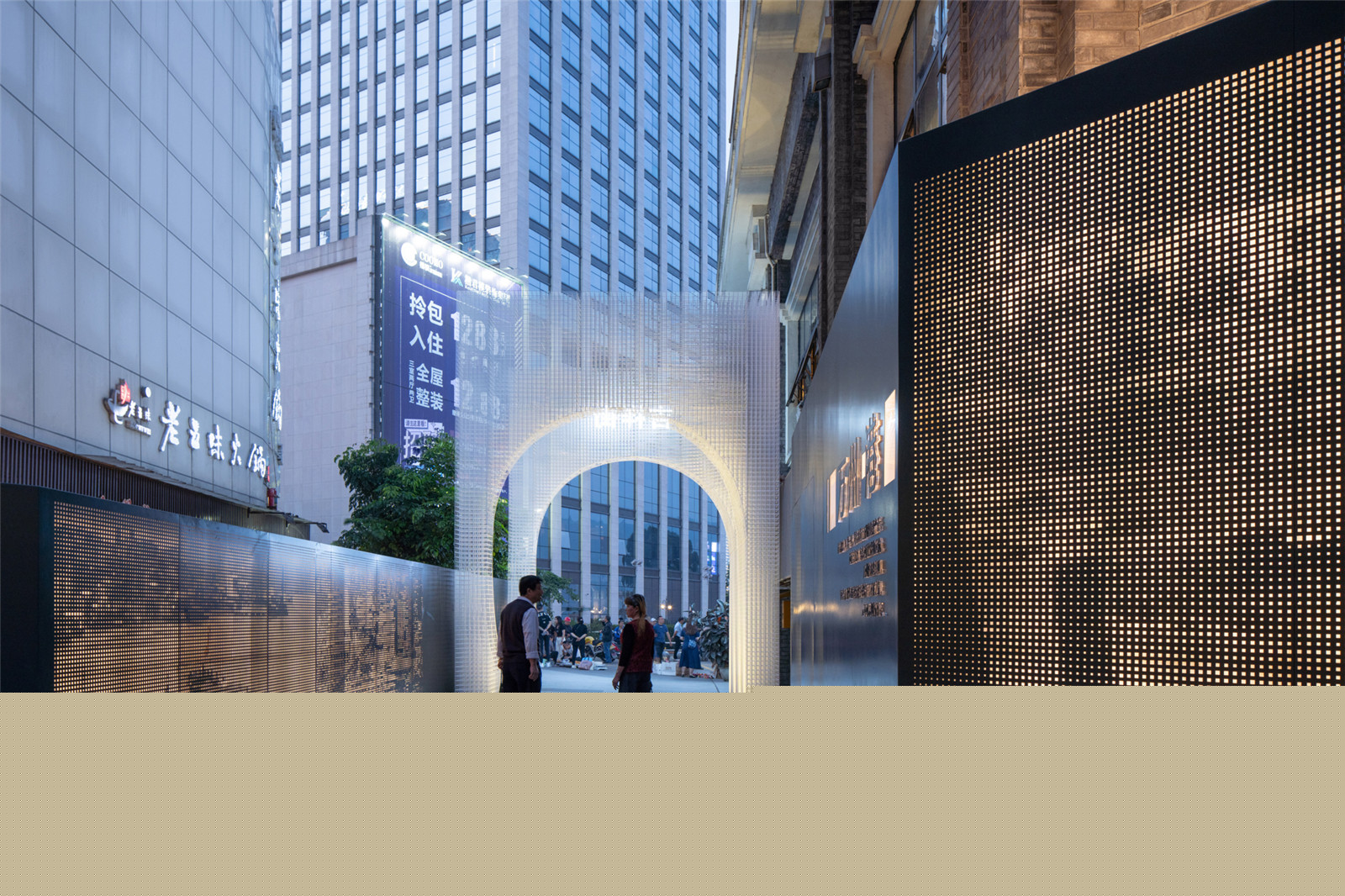 在入口空間用虛影的格網(wǎng)設(shè)計(jì)了拱門,作為進(jìn)入老街的起點(diǎn)。這個梭影之門由30萬根鋼絲組成,選用純潔、超脫凡塵的白色,以包容的姿態(tài),輕盈的形式凝集居民與游客,也在夜晚點(diǎn)亮了萬巷的深處,作為上下半城的聯(lián)系入口,越過這時(shí)空門洞,回望“那些年”萬州區(qū)的文化軌跡,展現(xiàn)著母城過往的生活百態(tài)。