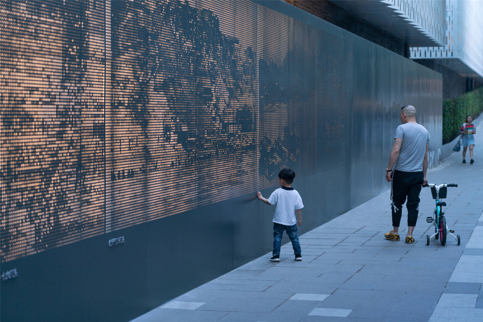 這原本是個很消極的甬道,在夜晚的這個空間里面,沒有燈,很暗,設(shè)計(jì)師結(jié)合文化景墻做整體了透光的設(shè)計(jì),使整個空間呈現(xiàn)出一個很溫暖的甬道空間,讓人們能夠安心的回到自己小區(qū)里面。