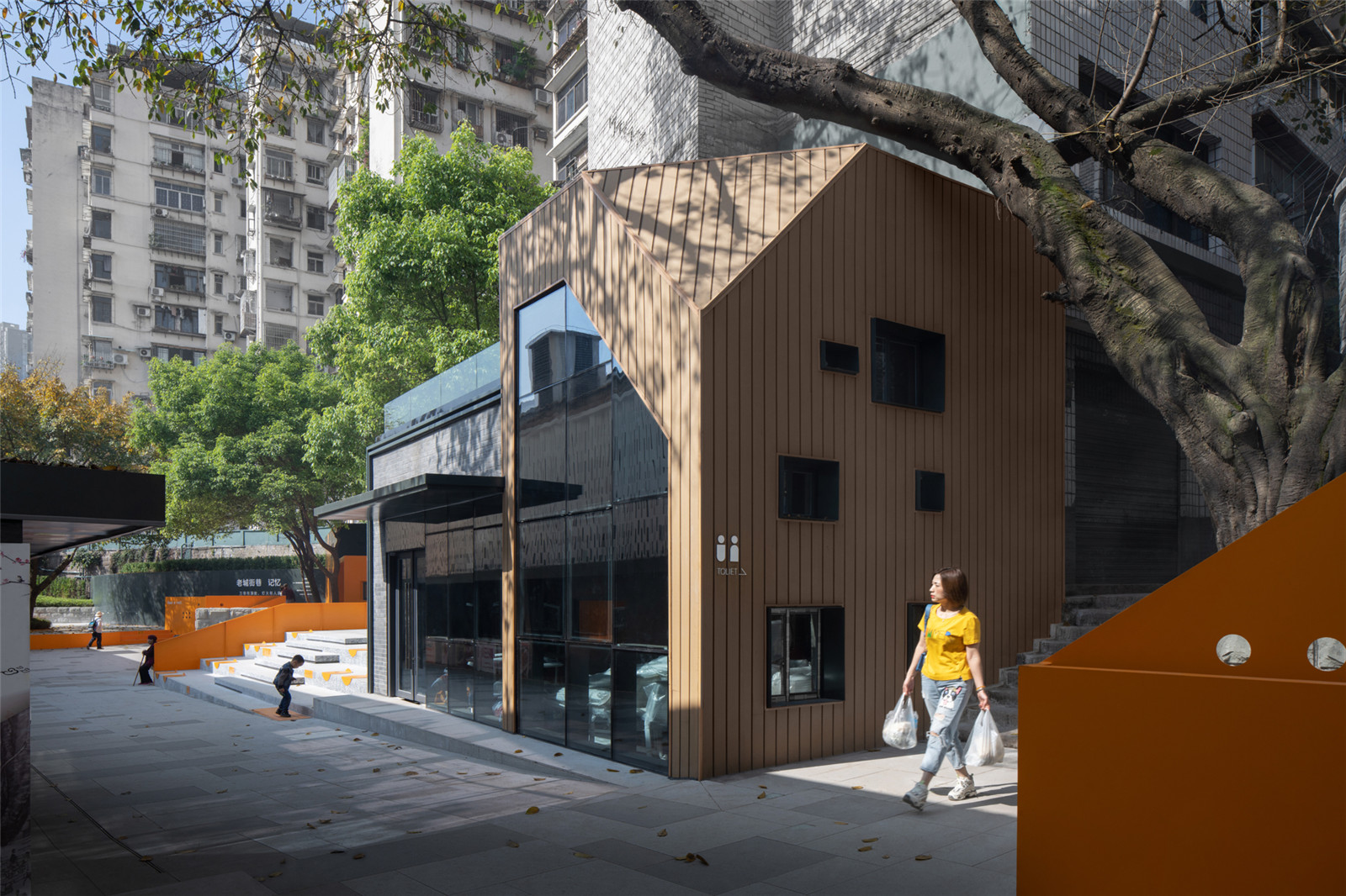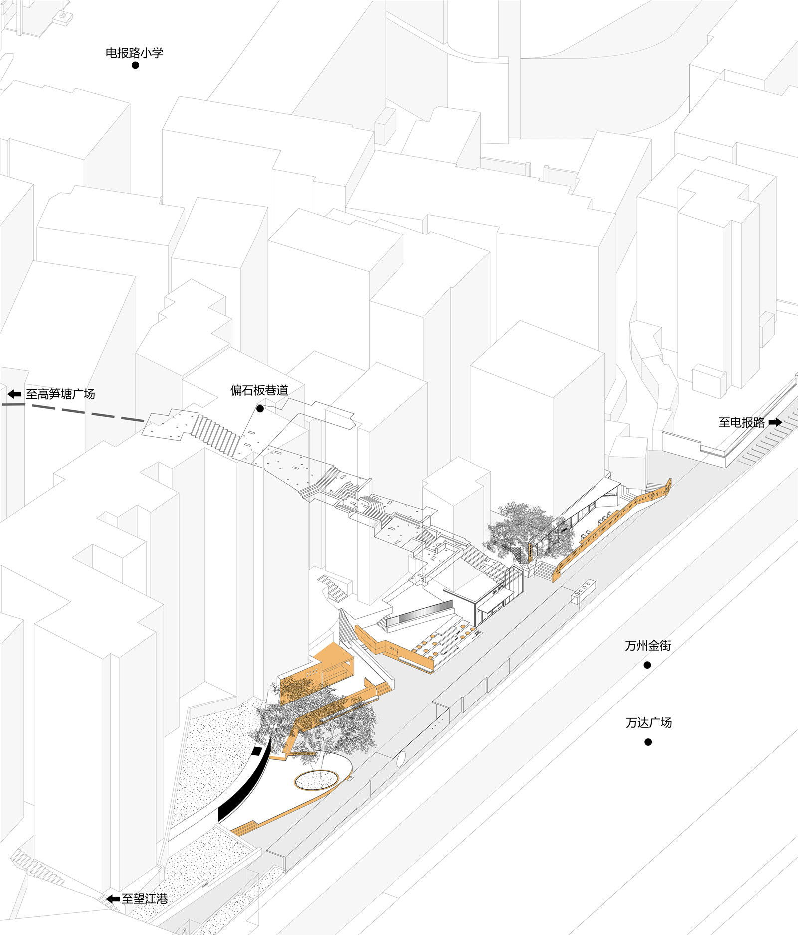 吉祥街是從萬州港至萬達(dá)廣場進(jìn)入萬州母城的一個通道空間,向前連接著繁華熱鬧的萬達(dá)金街,背后是一片老舊的半山居住區(qū),狹窄的巷道向上連接著母城歷史記憶的行署大院。而項(xiàng)目的中心場地是一個附屬于老舊社區(qū)的邊緣背景生活空間,被圍合成一個三角型區(qū)域,兩端通過窄長的甬道與外面的萬達(dá)廣場連接。