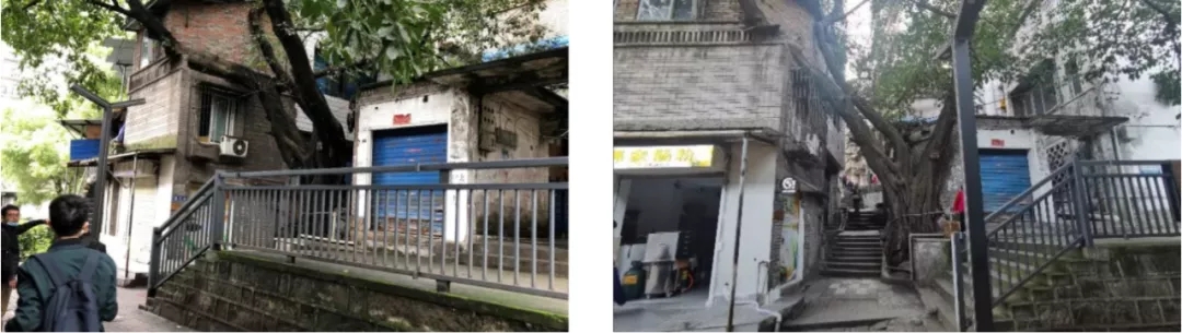 設(shè)計(jì)首先從空間和界面上去規(guī)避和提升環(huán)境臟亂差的視覺形象,臨街老舊的危房,基于成本的考慮,做了拆除,以同面積同位置進(jìn)行恢復(fù),改建成一個小體量的商業(yè)建筑,通過對建筑切角,延續(xù)古樹的生長路徑;并對臨街的居民住宅進(jìn)行代建,尊重原住民的生活方式,對建筑外立面進(jìn)行了最大程度的保留,局部做飾面改造。