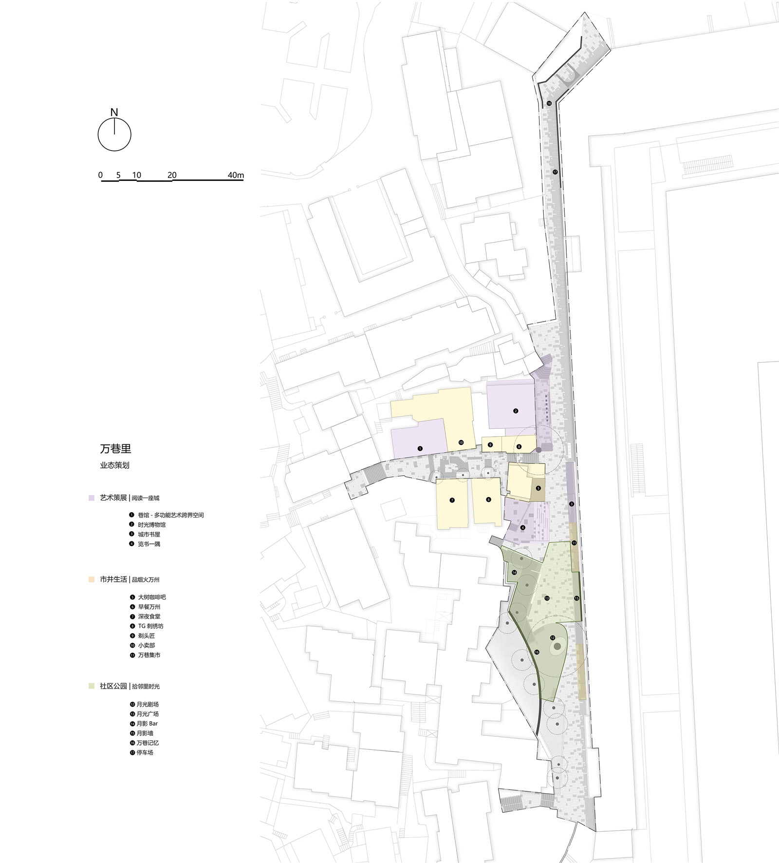 它和過去之間仍然有一個紐帶,因?yàn)榫用襁€在這里,過去的那個空間結(jié)構(gòu)還在這里。我們通過景觀的手法將過去的記憶置入到場地里,連帶出來更多的記憶,場地跟過去有連帶關(guān)系,而不是一刀切, 把過去和現(xiàn)在完全切斷,形成了一個完全新的東西,那就失去了老街原本的味道。另外,還有不一樣的點(diǎn)就是商業(yè)的控制度,很多老街商業(yè)化過于嚴(yán)重。在老街巷中商業(yè)是因?yàn)樯钚枨蠖a(chǎn)生的業(yè)態(tài),它是點(diǎn)狀而非片狀存在的。對于舊城改造,我們提倡的是為了生活而商業(yè)。