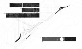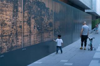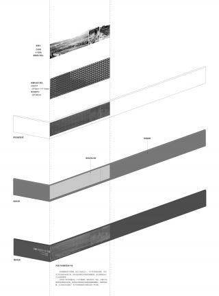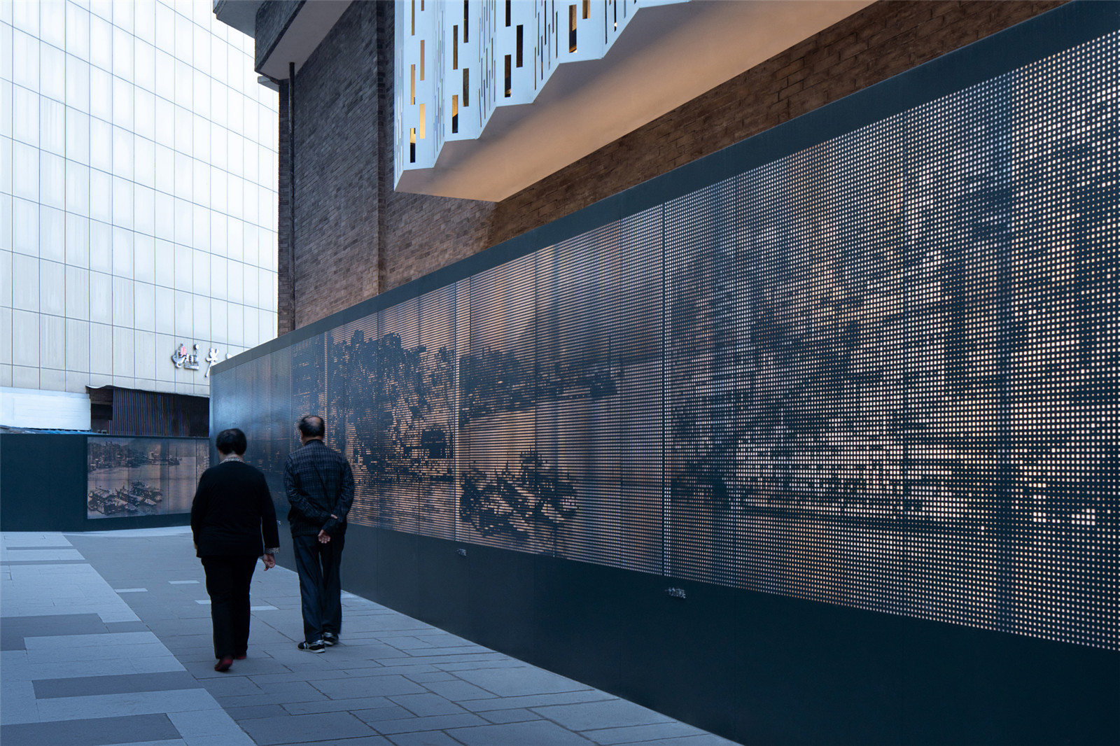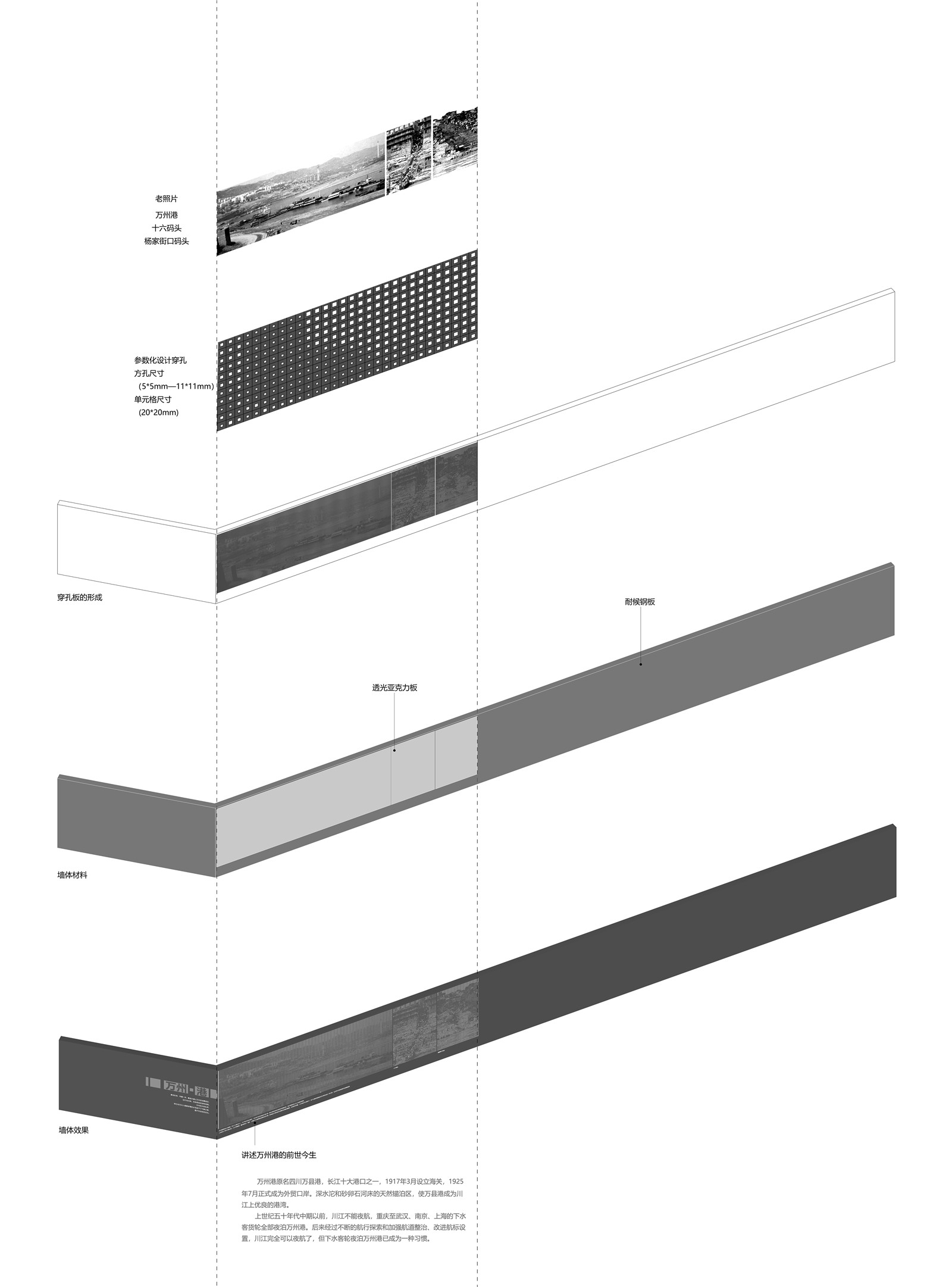 以多重文化記憶的載體,參數(shù)化的形式與鏤空鋼板景墻的設(shè)計(jì),當(dāng)人們遠(yuǎn)看的時(shí)候利用反射可以看到過去老城的風(fēng)貌,以前的萬州港、西山鐘樓的繁榮景象,增加了文化底蘊(yùn),喚起人們對萬州過去的記憶。