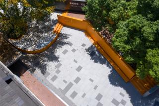 將咖啡店與外部的階梯區(qū)域整體打造成覽書一隅的休閑生活空間,水磨石打造的大階梯,解決原有的場地高差,局部點(diǎn)綴著黃色鋼板的圖形,豐富的階梯式坐凳空間。