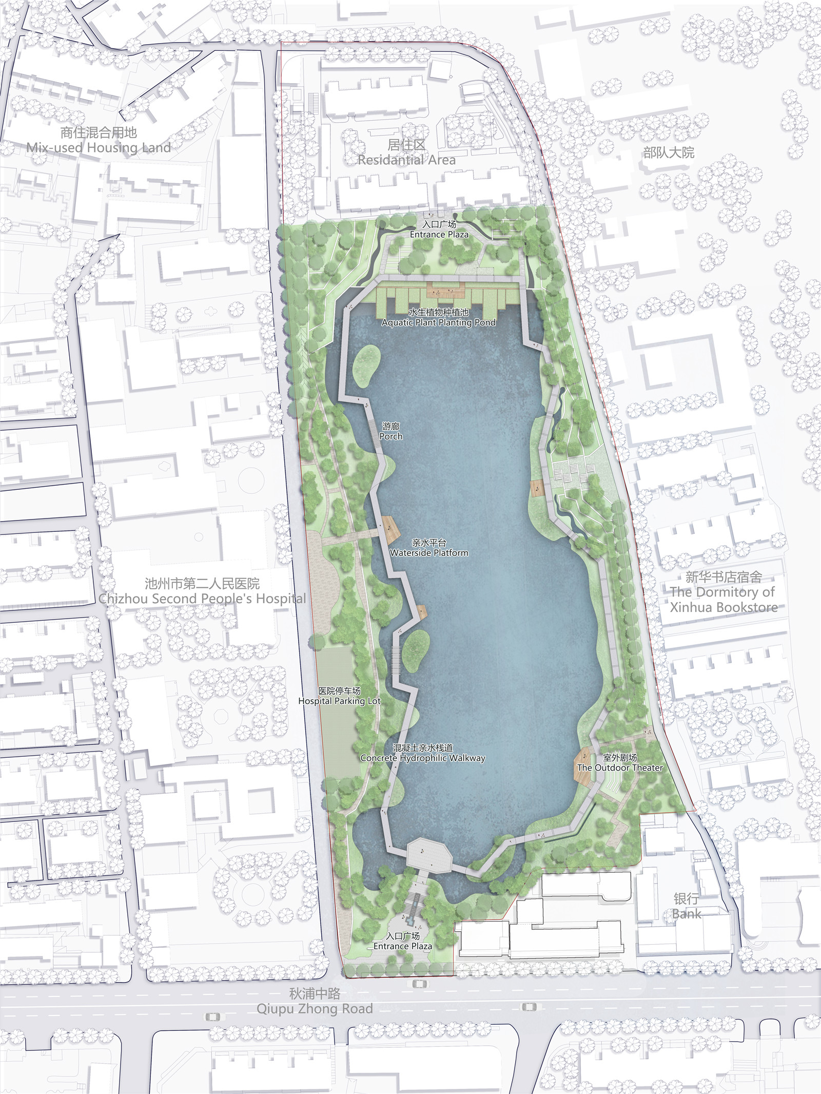 Tight enclosure of the whole site by hospital’s fences, dormitories, illegal buildings, etc., as well as the huge height difference between the pond and the municipal elevation, formed the initial impression of the site as inaccessible. Although it is located in the downtown area, it is actually an "enclave" known by people. Firstly, we began to think about whether we could turn this small place into a water-engaging open space with daily natural features, which could be accessed and used easily every day, thus turning a negative space into a positive and participatory space. Secondly, we also thought how to improve water quality, build a sponge-like constructed wetland, and solve the problem of rain and flood management in the area.