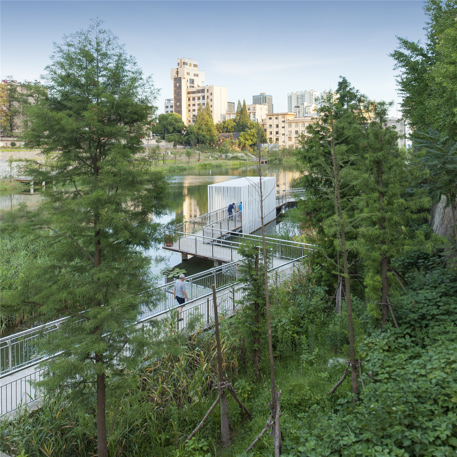 As it is viewed on the floating square into a distance, a circular trail floating above the water runs through the whole water edge. Because of the height difference between the water body and the city, most of the space is below the surrounding. Metasequoia maintained and other plants newly planted on the site form a green barrier interface, which temporarily separates the whole water surface space from the outside world. The trail shuttles along the shore, in the water and among the plants, with different views in different locations. Post-dinner walk in the park could refresh you with the breeze and the natural frogs croaking sound, as well as the star lights interspersed overhead. People could enjoy the relaxation physically and mentally even if they have exposed to such a natural environment shortly in their daily lives.
