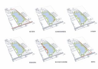 The vertical revetment between the existing hospital and the water body on the west side is just like a vertical crack that interrupts the continuation of the green basement. In order to form a water-engaging loop, emergent aquatic plants and green island are used to realize the green connection on the west side of the park. The water-engaging trail is independent of the revetment, winding in the plants, creating ecological poetry of constructed wetland together with the intermittent resting terraces and simple white porch. The winding walk trail makes people slow down; the plants with different heights on both sides bring people different visual impressions; and the white corridor creates the changes in light and shadow during the day, and is also the focus of attention on the shore during the night. Occasionally, people fish on the water platform, and they can also have some daily gains.