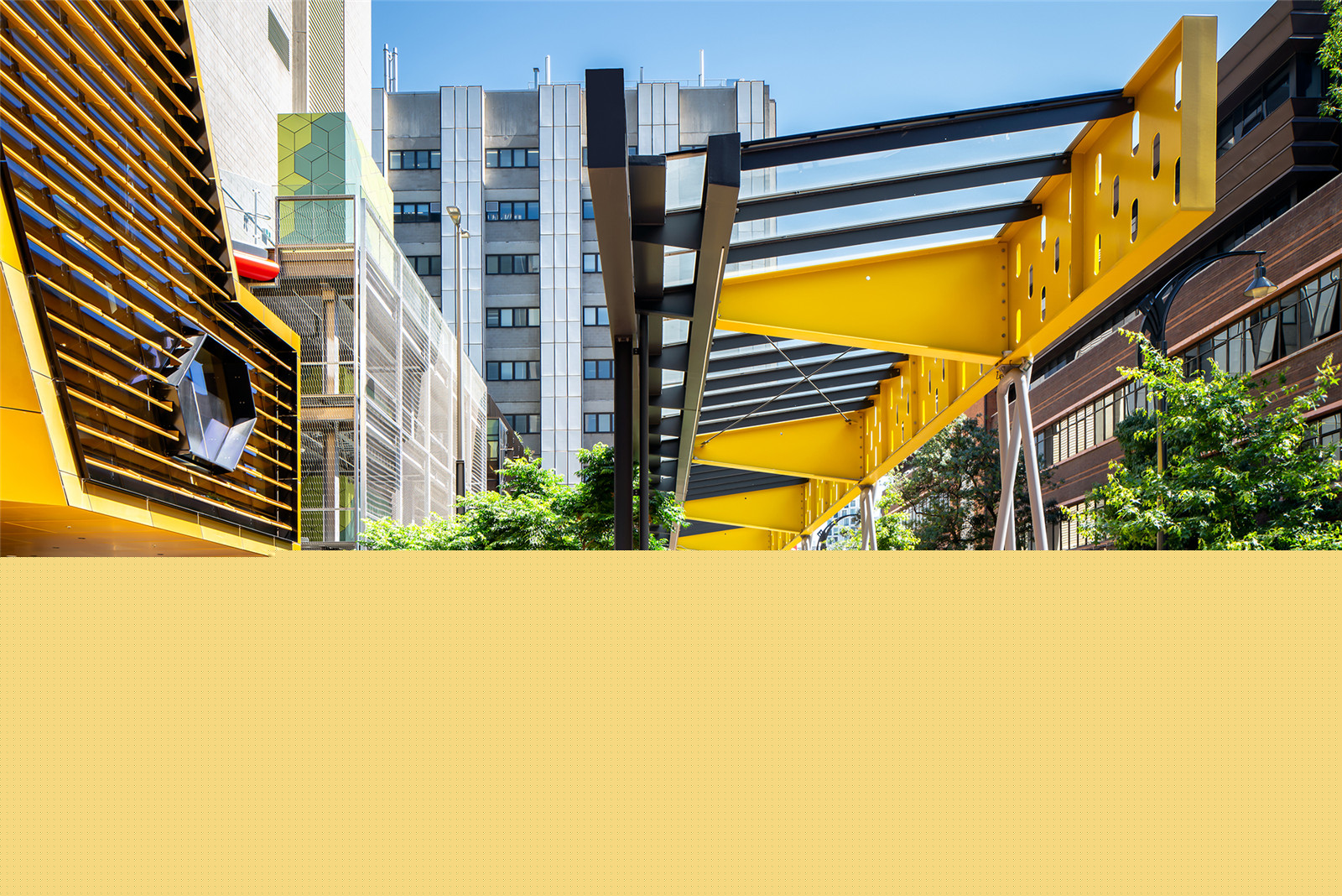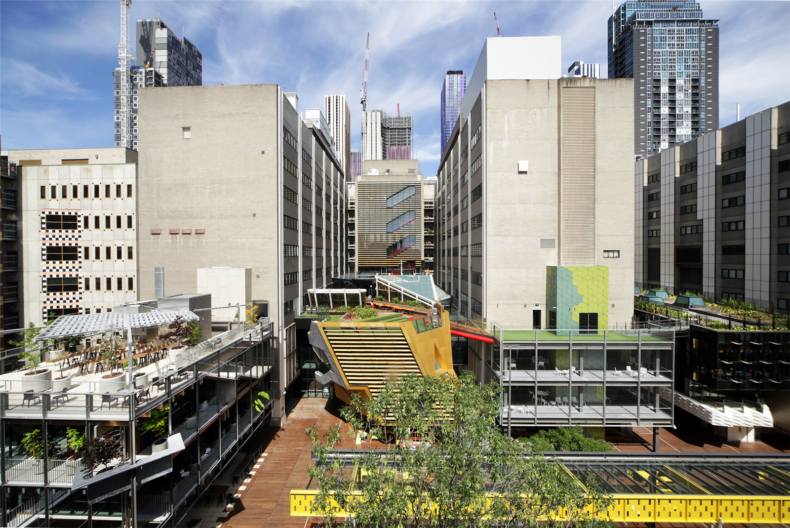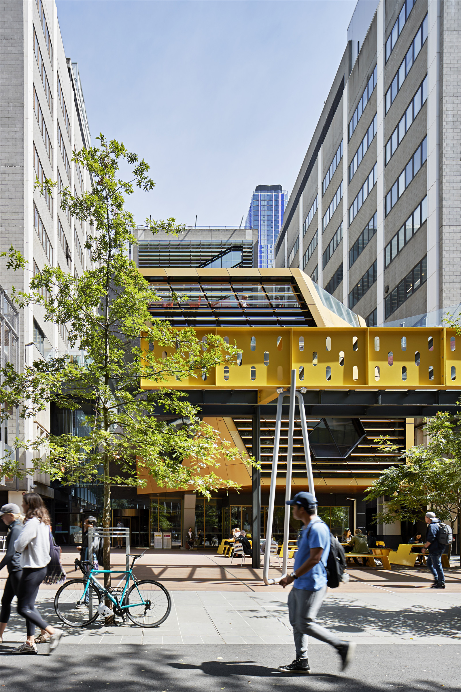 The integration of the Yellow Beam in consultation with Peter Elliott Architecture and Urban Design was an important legacy element. It was considered carefully as a new urban walkway; as a connecting and unifying structure. It also provides shelter on rainy days.
