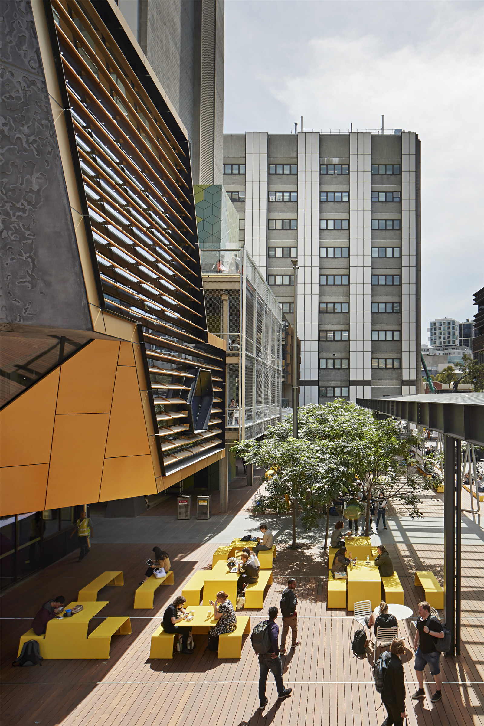 The Bowen Terrace consolidates this precinct as the heart of the City Campus via a generous urban platform that has become a setting for student life. A new timber terrace is now host to events, graduation celebration, student clubs, markets, food and beverage services, as well as informal seating spaces.