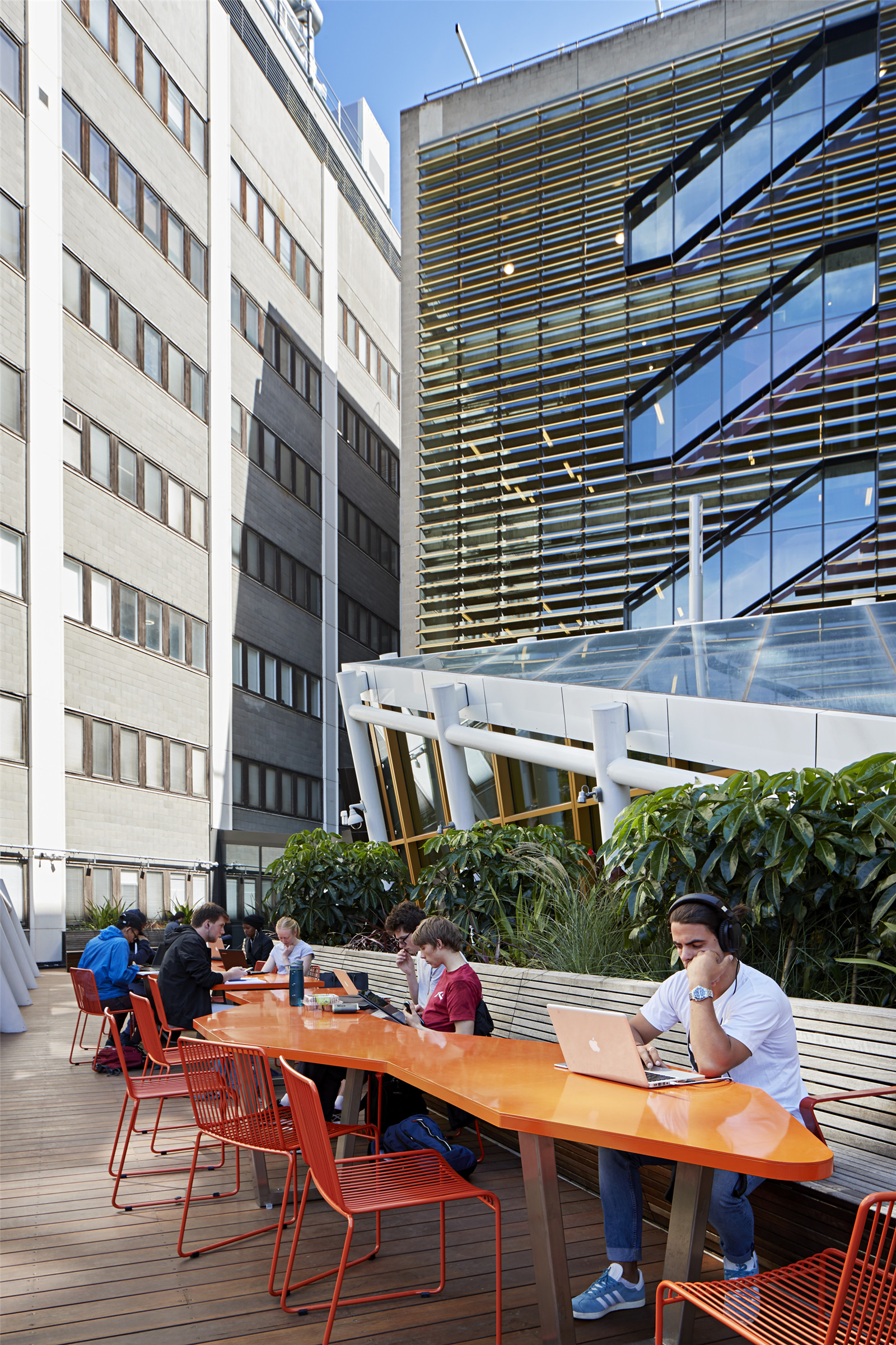 這些露臺與鄰近的屋頂花園相連,通過沉浸在更茂盛的植被中,創(chuàng)造出了更為安靜的學習環(huán)境。