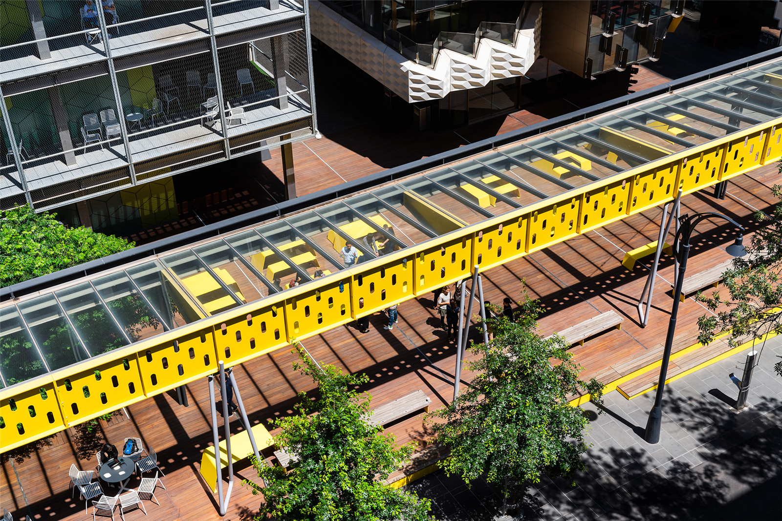 在咨詢過Peter Elliott建筑與城市設計公司后,黃色梁架的整合作為重要的場地歷史元素被保留下來。通過仔細考慮,將它作為了新的城市步道,是起到連接和統(tǒng)一功能的結(jié)構(gòu)元素。它還是雨天的庇護所。
