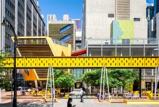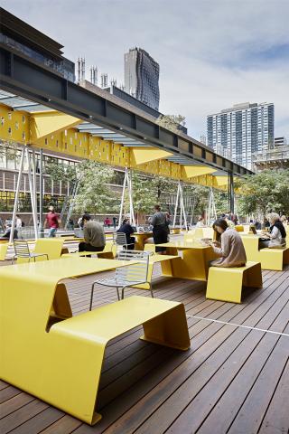 由TCL設計的造型大膽的座椅,極為吸睛,與重新安置的黃色梁架相得益彰——這個梁架最初是由Peter Elliott設計的防雨棚。場地原來的楝樹如今被種植成一片提供陰涼的小樹林,并與城市平臺相呼應。
