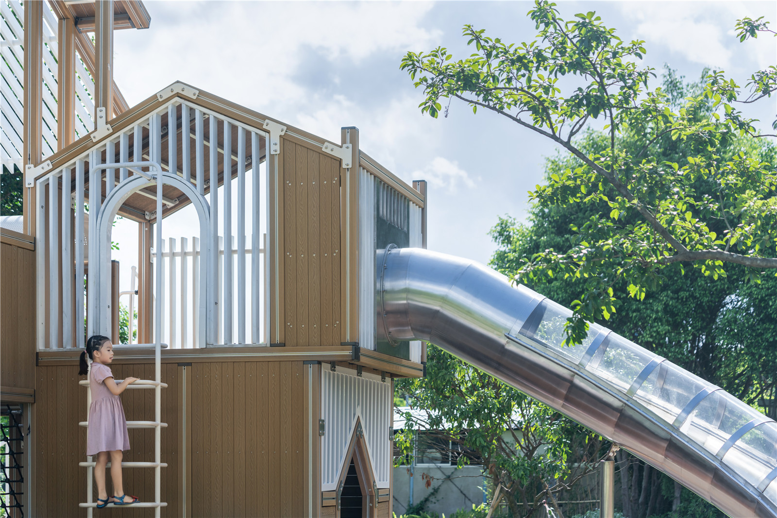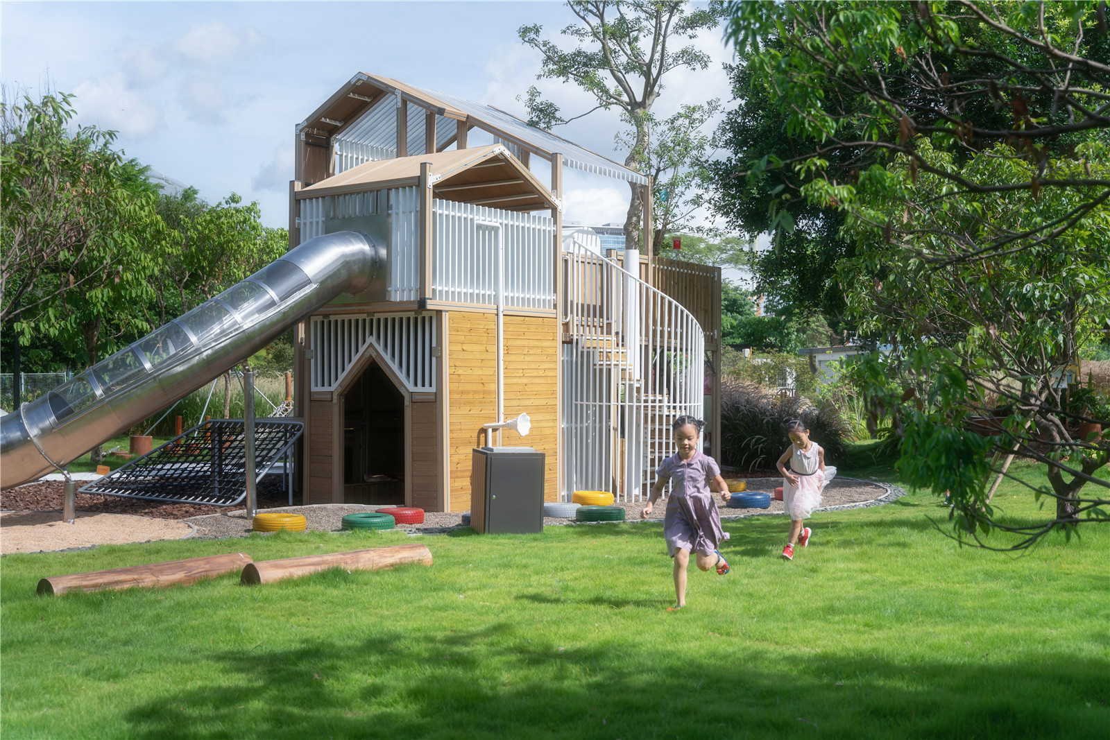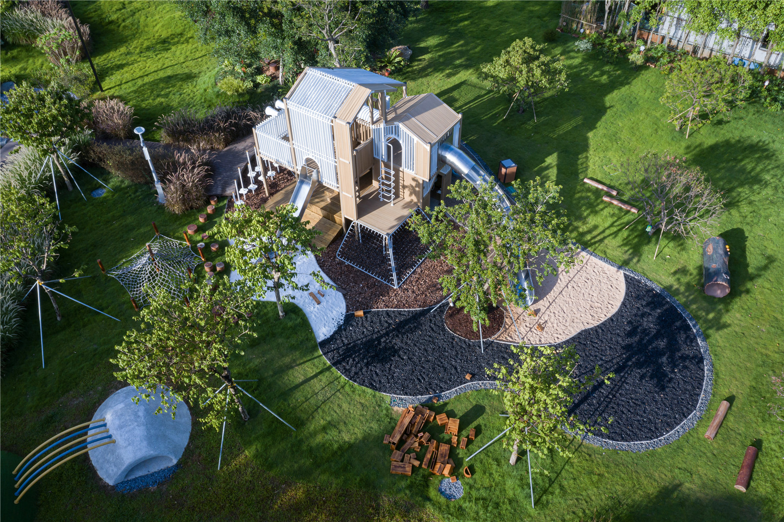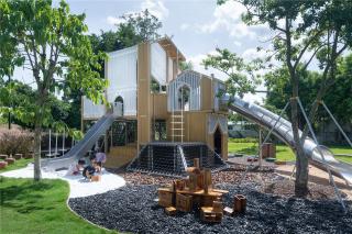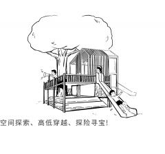 Different from ordinary projects, the children's natural module design of Vanke Construction Research Center adopts more different design methods and materials, landing on the same site. The function of the module can be observed and studied by observing the children's use of the facility. For example, for the same sand pit function, we used five materials of general sand pit, namely yellow sand, white sand, black pebble, sawdust and fine gravel, to carry out the experiment; in the drilling barrel module, we designed several "slopes" with similar volume but slightly different playing methods according to the space requirements of climbing, crossing and hiding. Every child hides a dream tree-house in own heart, there they could play hide and seek, cross the channels, explore the treasure with other kids, there they have the own secret base.