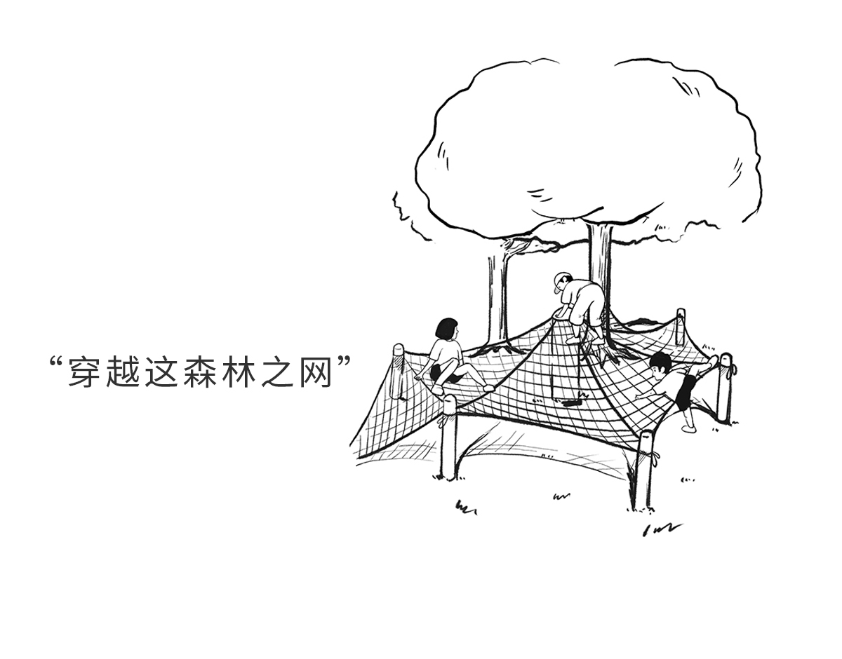 This is a very special research trip. When the project landed, the designer came to the site of the base, just like the scene in his mind before. He played with the children for a whole day. He jumped up and down the tree house with them, ran freely in the green slope, called loudly in the echoing mounds, and crossed the secret passage of vines with the children In, as if back to their own happy childhood...