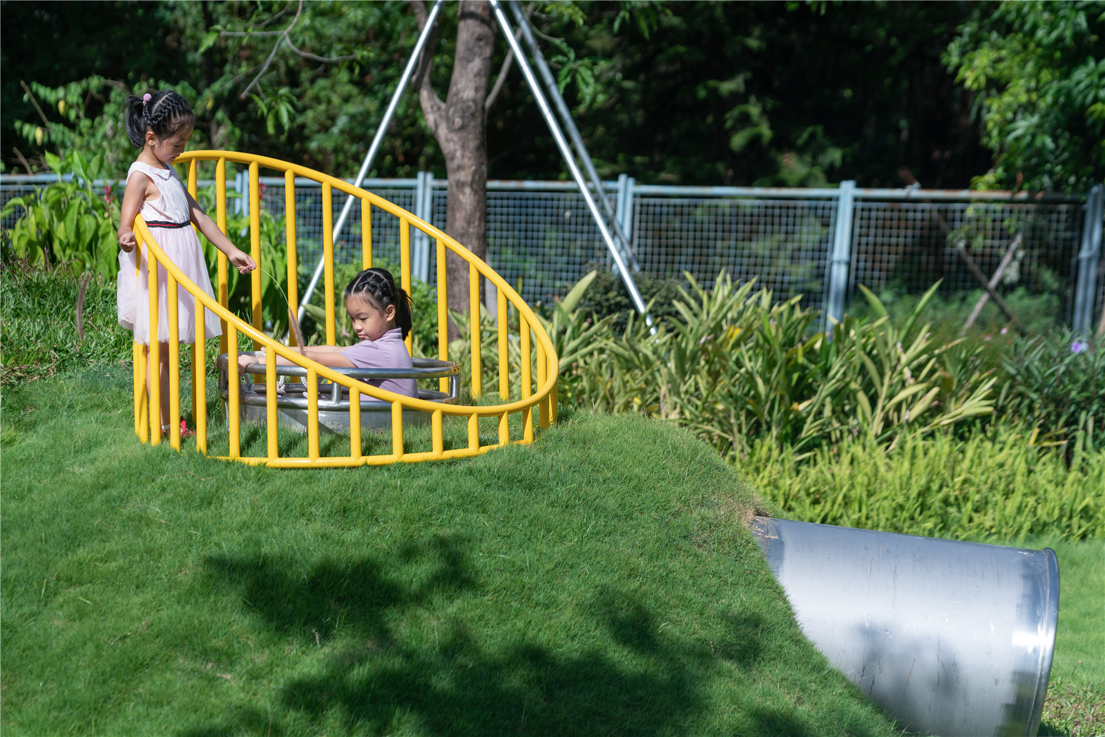 這是一場(chǎng)非常特別的研究之旅,項(xiàng)目落地之時(shí),設(shè)計(jì)師們來到基地現(xiàn)場(chǎng),一如之前腦海里想象中的場(chǎng)景,和孩子們一起盡情的玩了一整天,與小朋友們一起在樹屋之中興奮的上竄下跳,自由的在綠坡中奔跑,在回音的土丘中大聲呼叫,和孩子們一起穿越在藤蔓的秘密通道中,仿佛回到自己快樂的童年……