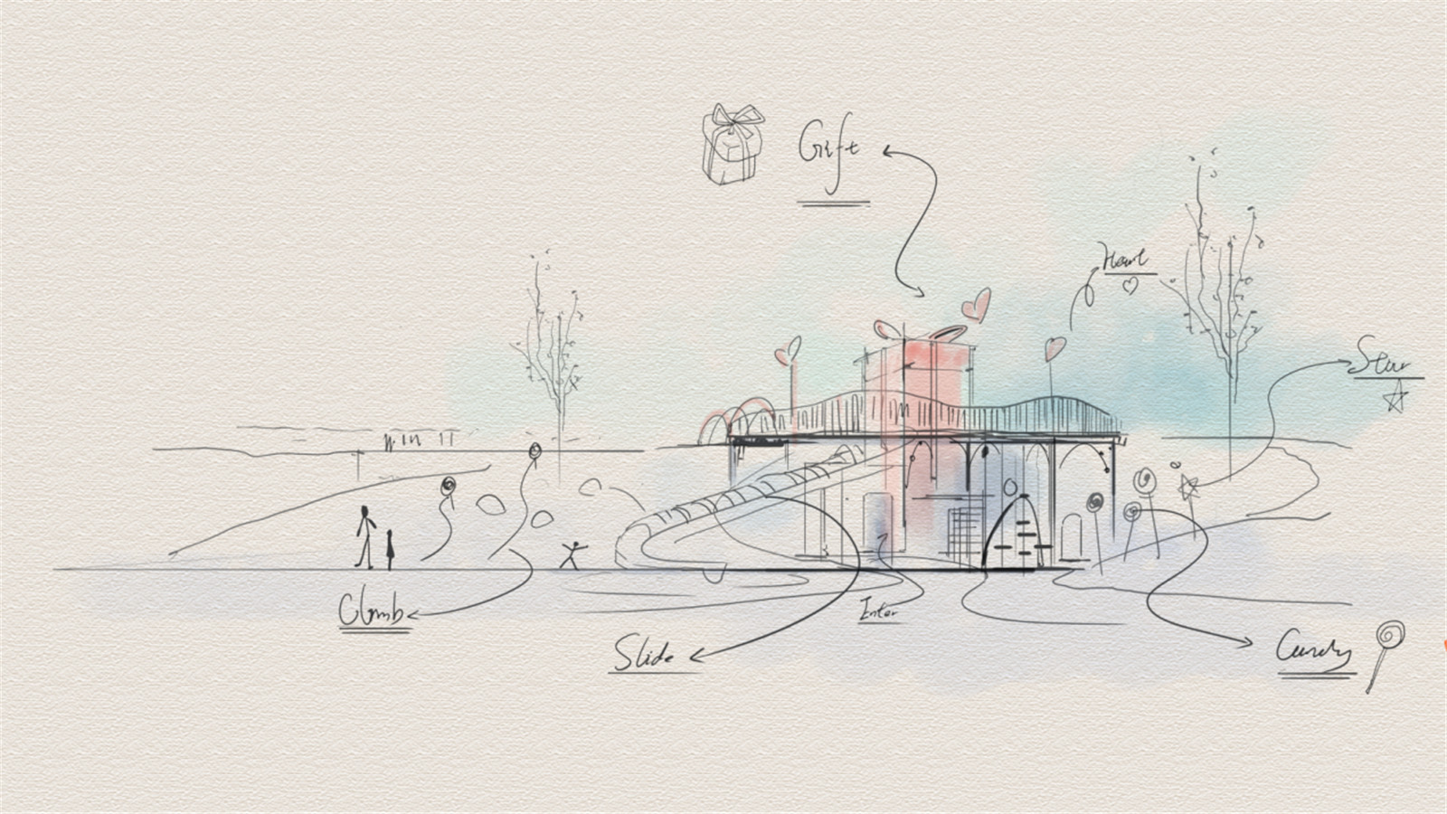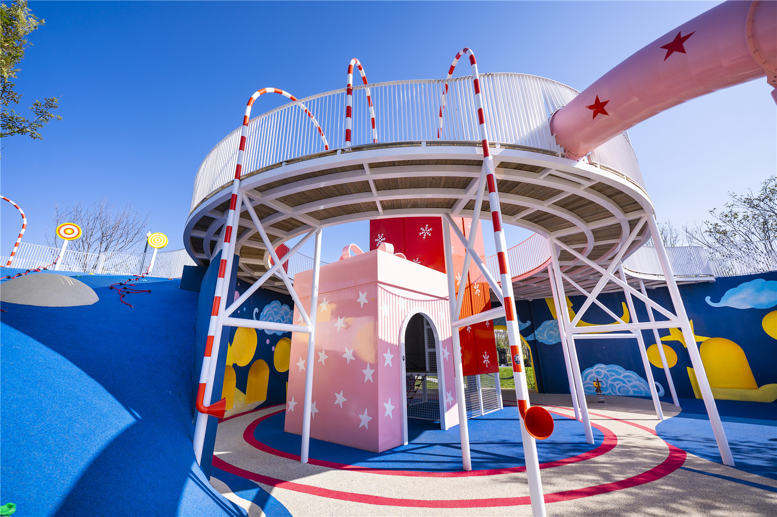 追溯的孩子們內(nèi)心對“禮物”的渴望,我們對各類禮物本身進(jìn)行一個(gè)肌理的提取,將肌理重組、疊加、再組合、融入整個(gè)場地,將整個(gè)場景與禮盒ip融為一體,同時(shí)對童話故事中的夢幻色調(diào)進(jìn)行提取,貫穿到整個(gè)設(shè)計(jì)之中,打造具有藝術(shù)創(chuàng)新的親子共融游樂空間。