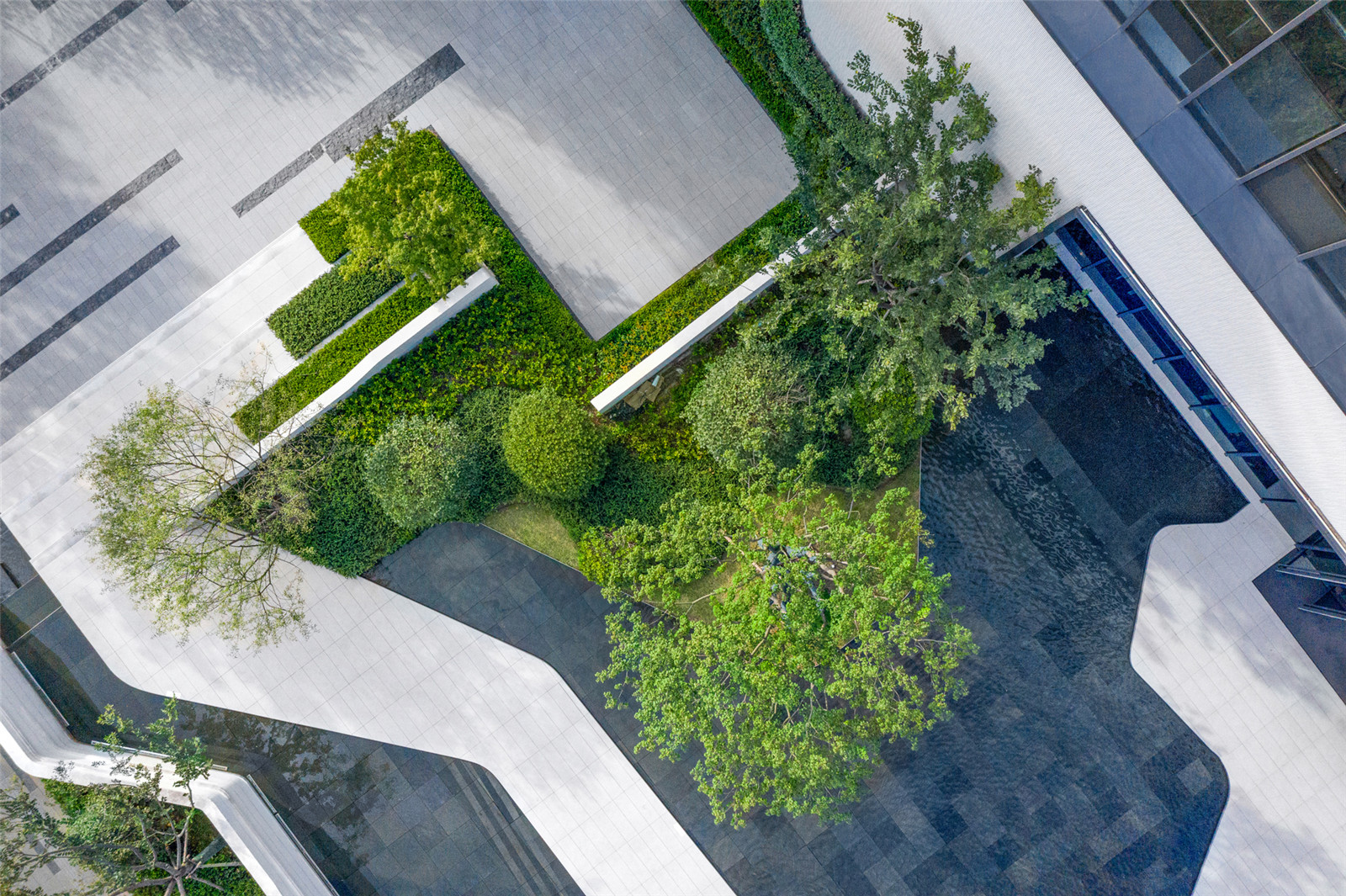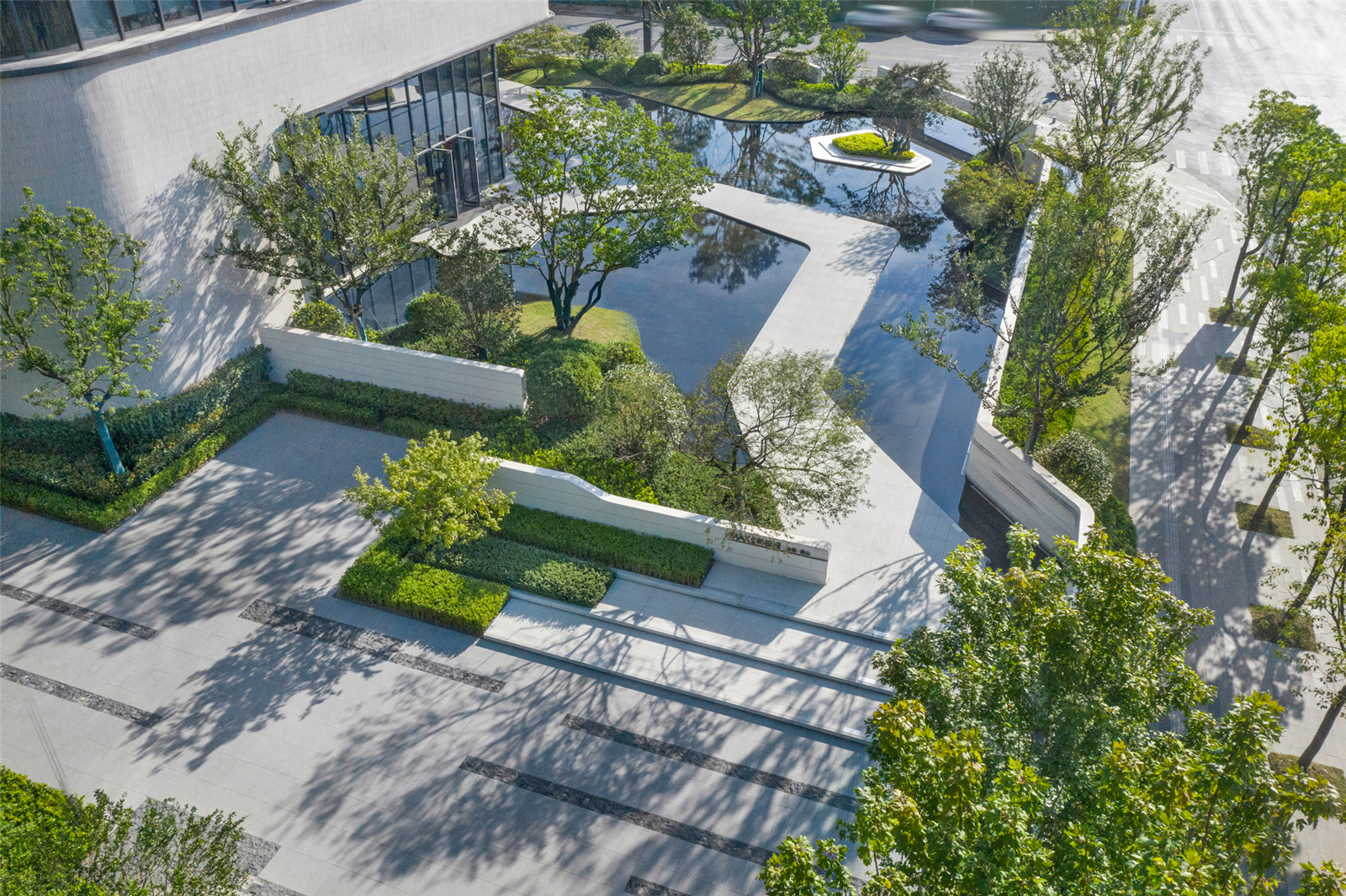 ▼街角的主題水景和透空的景墻