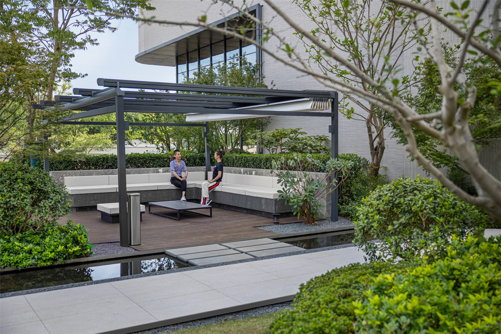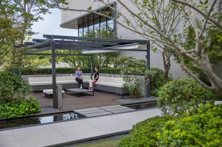 洽談區(qū)位于招商中心東側(cè)的一個(gè)浮島之上,三面植物圍合不僅形成安靜的空間氛圍,更帶來了更好的私密性,廊架的設(shè)置也提高了洽談區(qū)的使用效率。