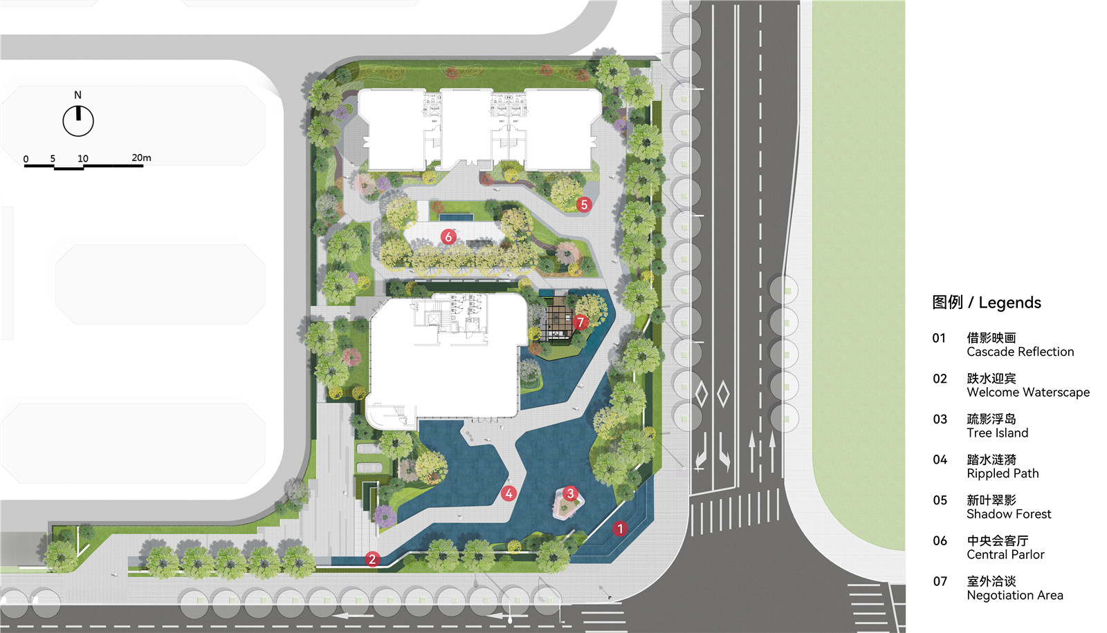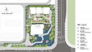 根據(jù)參觀動(dòng)線及建筑可以清晰劃分出不同尺度節(jié)奏的四個(gè)主體部分:入口的樹陣引導(dǎo)區(qū),招商中心建筑前的品質(zhì)感前庭區(qū),樣板樓與招商中心間的花園中庭區(qū),招商中心東側(cè)的臨水洽談區(qū)。