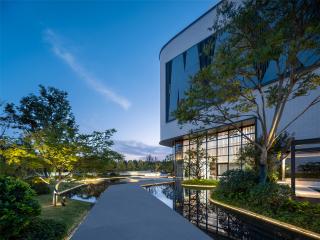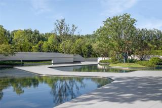 小徑蜿蜒向前,目光所及之處是純凈的水面與漂浮于其中的大大小小的島嶼。點(diǎn)植的植物,造型婀娜婆娑,秋天則會(huì)在黃、紅、紫之間斑斕,為空間增加更多的觀賞性和體驗(yàn)感。伴隨前行,建筑在植物的掩映中逐步顯露出來。