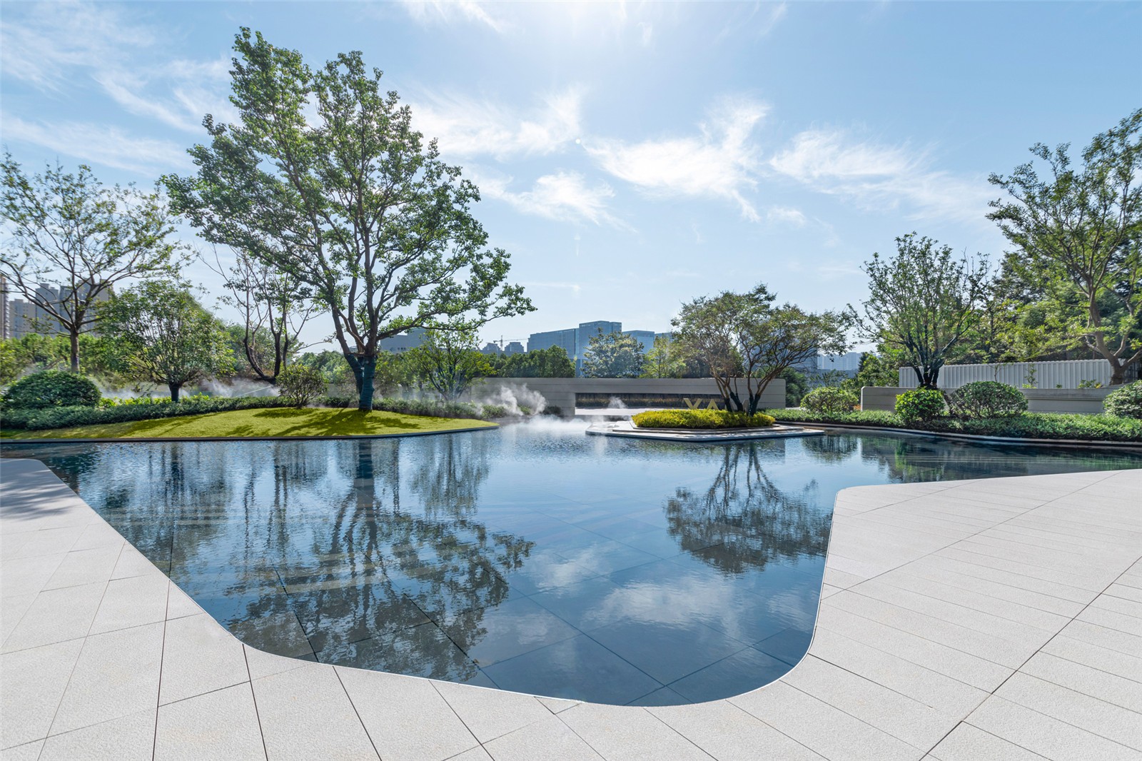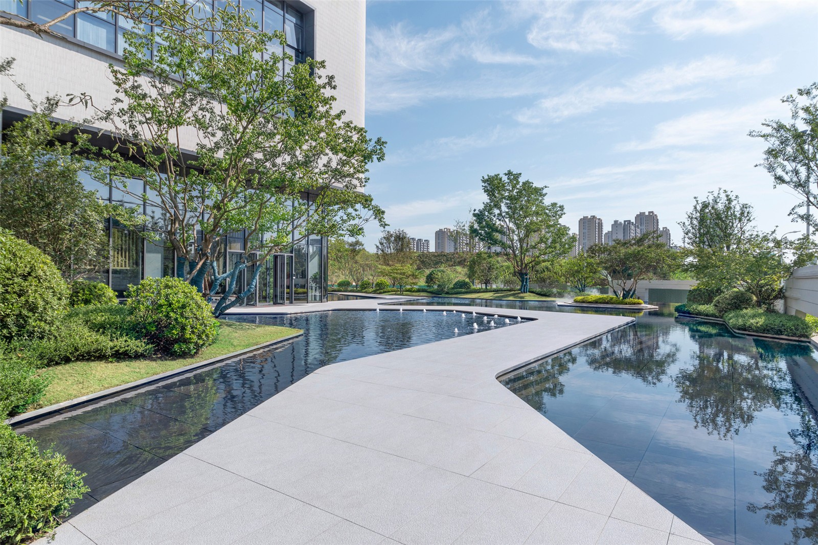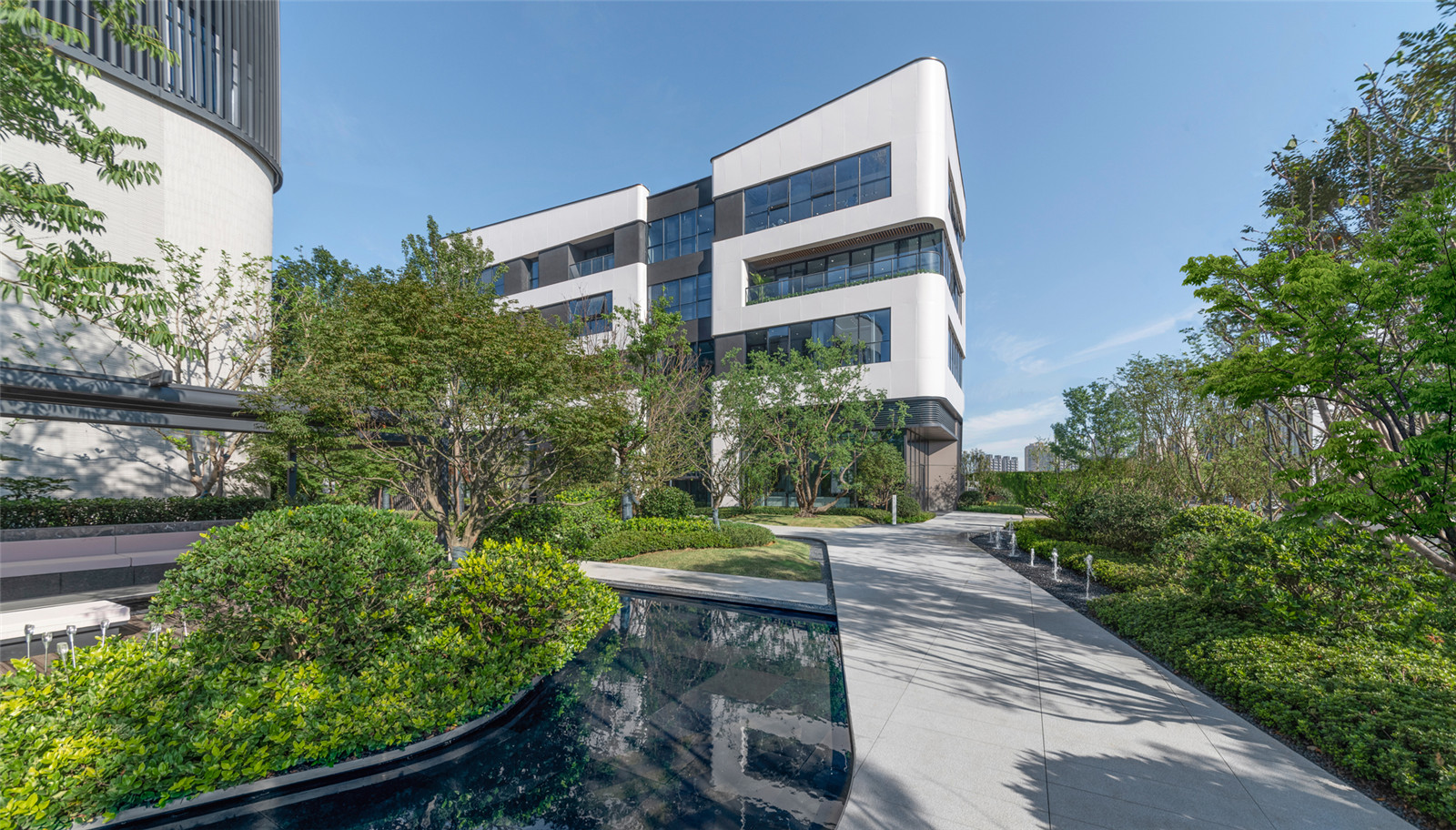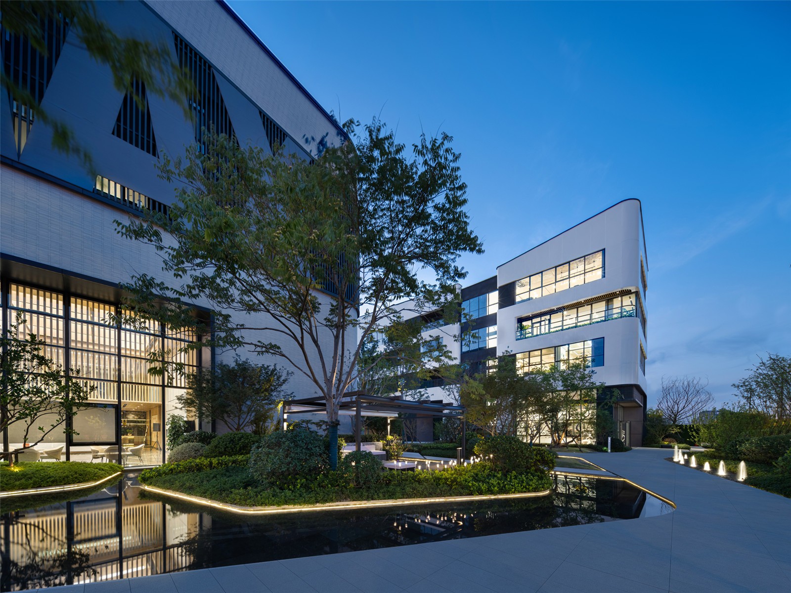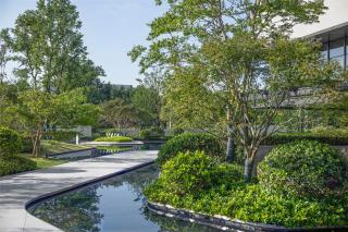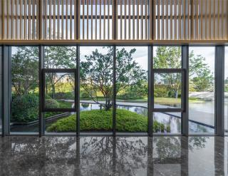招商中心的建筑立面成為景框,窗外的景致自動(dòng)入畫,層次豐富的植物倒映在平靜的水面上,近景、中景、遠(yuǎn)景,置身其中仿佛被花園環(huán)繞。