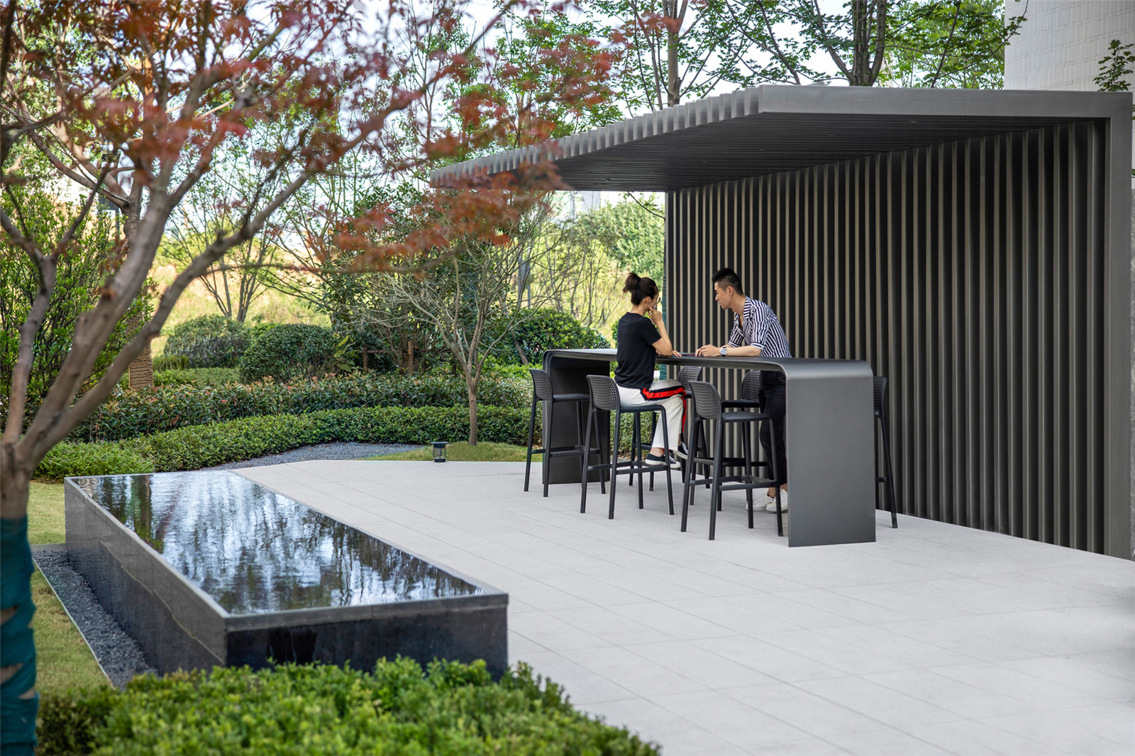 行至道路盡頭處,便有另一番驚喜:寬闊的平臺(tái)坐落在植被的環(huán)抱中,多功能的活動(dòng)場(chǎng)地搭配吧臺(tái)及休憩卡座,形成良好的互動(dòng)氛圍,讓工作在自然里進(jìn)行,讓交流在花園中發(fā)生。這便是未來產(chǎn)業(yè)園區(qū)辦公場(chǎng)景的呈現(xiàn)。