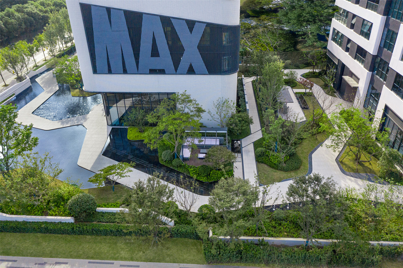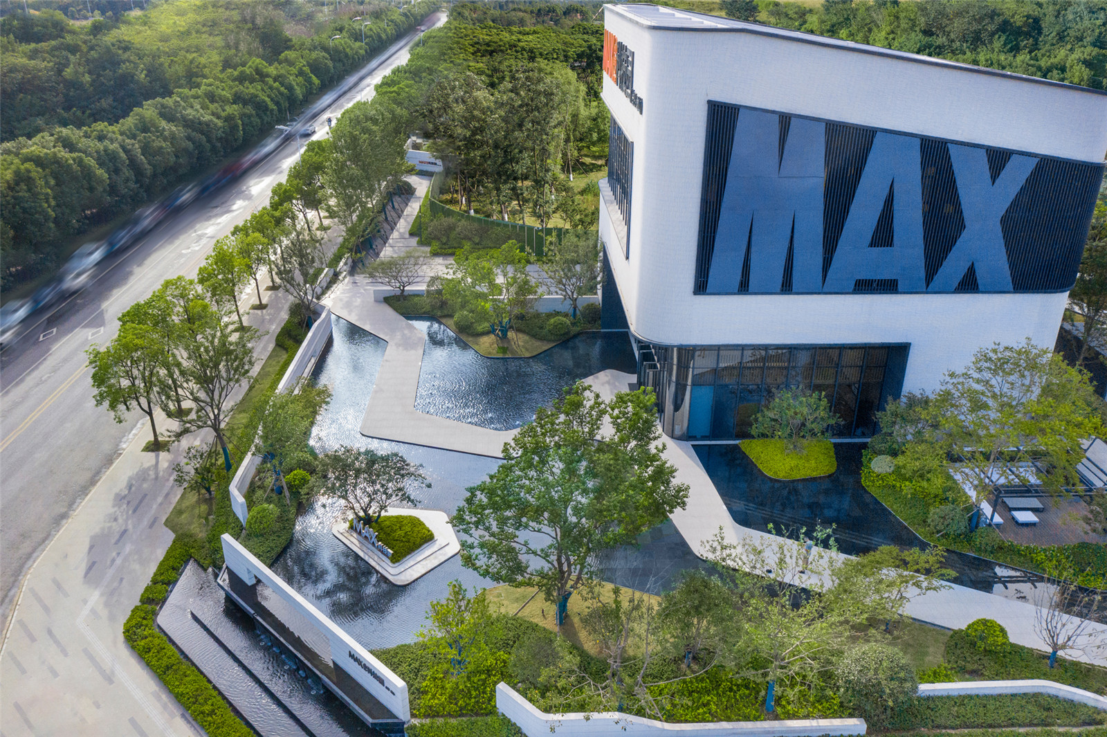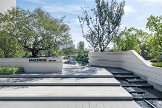 街角的主題水景形成對(duì)MAX科技園的第一認(rèn)知,透空的景墻內(nèi)外相互成景,形成人在景中,亦在畫里的趣味感受。透過窗景可以小窺園中景致,跌水之上的LOGO呈現(xiàn)在框景之中,LOGO后的景致吸引人繼續(xù)前行探索。