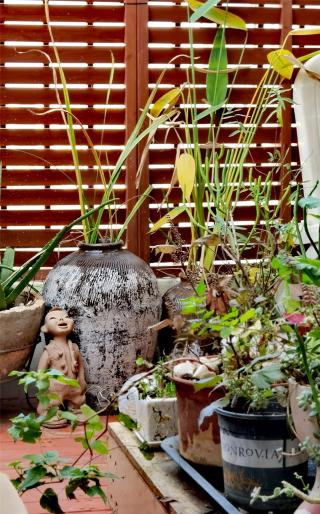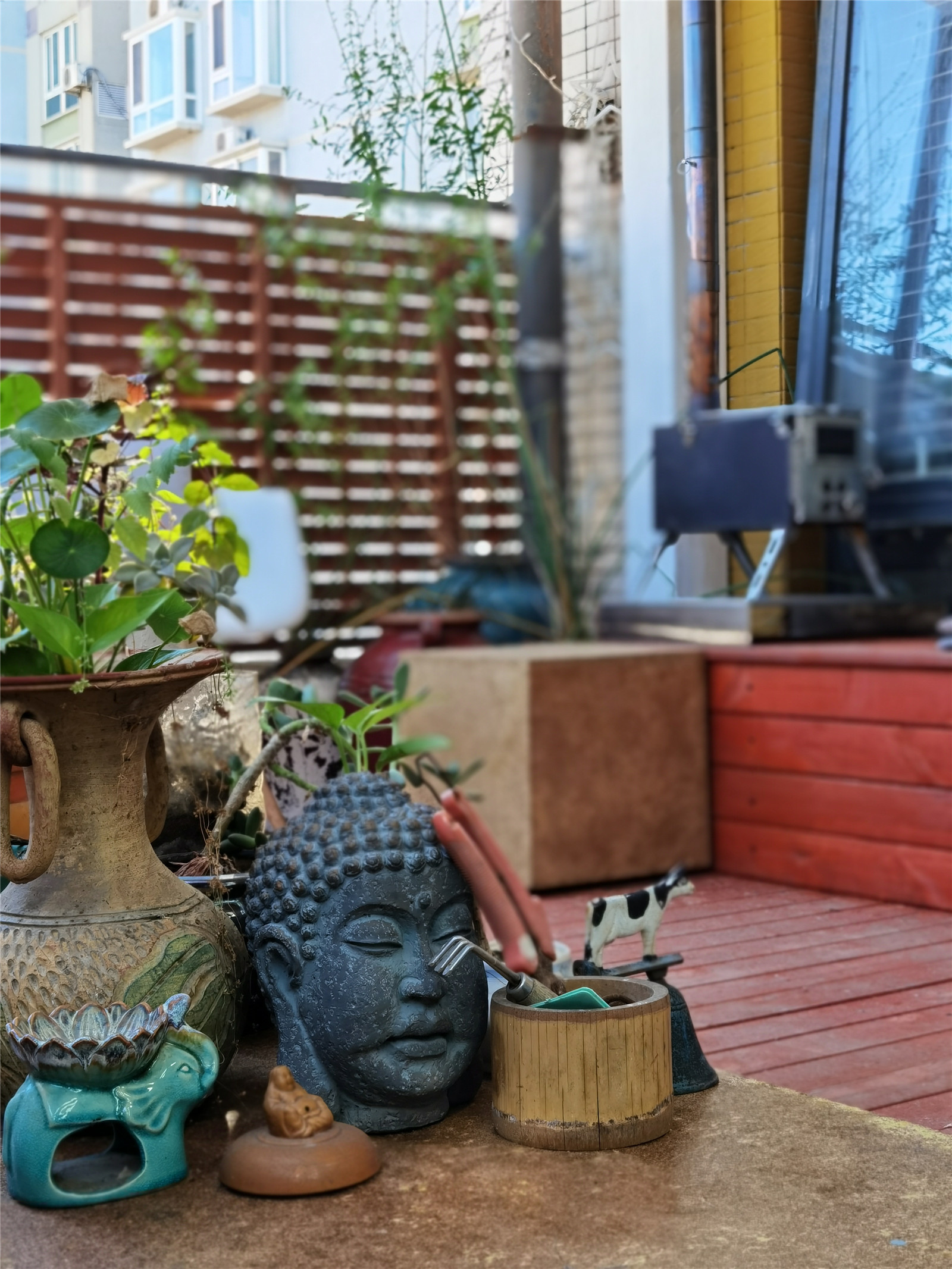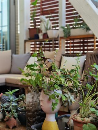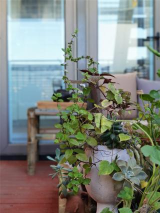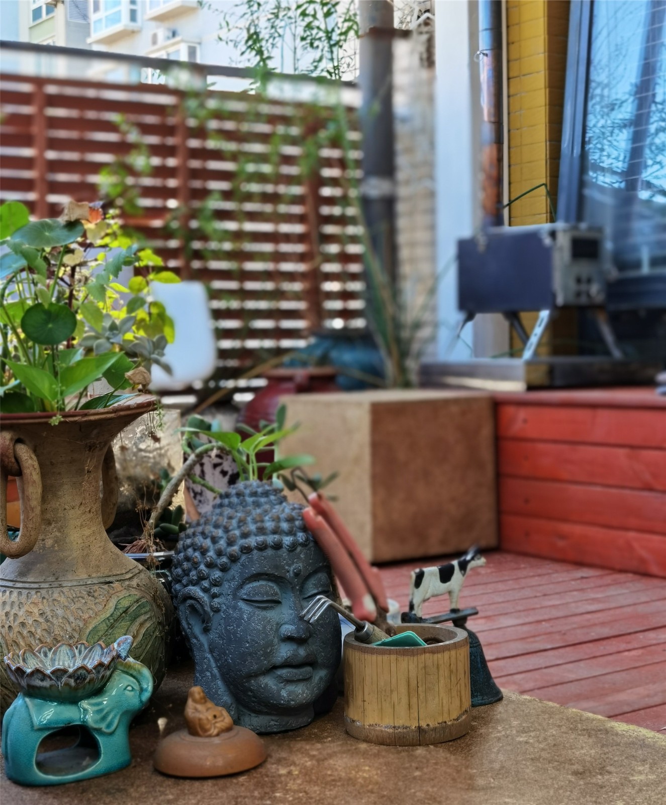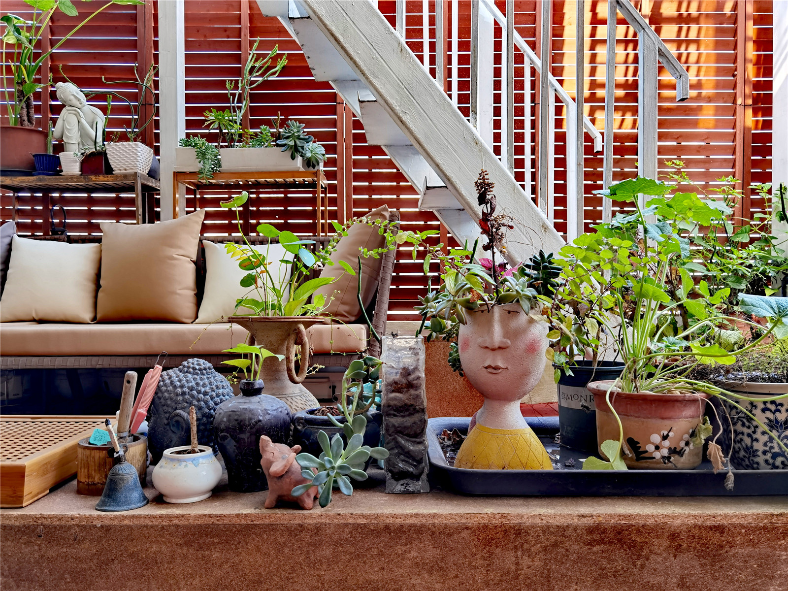 在這次微改造中,小院里除了一組戶外沙發(fā),一個(gè)小竹桌,防風(fēng)木格柵,并沒有添置新的物品,所有花器、桌椅、擺件都是舊年積累的,本著環(huán)保和可持續(xù)發(fā)展的理念,也并沒有選擇一些難以養(yǎng)護(hù)的植物,而是更多的嘗試低維護(hù)的植物,有趣的自然荒野植物,追求城市中人與自然有限的和諧共處。