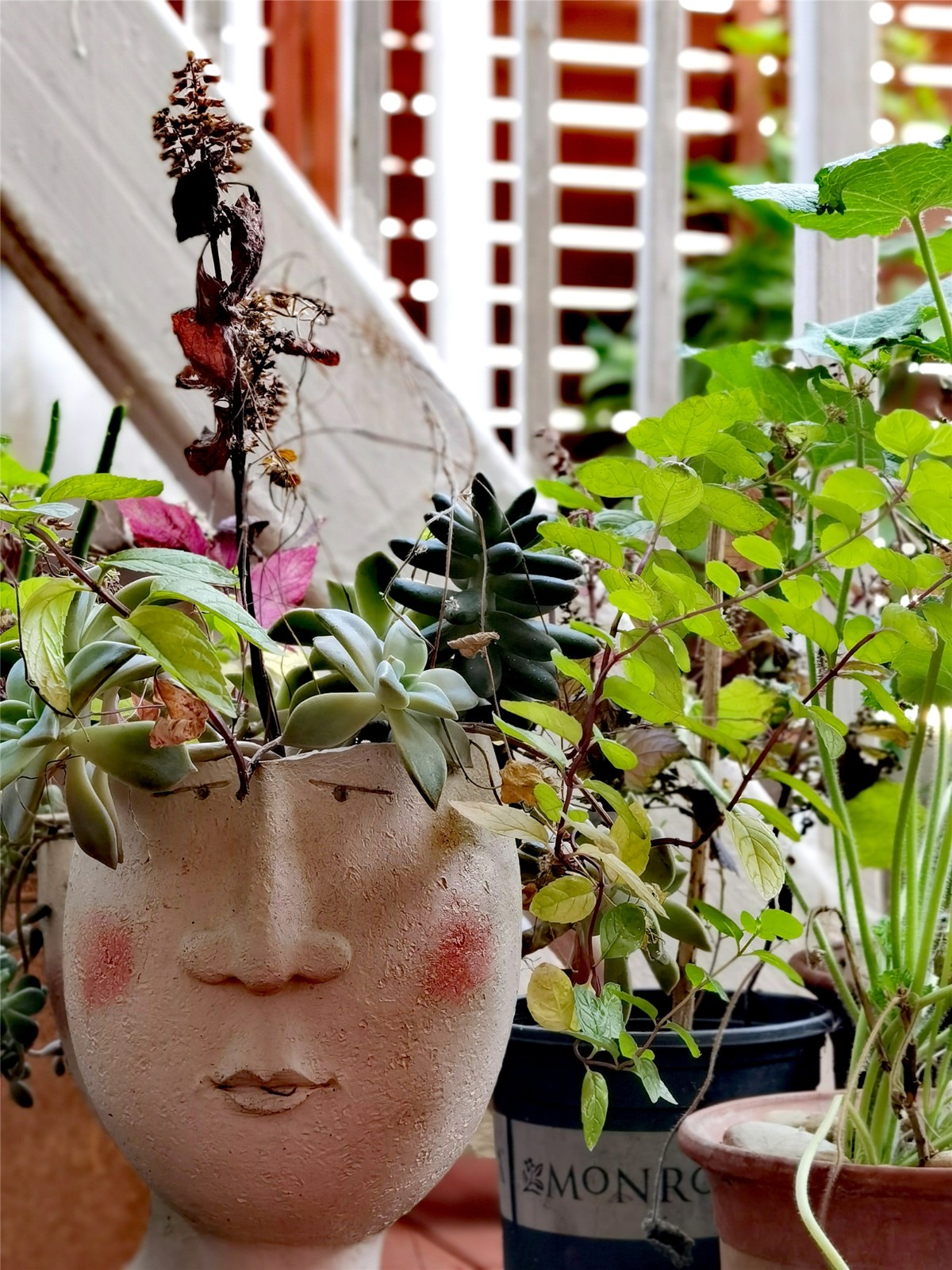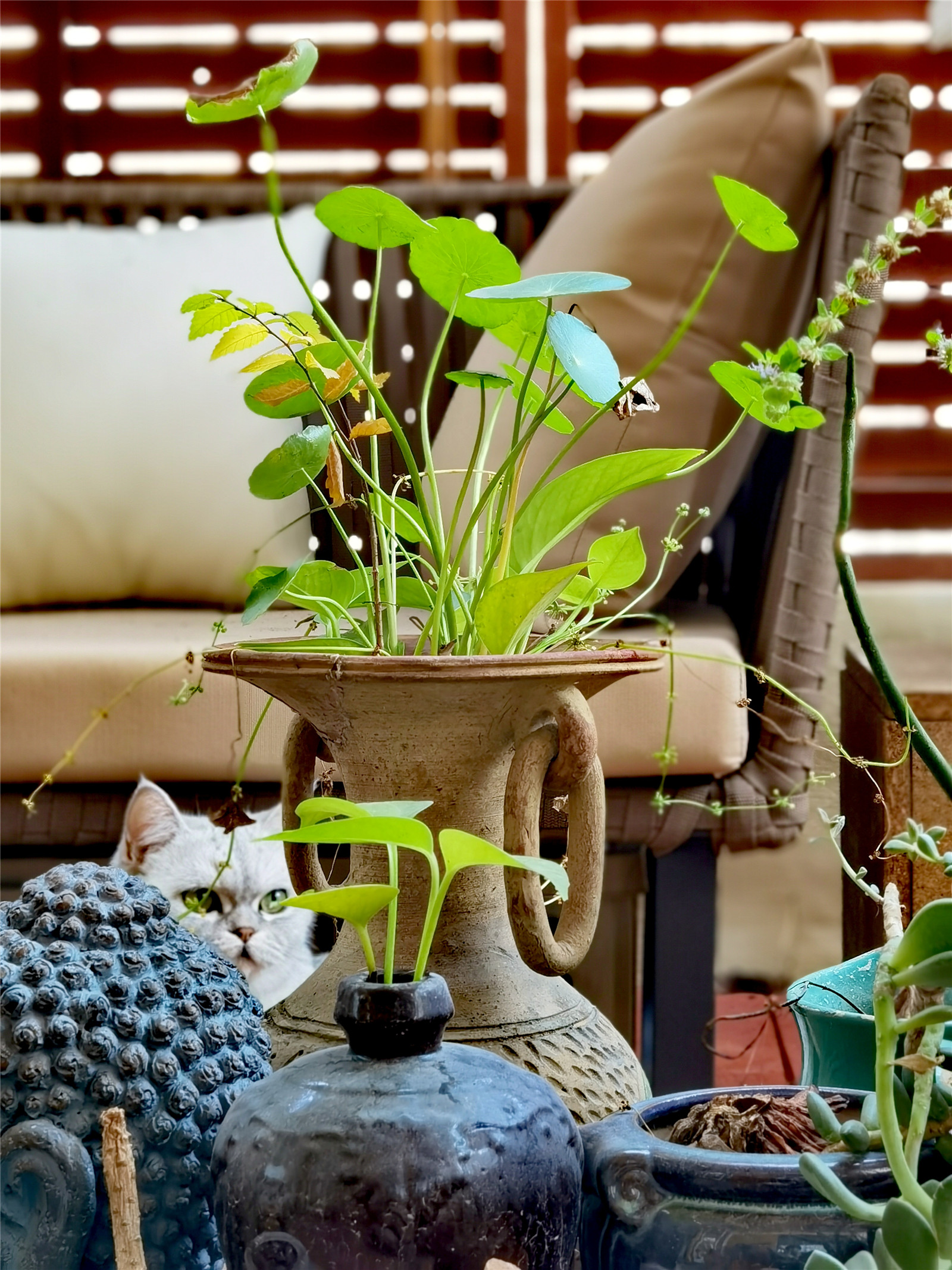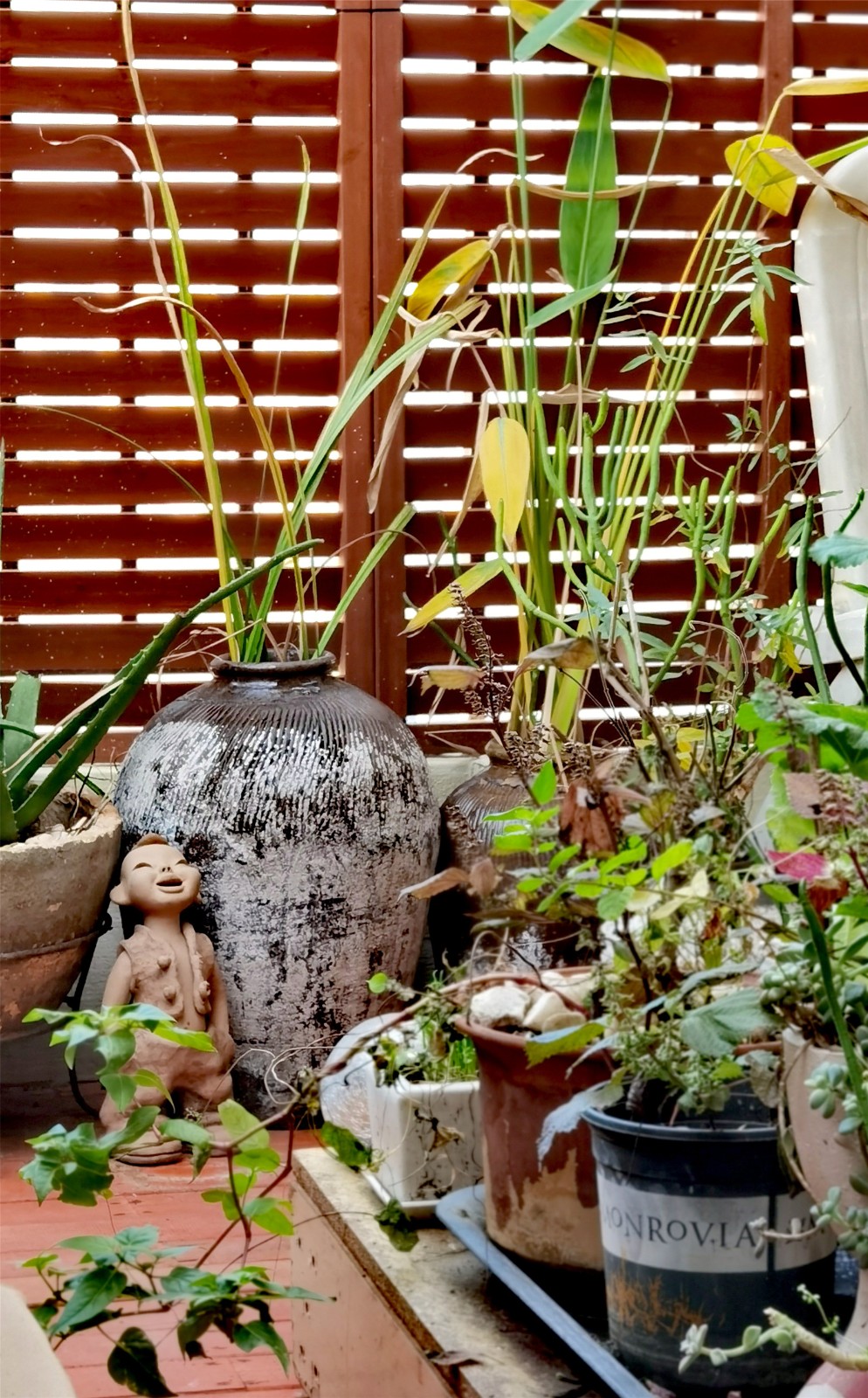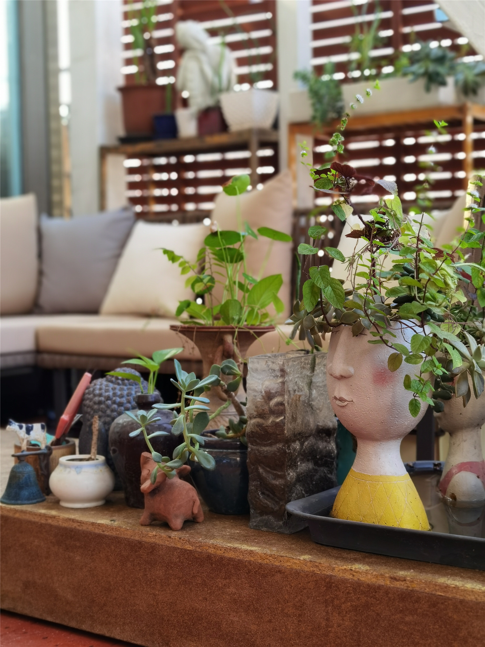 在這次微改造中,小院里除了一組戶外沙發(fā),一個(gè)小竹桌,防風(fēng)木格柵,并沒有添置新的物品,所有花器、桌椅、擺件都是舊年積累的,本著環(huán)保和可持續(xù)發(fā)展的理念,也并沒有選擇一些難以養(yǎng)護(hù)的植物,而是更多的嘗試低維護(hù)的植物,有趣的自然荒野植物,追求城市中人與自然有限的和諧共處。